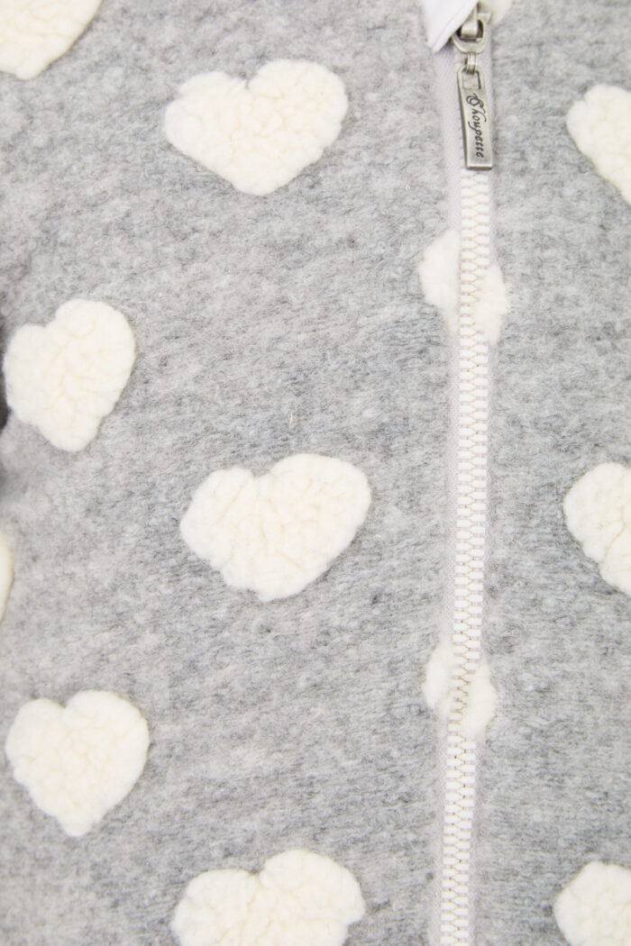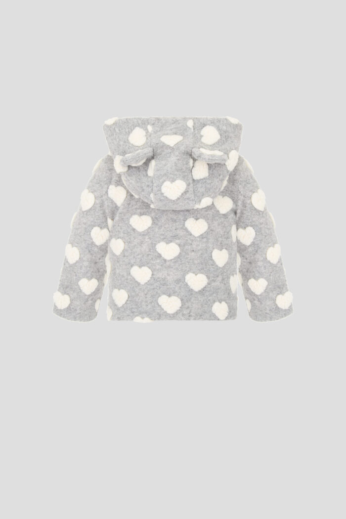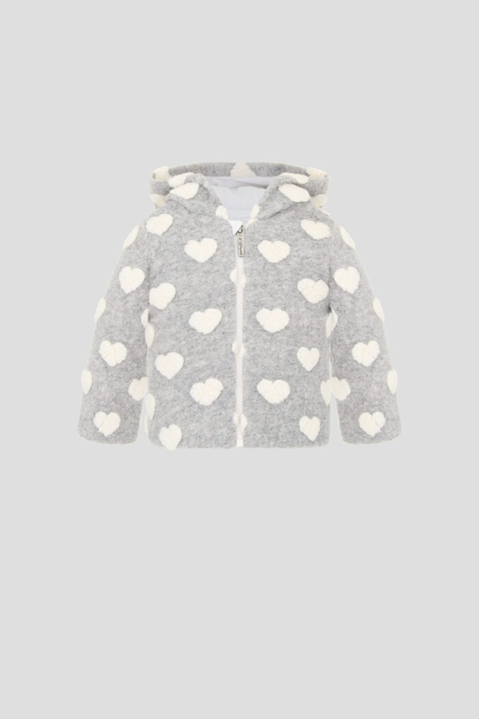 Fashionable bomber jacket made of knitted fabric in gray shade is decorated with a large heart pattern. Comfortable straight silhouette does not restrict movement. The deep hood serves as an additional protection for the child’s head. Cute ears on the hood make the image of the baby adorable. The lining made of natural cotton does not cause allergies to sensitive baby skin. The material is highly breathable, allows the body to breathe and prevents overheating. The jacket fastens with a zipper.