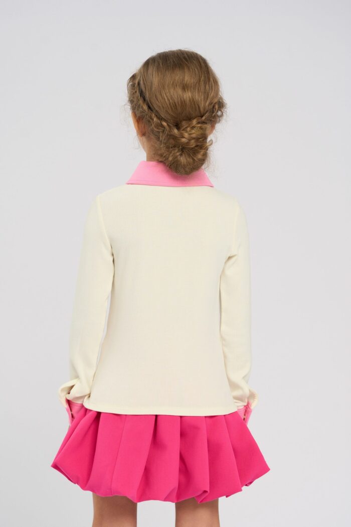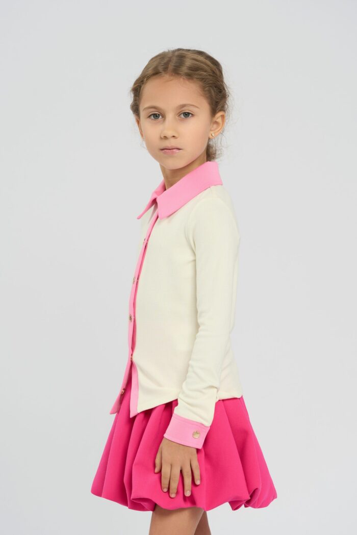 Milk-coloured blouse for girls is made of knitted fabric with “noodle” texture. The model looks elegant thanks to the texture of the fabric. The fastening line, collar and cuffs are made in pink colour, which adds contrast to the look. Gold-tone buttons serve as a spectacular accent. This combination of colours and details makes the garment stylish and versatile for different occasions.