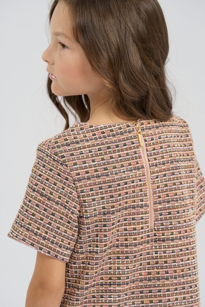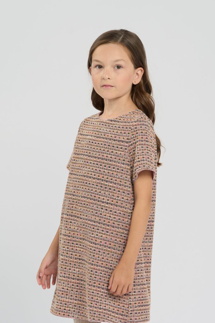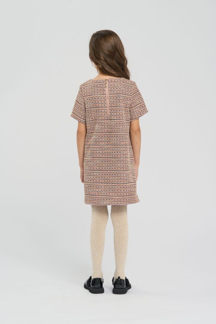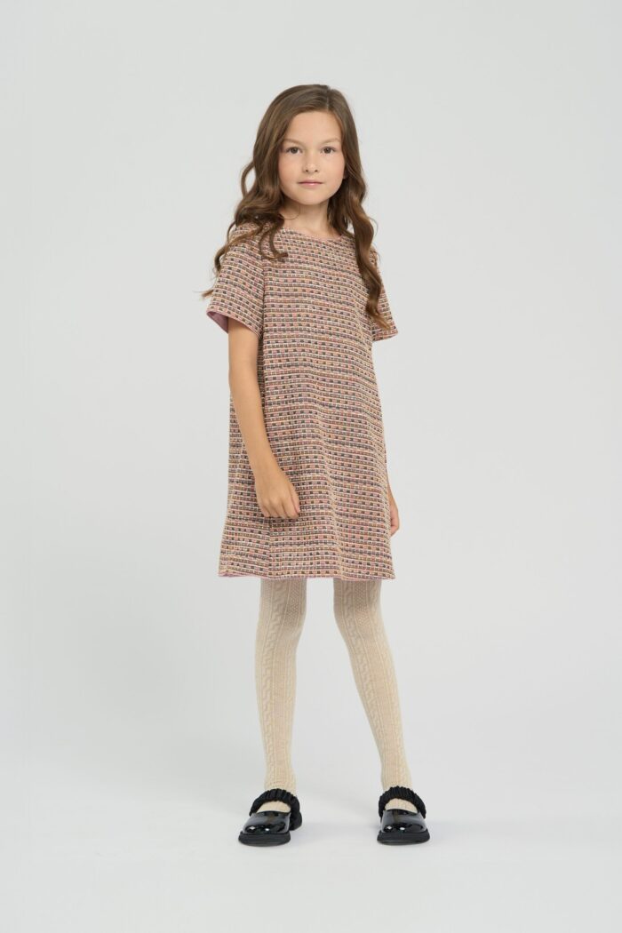 Knitted dress for girls looks very elegant. The model of the silhouette extended downwards does not restrain movements and allows the child to stay active. Textured multicoloured fabric is the main decoration of the laconic design. For convenience, there is a long zip on the back. This model is perfect both for every day and for a festive event. The dress has a lining based on natural cotton.