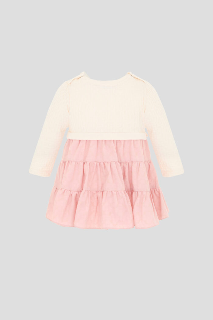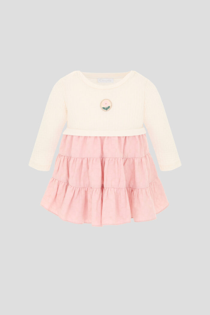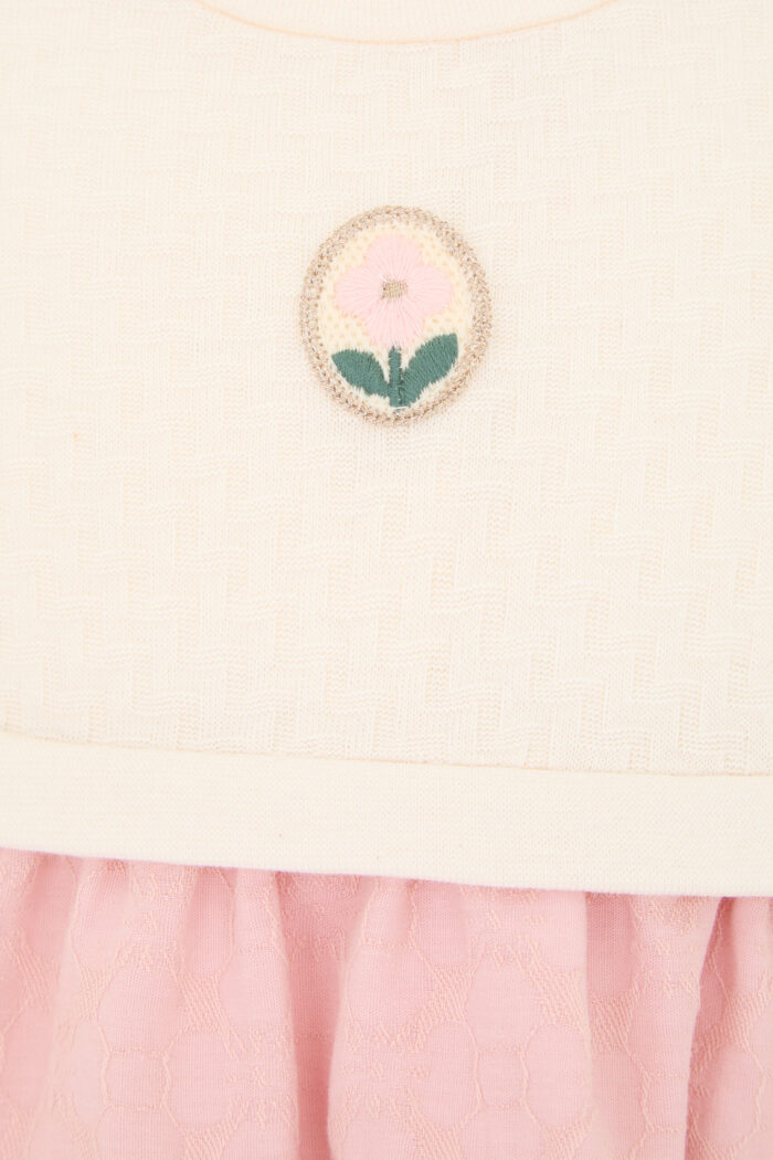 The кnitted dress will harmoniously complete the look of a little girl. The model is made in a beautiful combination of ecru and pink shades. The puffy tiered skirt creates an airy silhouette. The top part of the textured material is decorated with a patch with the image of a flower. Natural cotton is a soft and pleasant to the touch material, ideal for children’s delicate skin. It is highly breathable, allowing the skin to breathe and preventing overheating.