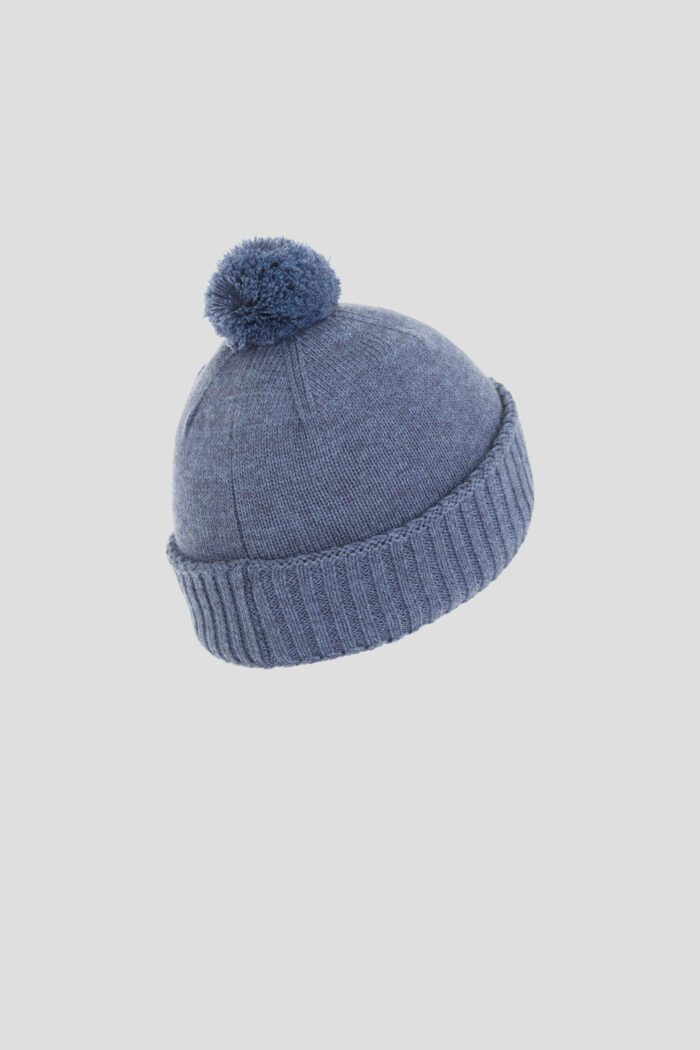 Knitted hat with pom pom for a boy made of soft and warm merino wool yarn. The hat has a classic shape, tightly fitting the head. It provides protection from wind and cold. An amusing fluffy pom pom decorates the design. The embossed knitting at the hem creates an interesting visual effect. The merino wool in the yarn has excellent thermoregulation, which keeps warm in cold weather.