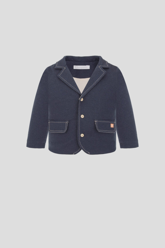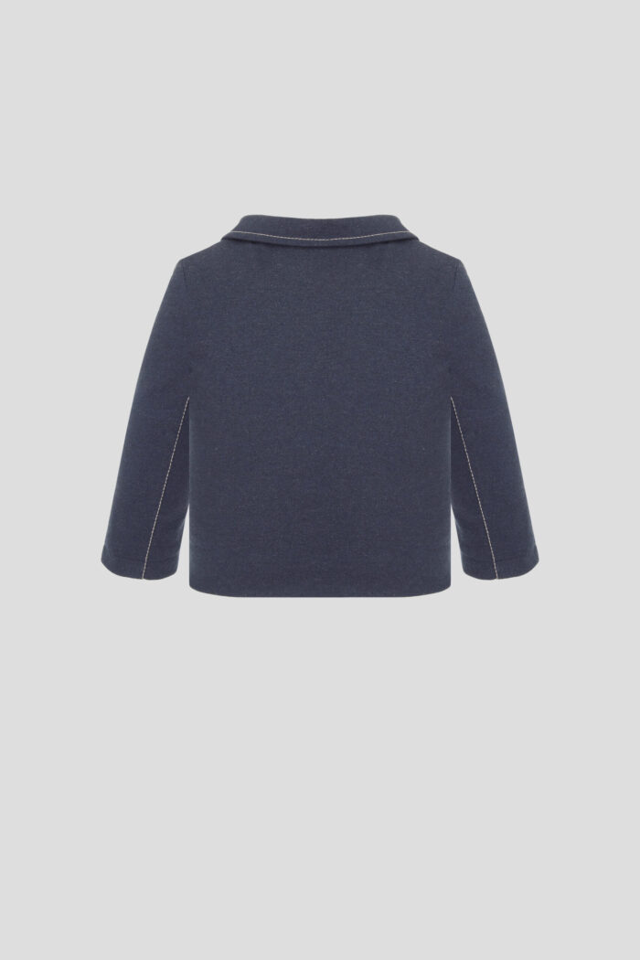 This stylish jacket is the perfect outfit for the little gentleman. The model has a classic fit and basic denim colour. English collar and fake pockets create a strict and cute look. Contrast stitching decorates the design. The model fastens with buttons. Straight loose silhouette and natural cotton lining create comfort for the child.