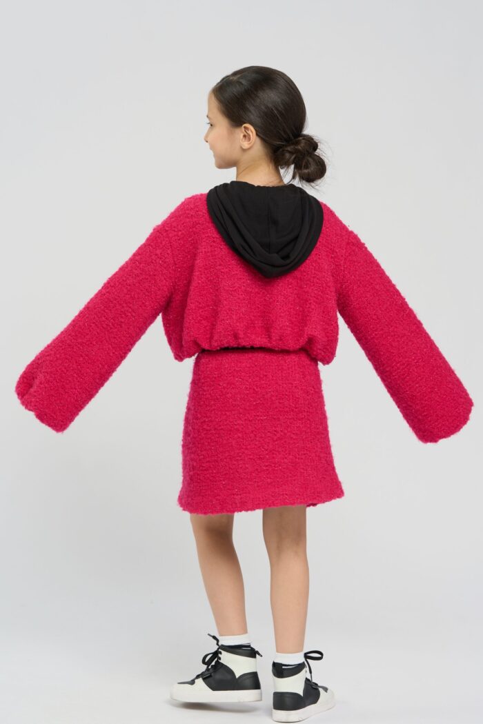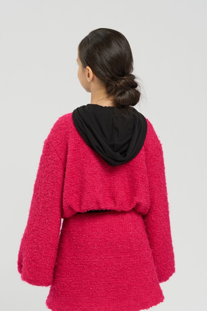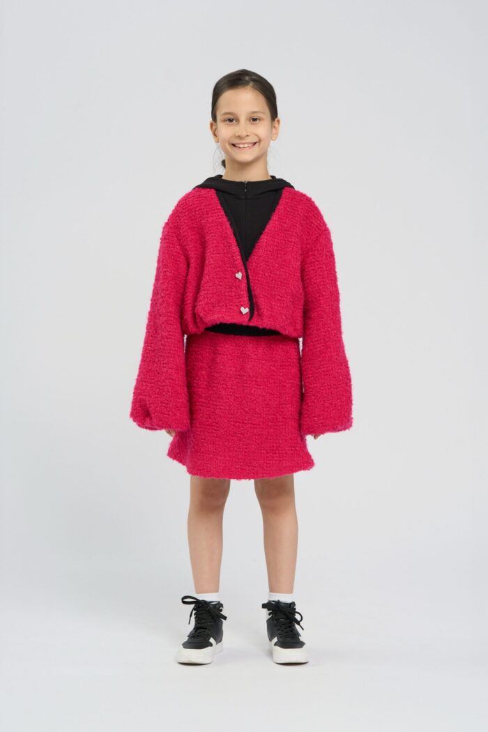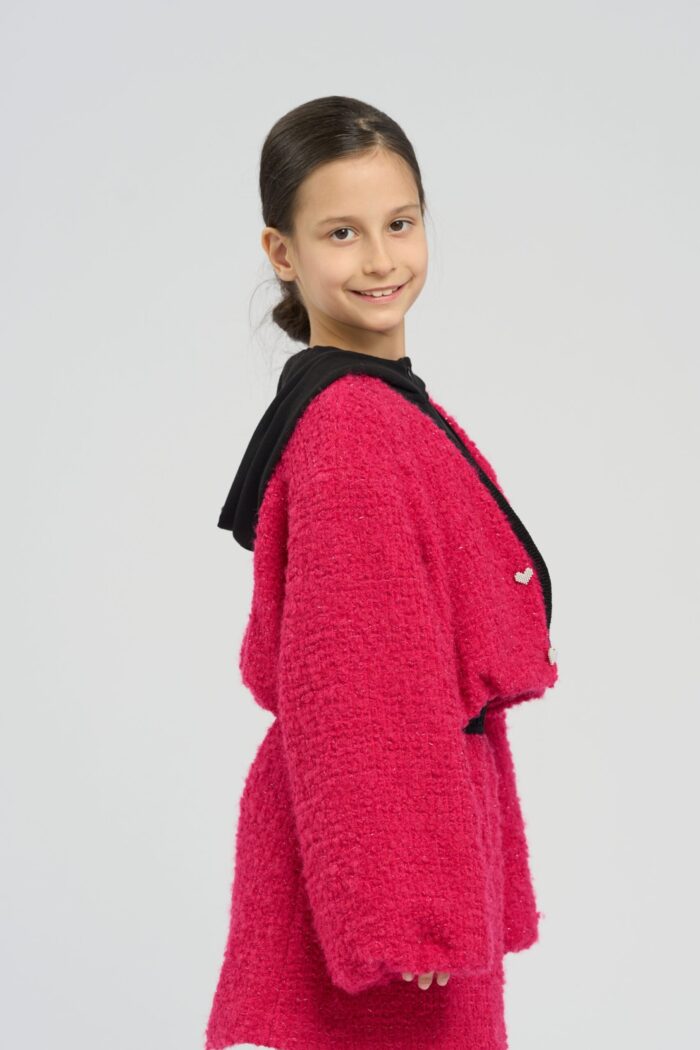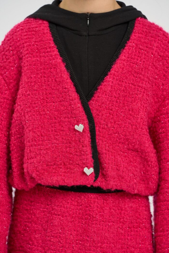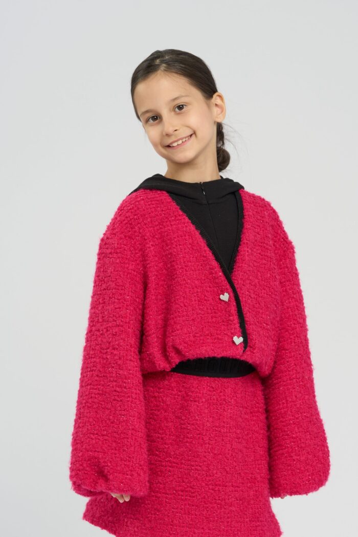 Short jacket made of textured knit fabric, which gives the model volume and interesting texture. Contrast trim at the neckline adds a stylish accent. Heart-shaped buttons add uniqueness and special charm to the model. The shortened cut of the jacket makes it versatile and allows you to easily combine it with any bottom. The spectacular pink colour will be a striking accent.