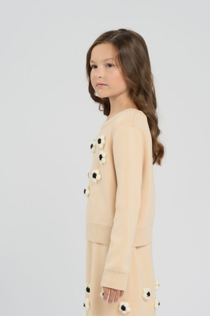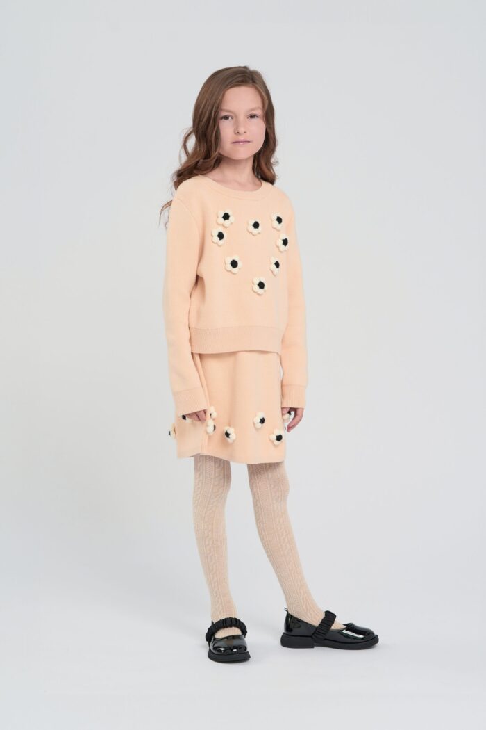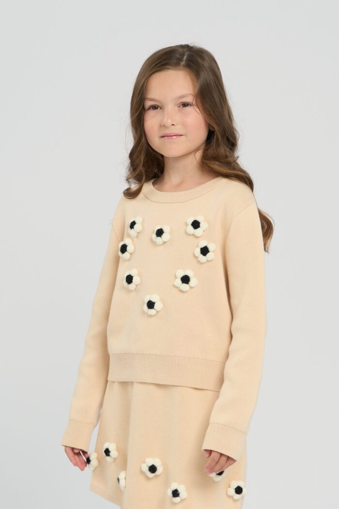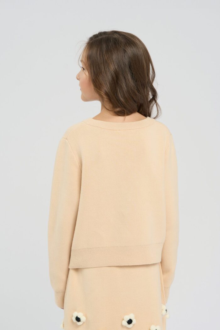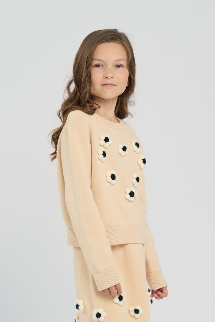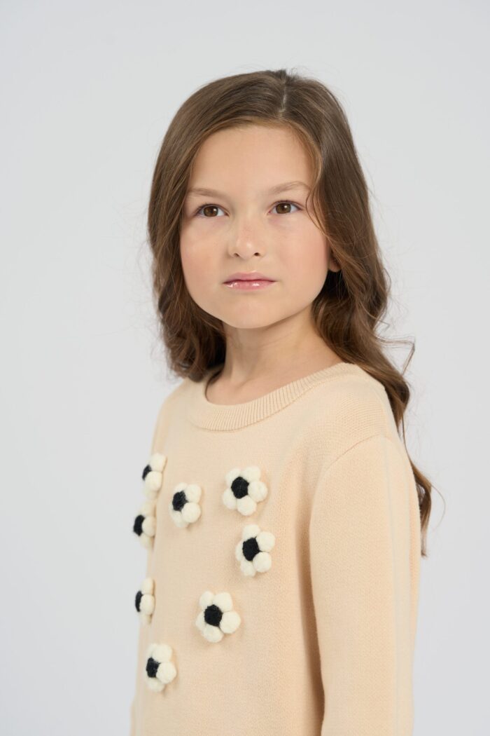 Кnitted jumper for a girl is made of yarn of a beautiful beige shade. The model has an ultra-fashionable and comfortable straight silhouette. The round neckline and bottom are decorated with elasticated edging, which creates a comfortable fit for the child. The main accent of the design – a voluminous decoration in the form of flowers arranged in the shape of a heart – adds romanticism to the image. Thanks to the basic colour, the jumper can be easily combined with any bottom.