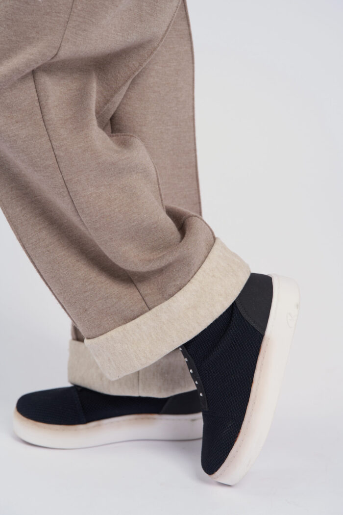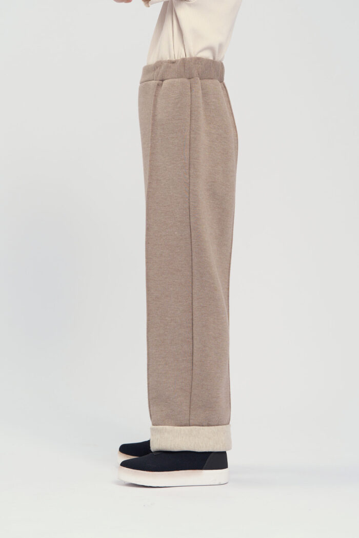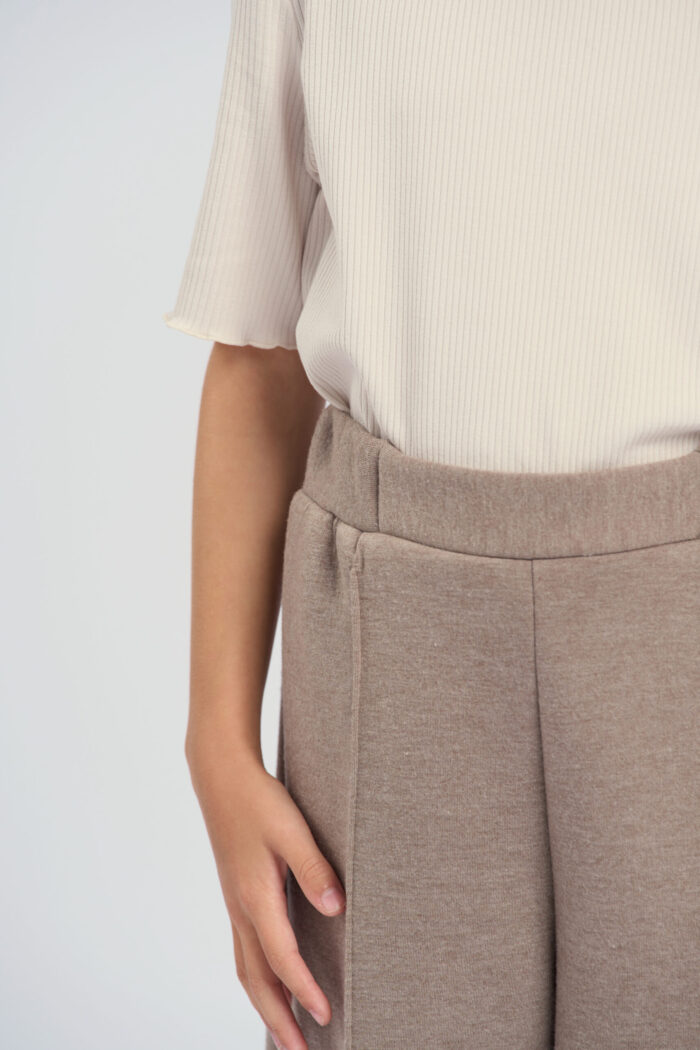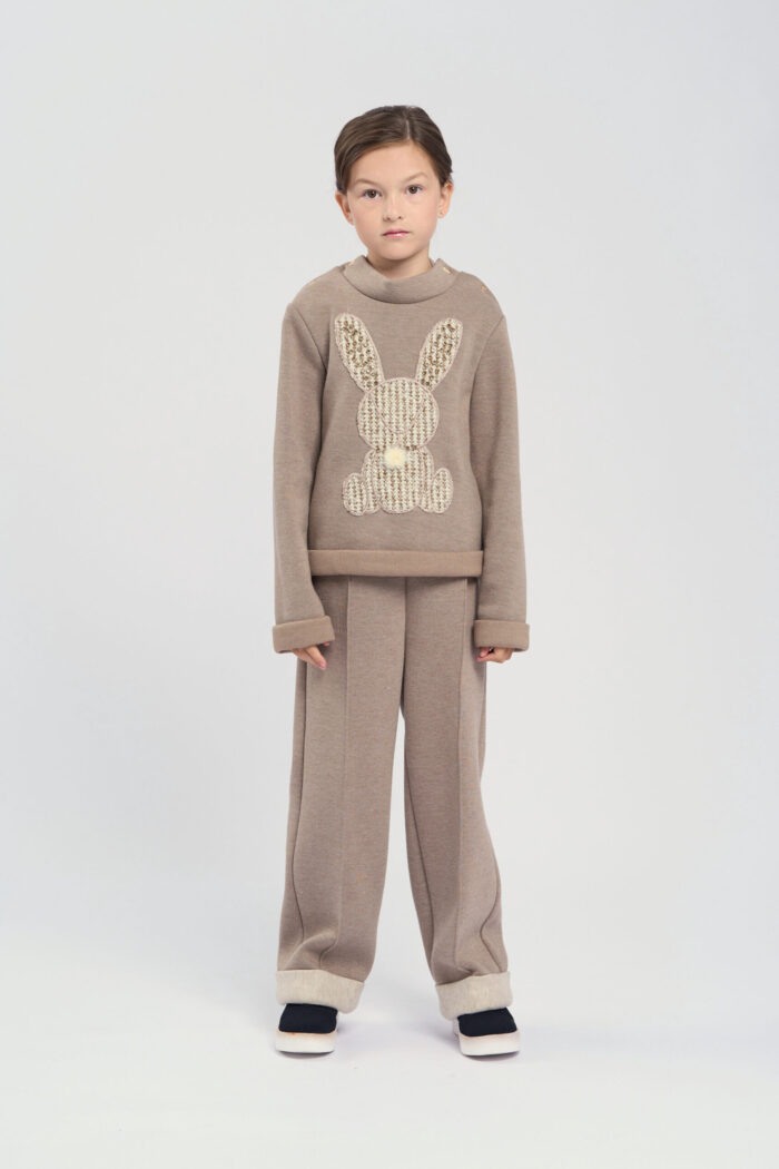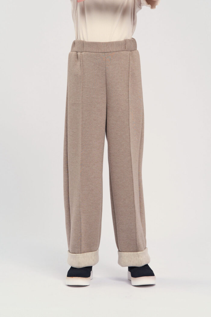 Sand-coloured knitted pants for girls combine comfort and stylish design. The elasticated waistband provides a comfortable fit, allowing the pants to adapt to the figure. Thread stitches add a strict, classic look to the model, giving the silhouette a neatness. The pants can easily be combined with a variety of tops, from casual t-shirts to more formal blouses.