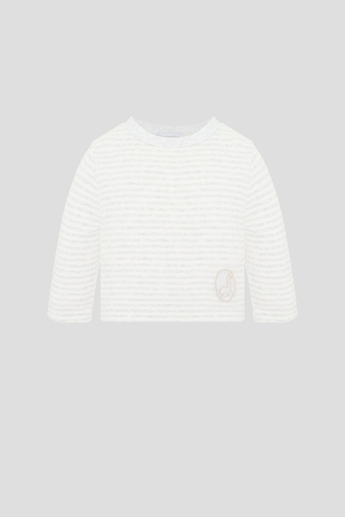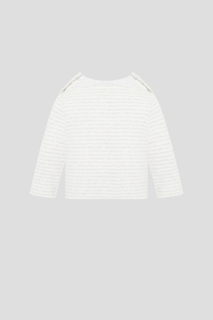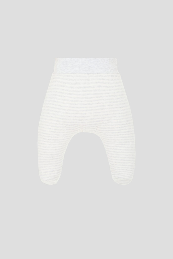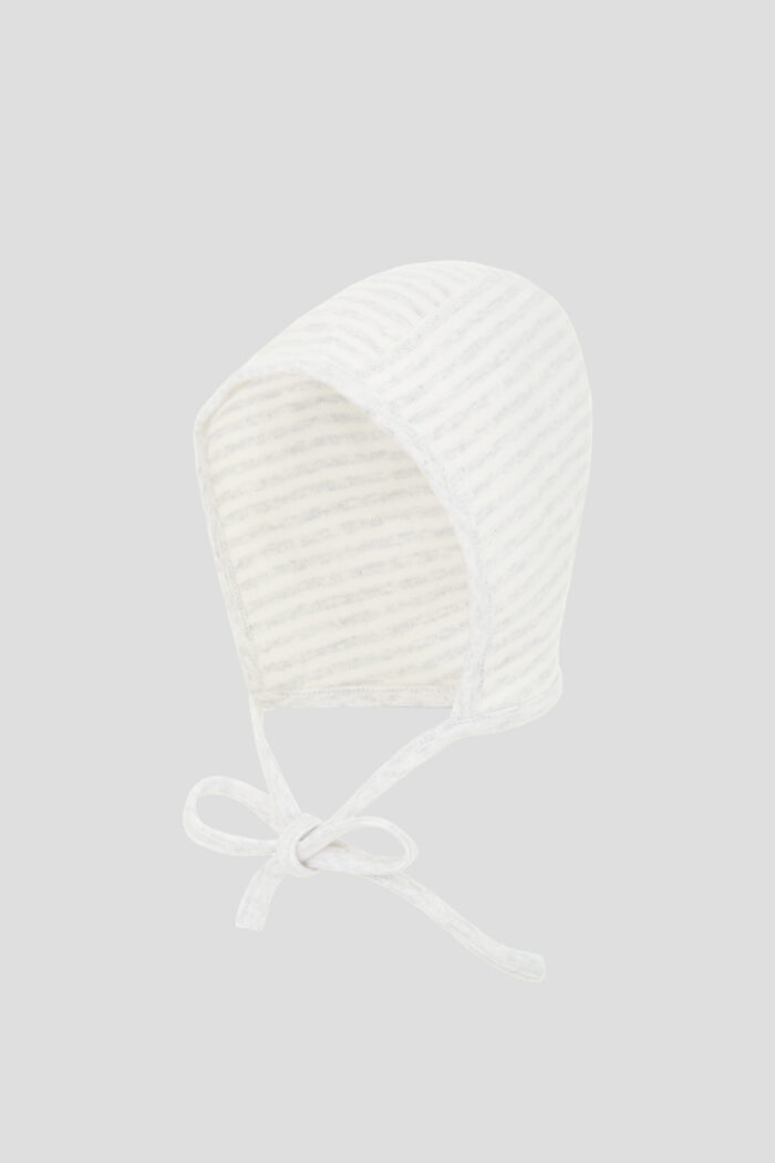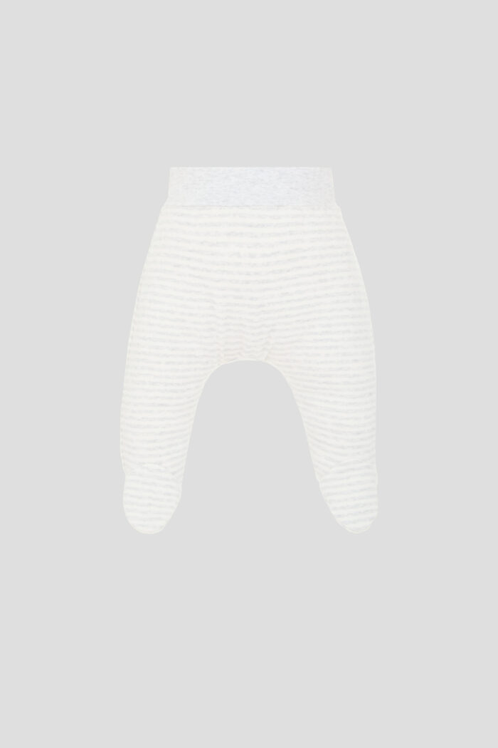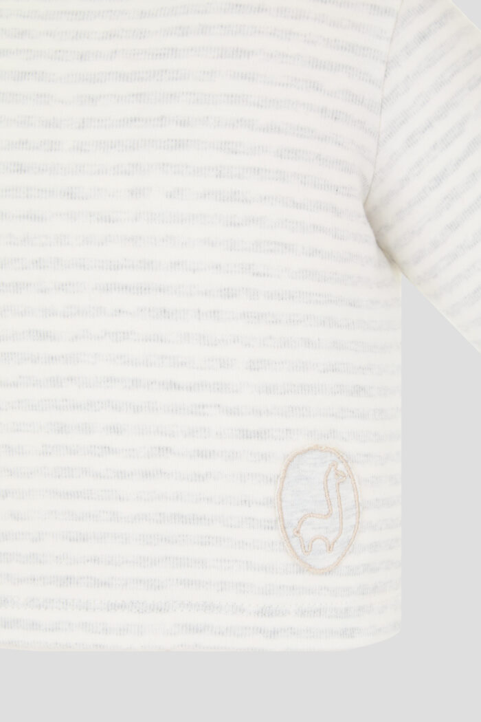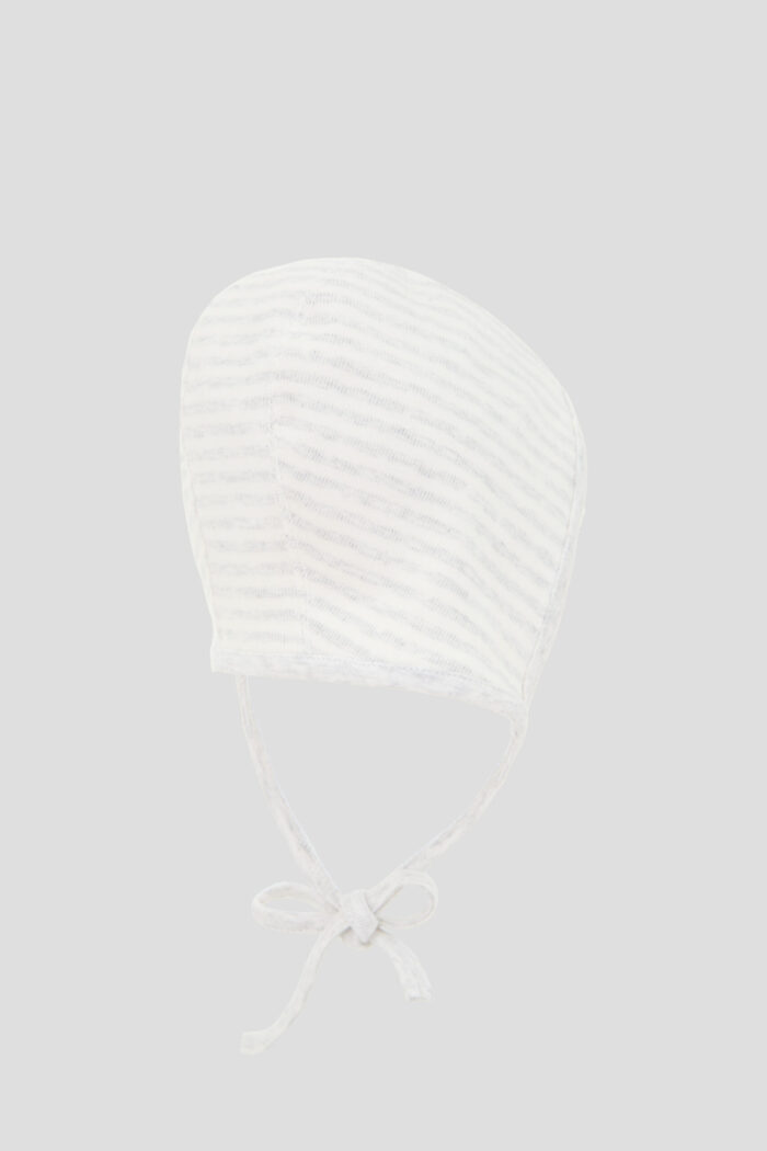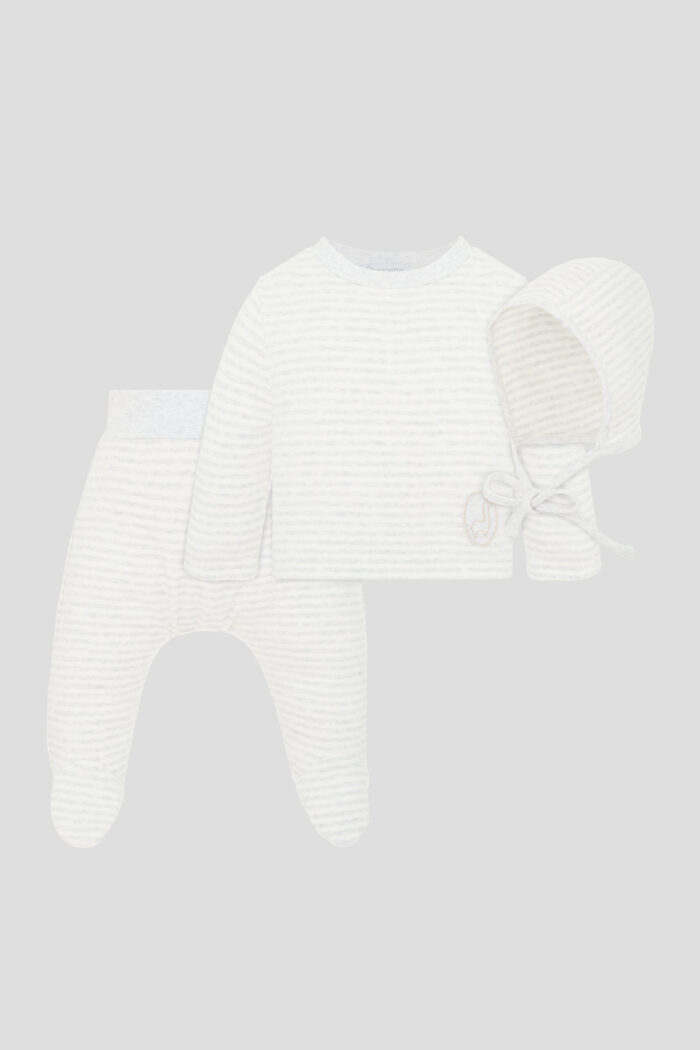 Set of sweater, onesie and bonnet is made in a pleasant gray shade and decorated with a striped pattern. The sweater has a round neckline. Buttons located on the shoulders on both sides serve as a fastener. Onesie with a wide comfortable waistband fit perfectly on the figure, do not fall down and do not constrain the baby’s movements. A bonnet with long ties. The predominantly cotton fabric guarantees your baby absolute comfort.