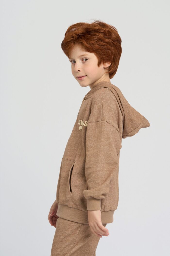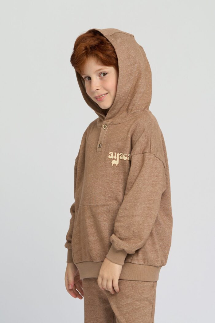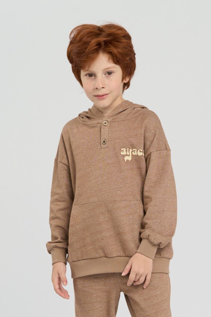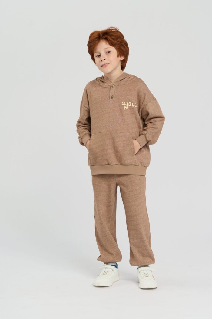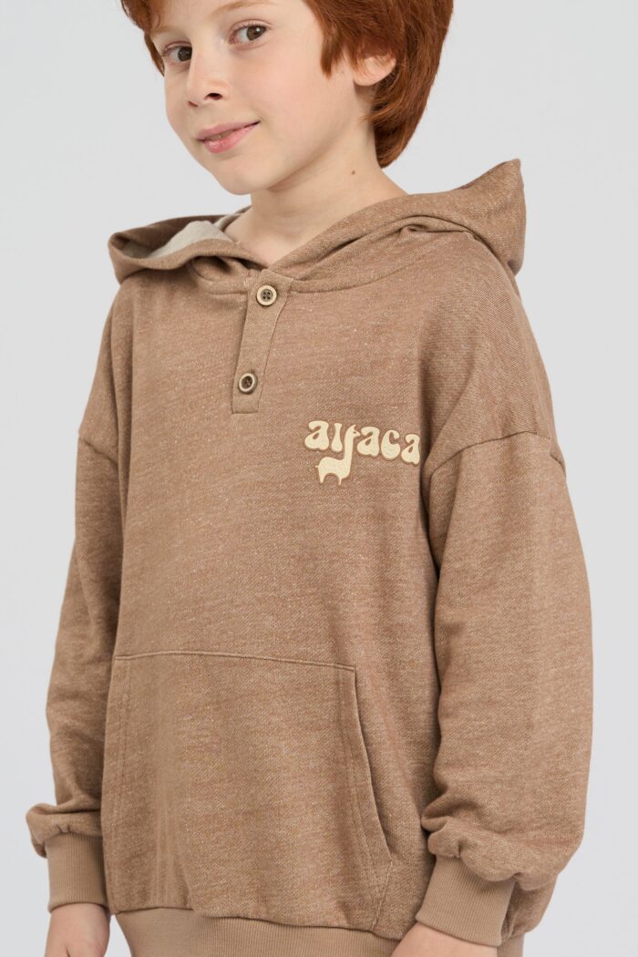 A tracksuit for boys consisting of a hoodie and pants, ideal for active children. The hoodie has a deep hood and two button fastening under the neckline. A kangaroo pocket adds functionality to the hoodie. On the chest there is a decorative element with alpaca image. Comfortable loose silhouette pants with slash pockets on the sides. The natural cotton-based fabric is highly breathable.