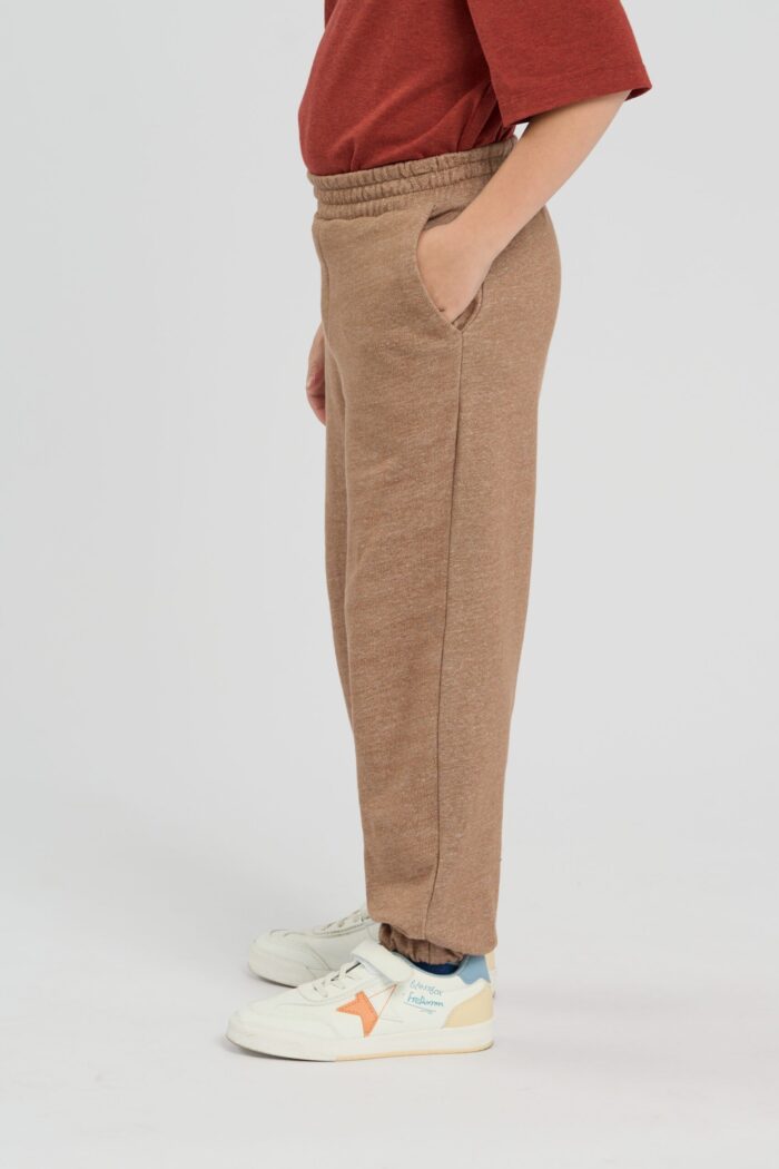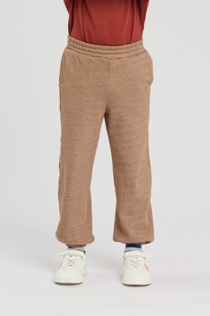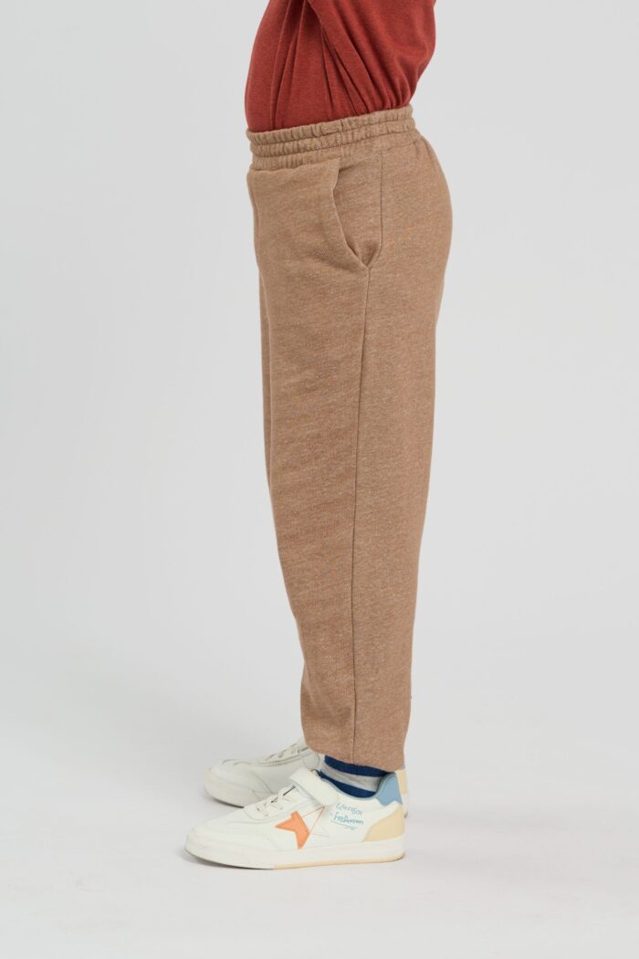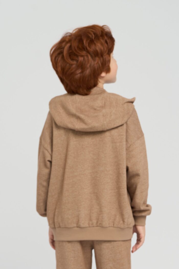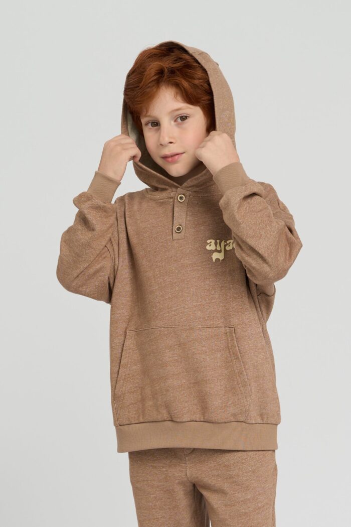A tracksuit for boys consisting of a hoodie and pants, ideal for active children. The hoodie has a deep hood and two button fastening under the neckline. A kangaroo pocket adds functionality to the hoodie. On the chest there is a decorative element with alpaca image. Comfortable loose silhouette pants with slash pockets on the sides. The natural cotton-based fabric is highly breathable.