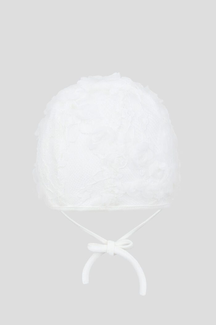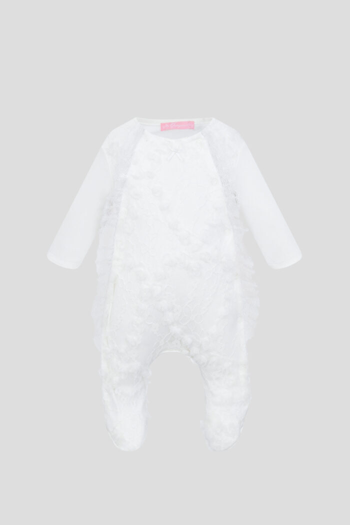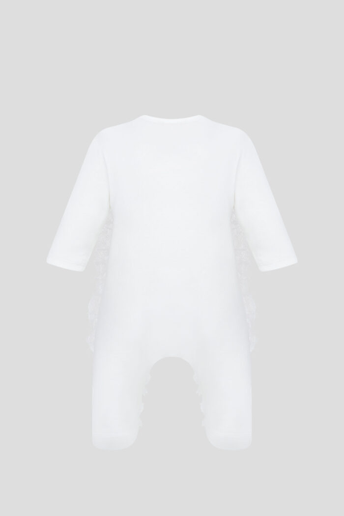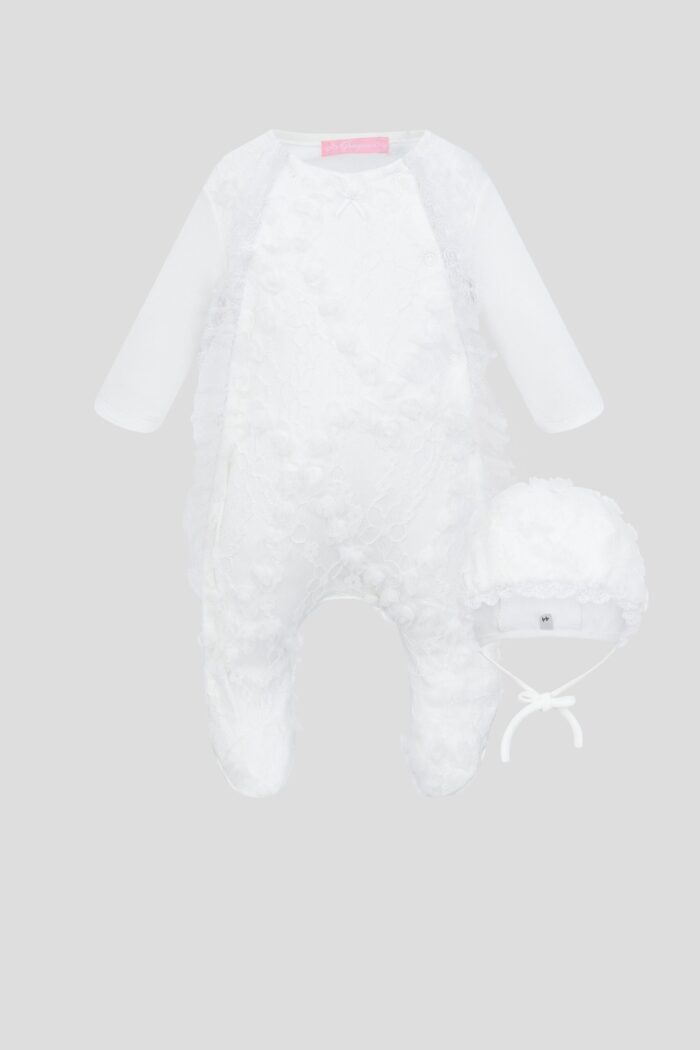 The smart lace romper for girls is made of soft cotton, which is important for a child’s delicate skin. The cotton allows the body to breathe and protects against the cool air. The design is adorned with bows on both sides of the overalls. The textured upper fabric with decorations gave the overalls a smart look. The cap completes the baby’s look and protects her head and ears at the same time.