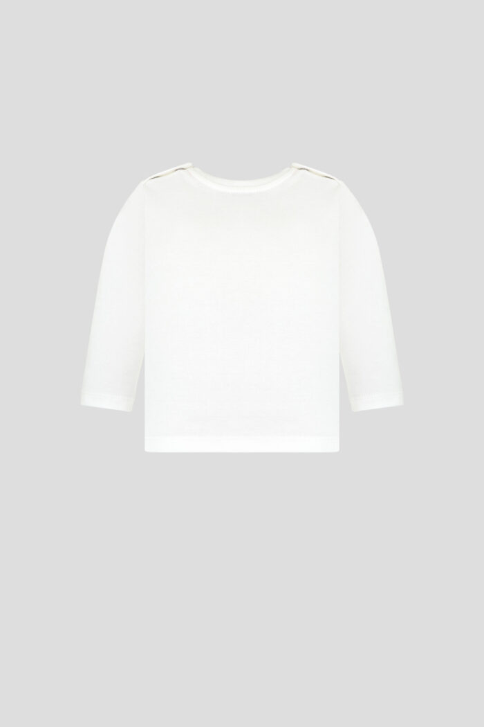 Charming long sleeve T-shirt will fit perfectly into the wardrobe of a little girl. The product is characterised by original decoration in the form of voluminous flowers that add a unique look to it. Thanks to the long sleeves, the model will keep you warm in cool weather and protect you from draughts. The button fastening on the shoulder allows you to easily change your child’s clothes, which is very convenient for active kids. The comfortable straight fit does not restrain movements. The long sleeve T-shirt can be perfectly combined with both dressy skirts and casual pants.