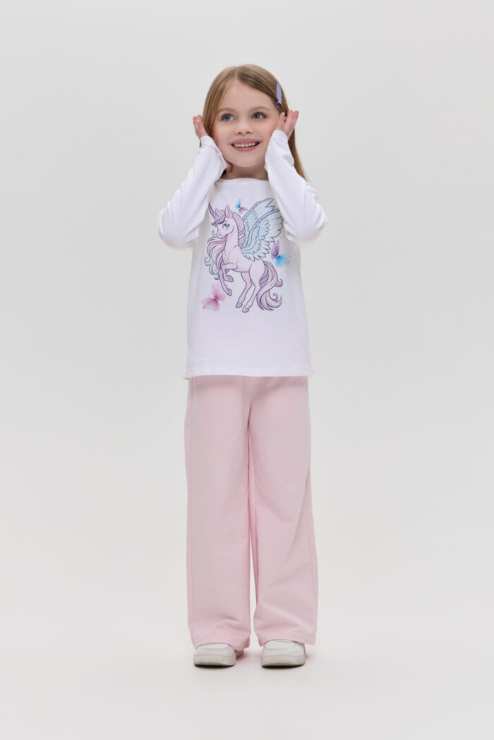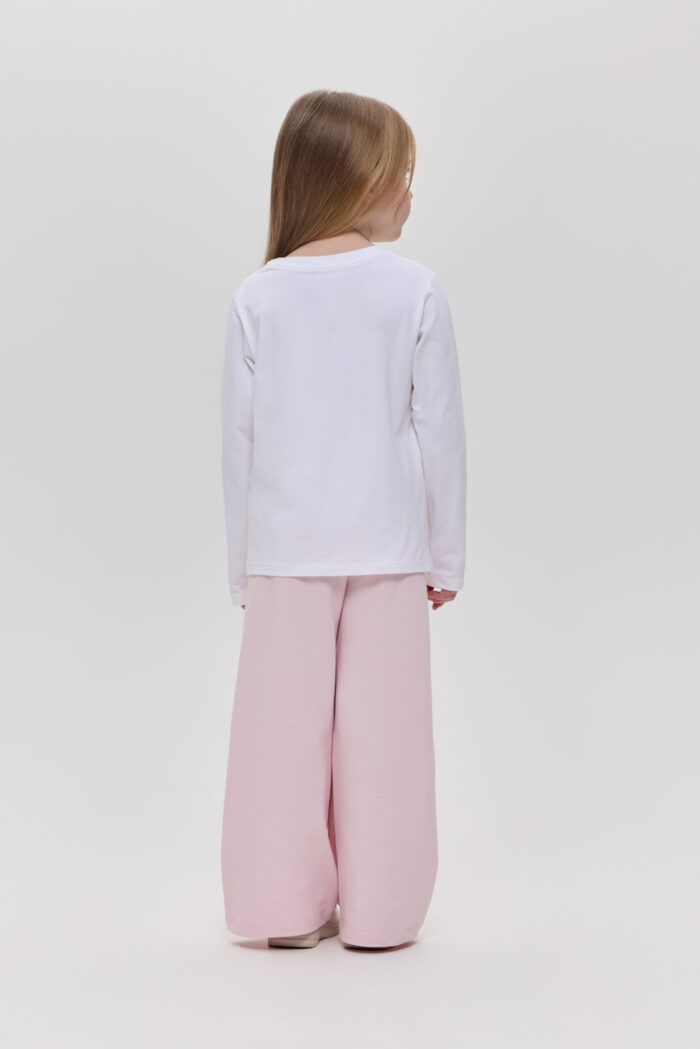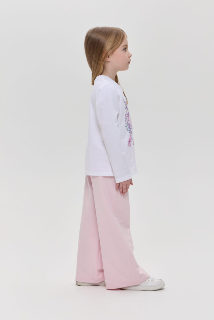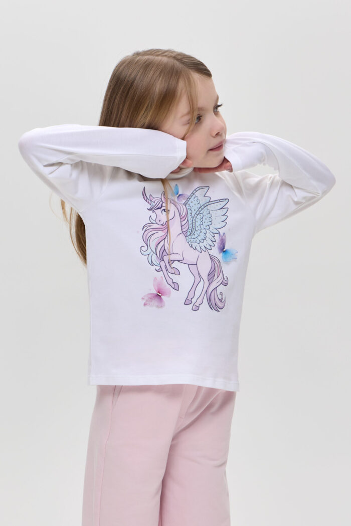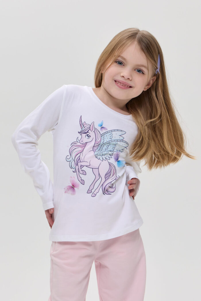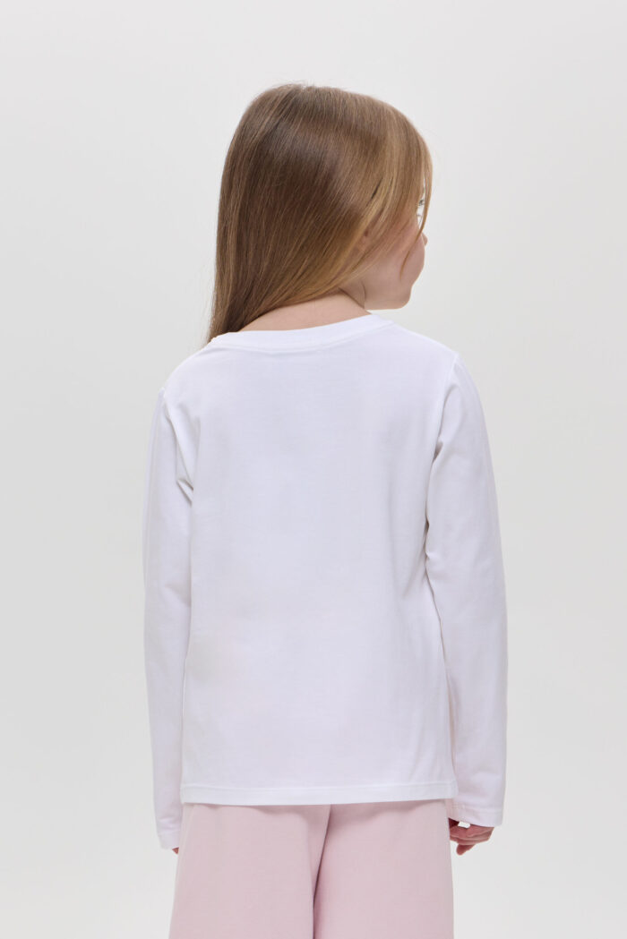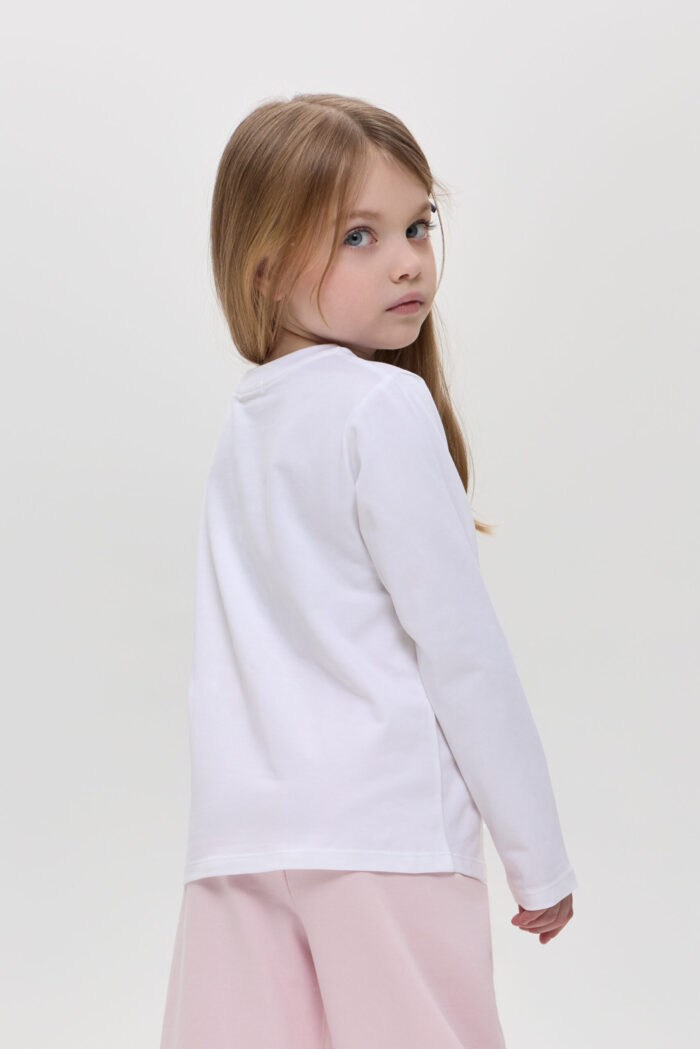 The long sleeve T-shirt with decor for girls is a practical choice for the little fashionista. Made of soft and pleasant to the touch material, it guarantees comfort and wearability. The model of semi-fitted silhouette with long sleeves will be an excellent addition to the spring-summer wardrobe. Accent designer print adds fabulousness to the look, allowing you to use the model for a variety of occasions. Combined with jeans, trousers or skirts, you can create colourful and unusual sets.