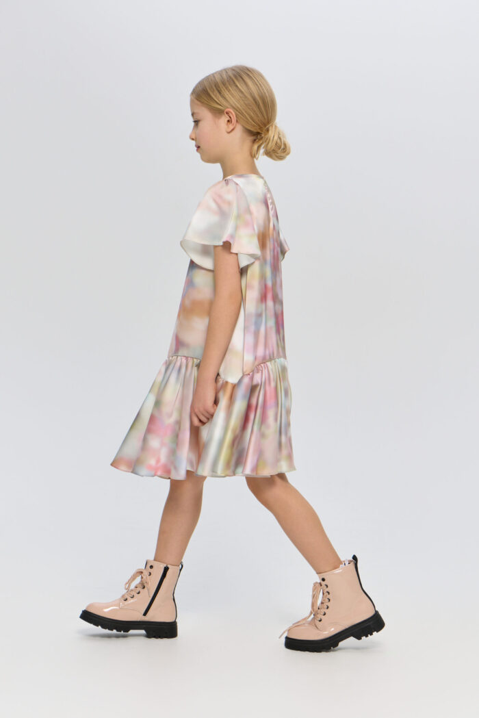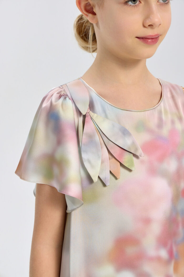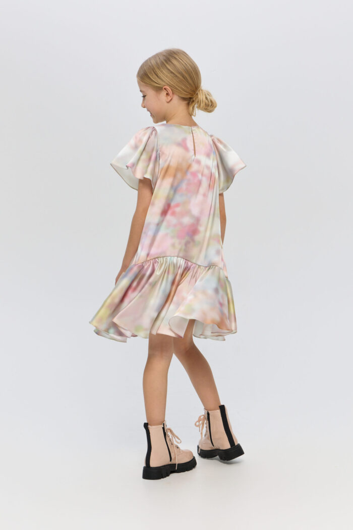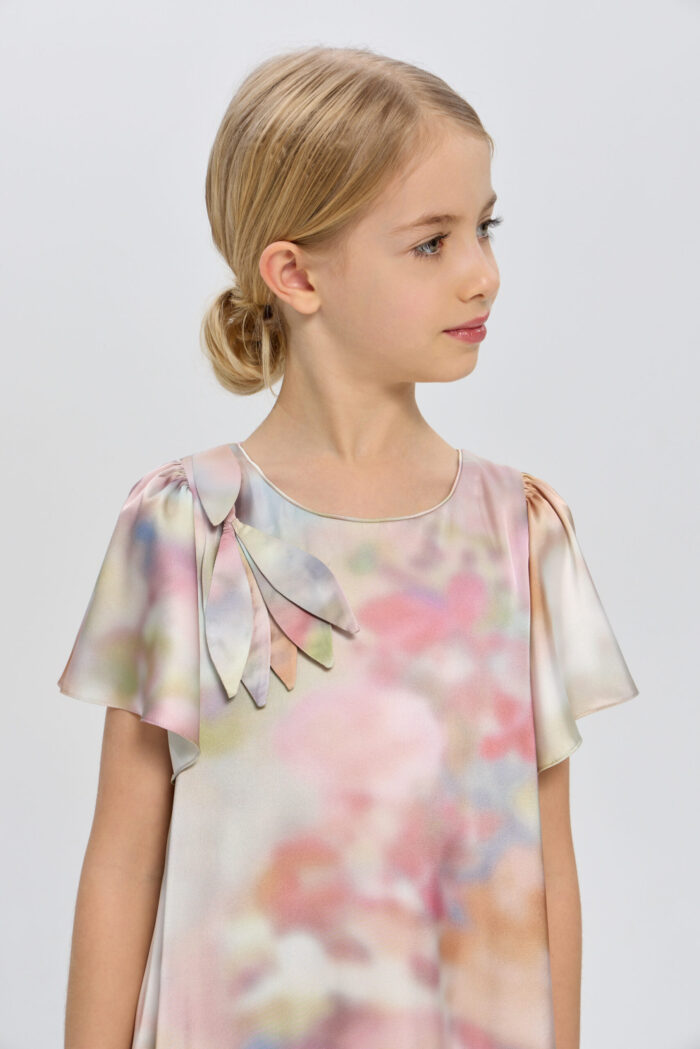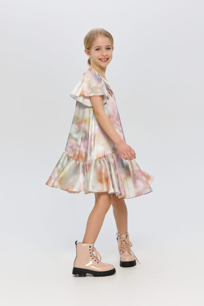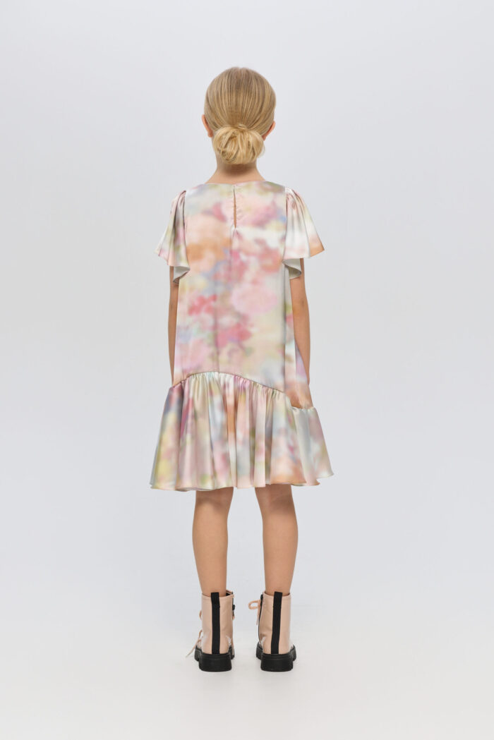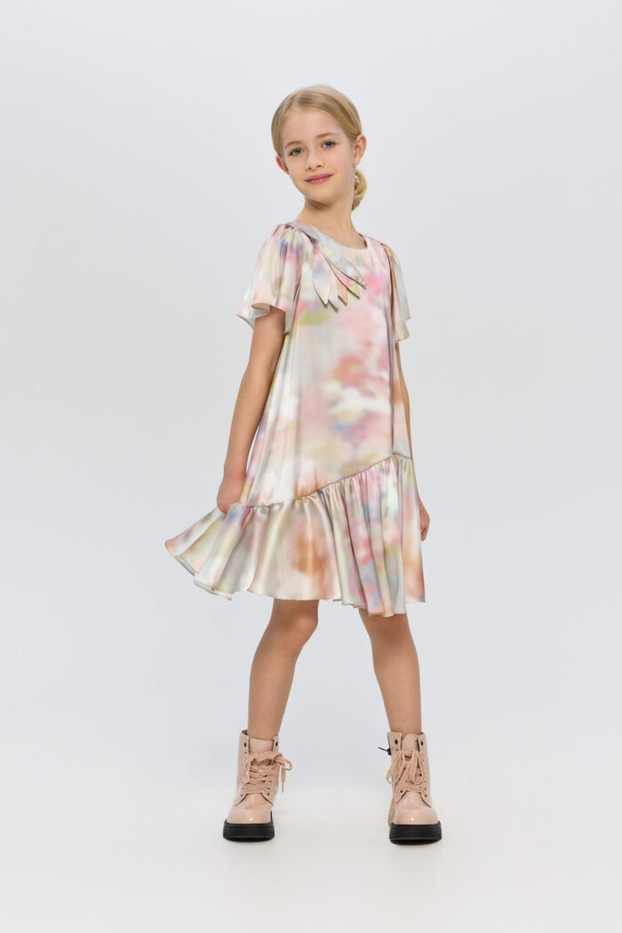 This loose fit dress for girls is perfect for special occasions and everyday outings. The trapeze fit does not constrict movements, and light and breathable material will make your child feel comfortable even in the hottest weather. The bottom of the dress is framed by a wide asymmetric flounce. The voluminous decor attracts attention.