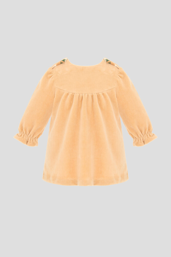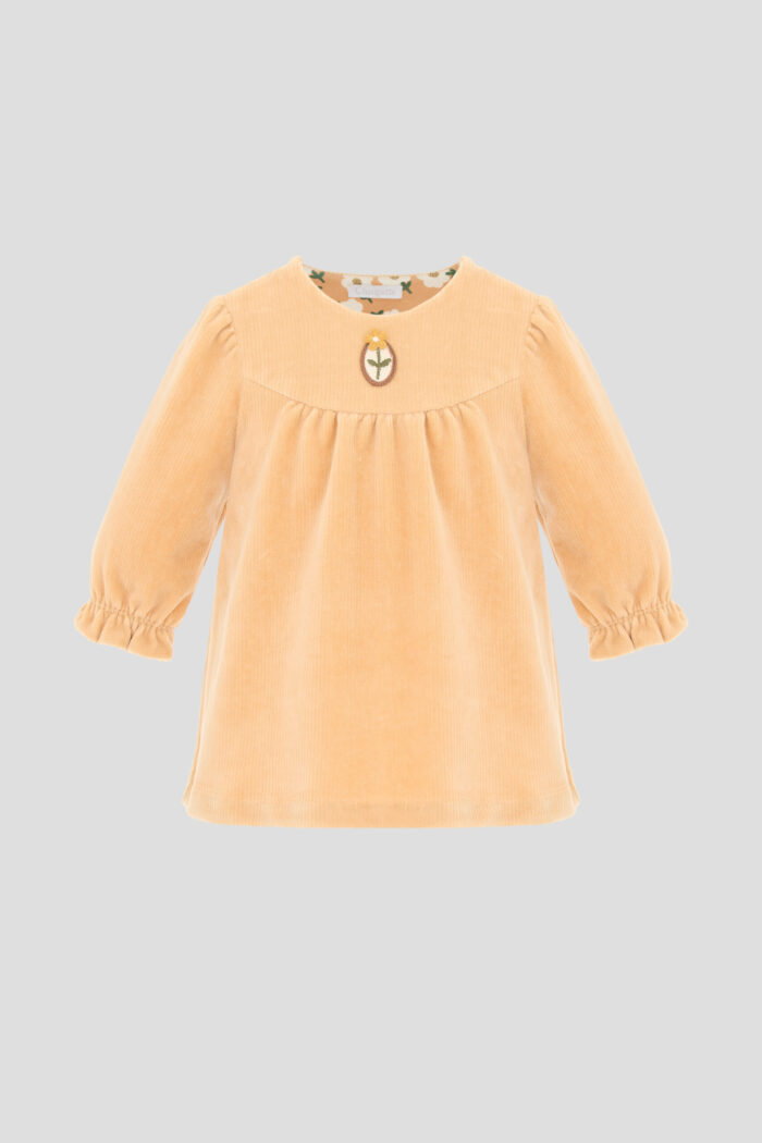 Stylish dress made of textured micro velvet is made in the current shade of ecru. The model of comfortable loose silhouette with embroidery on the chest. Sleeves with pleats and ruffles give the design a special charm. Under the round neckline there is an elegant patch in the form of a flower, which imitates an elegant pendant. The hypoallergenic cotton-based material is suitable for babies’ sensitive skin.