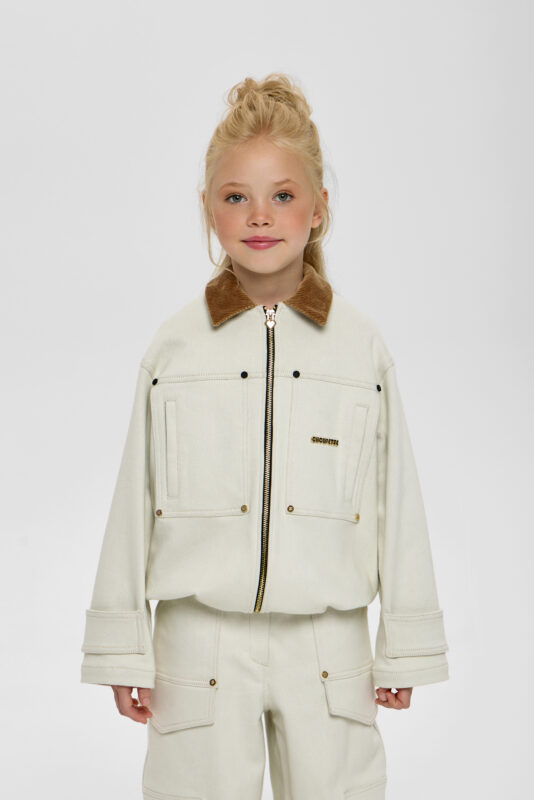 Fashionable children’s jacket made of textured micro velvet is made in a delicate sandy shade. Contrasting floral print adorns the design. The model of comfortable loose silhouette gives freedom of movement, which is especially important for children. Elasticated cuffs and knitted elastic band on the edge make the fit of the jacket comfortable for the child. The model fastens with a zip. Deep hood not only decorates the design, but also serves as protection from wind and rain. The model has a lining made of cotton fabric.