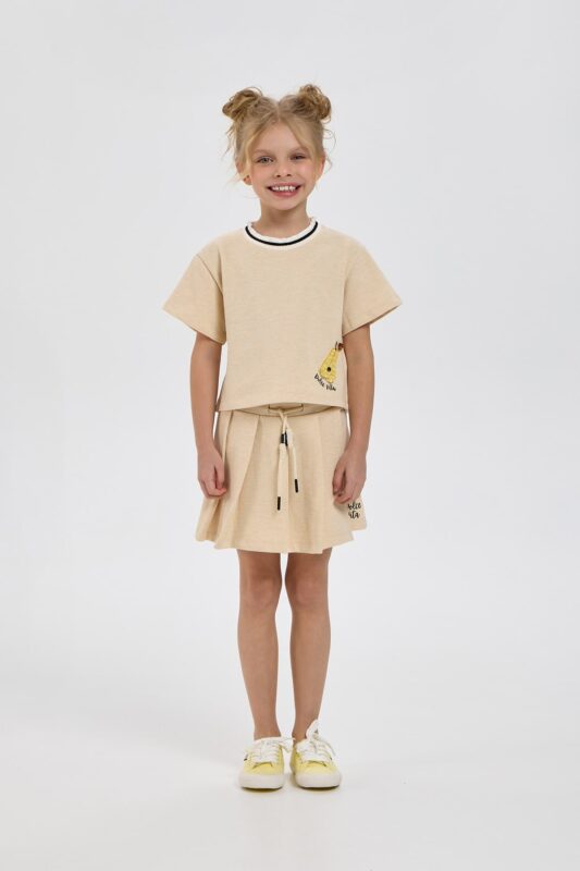 Beige micro-velvet skirt is decorated with a cute floral pattern. The comfortable length model has a trapezoidal shape. For a comfortable fit, the waistband has an elasticated insert at the back. The skirt will harmoniously complement any monochrome top. Thanks to high-quality blended fabric, the model holds its shape well and does not wrinkle, which is important for active children. The skirt fastens with buttons.