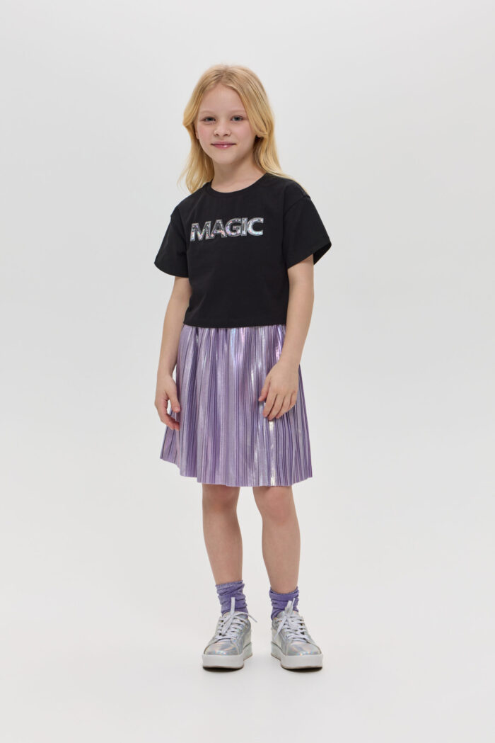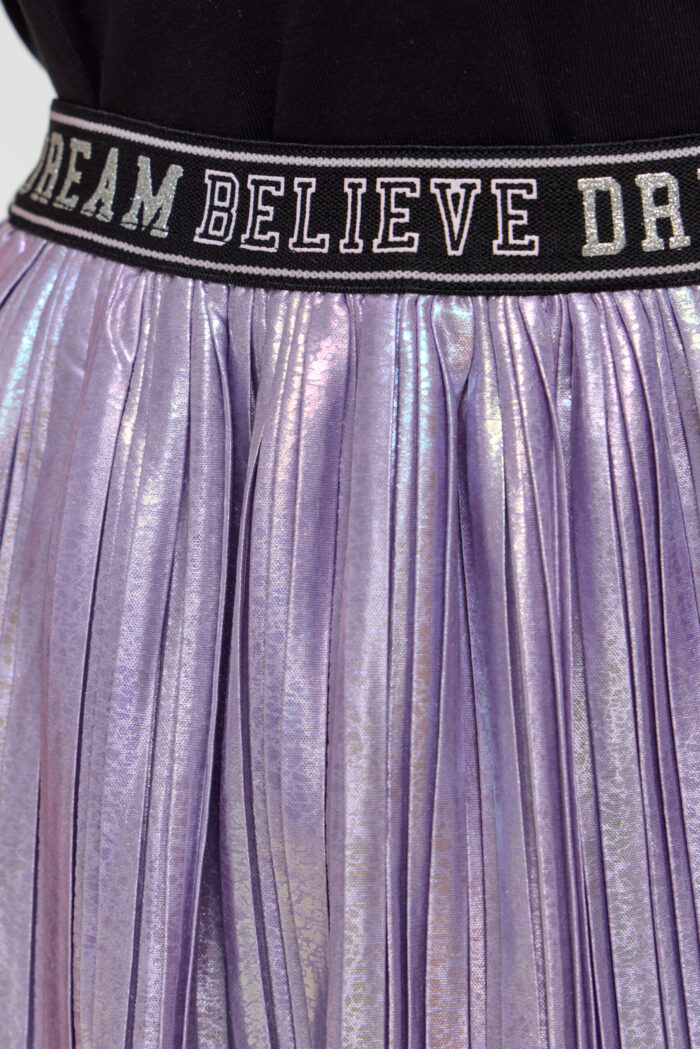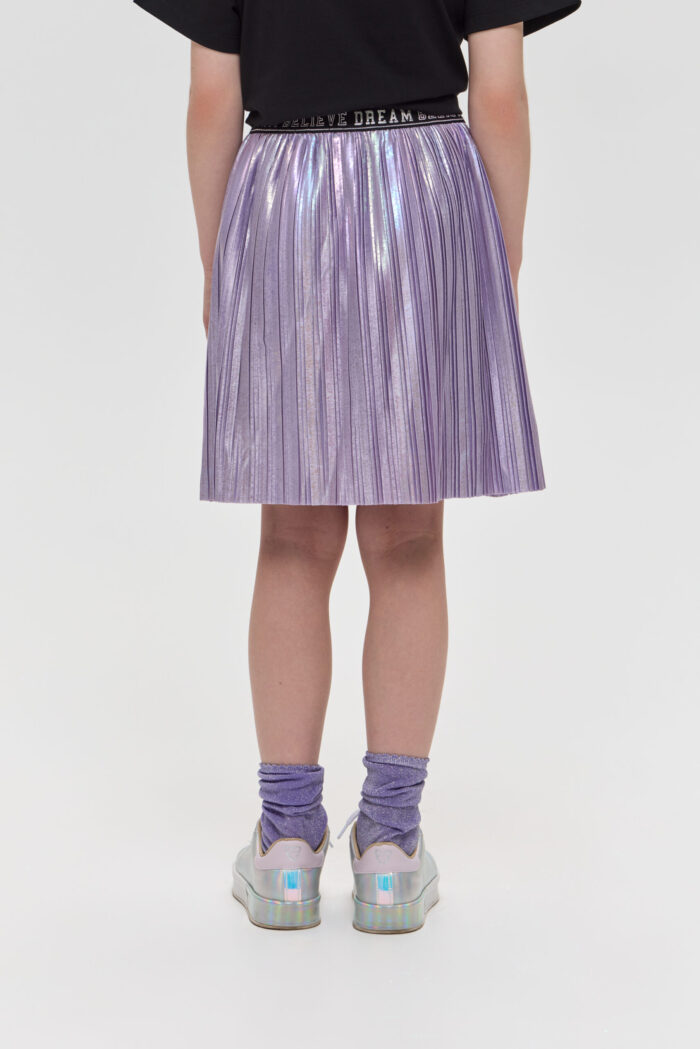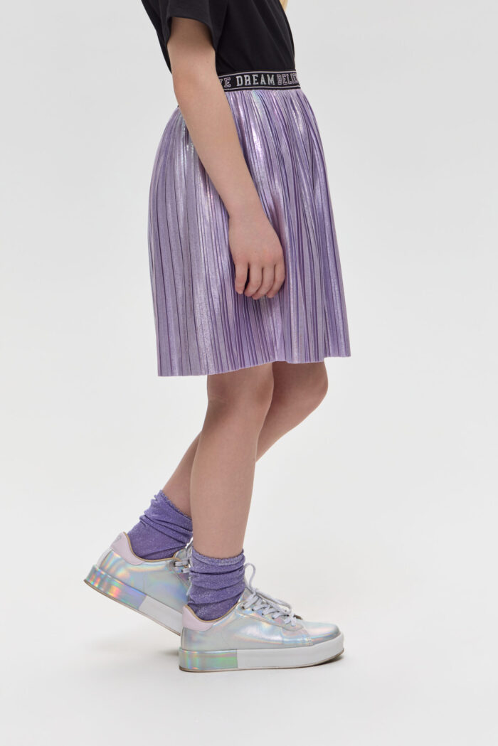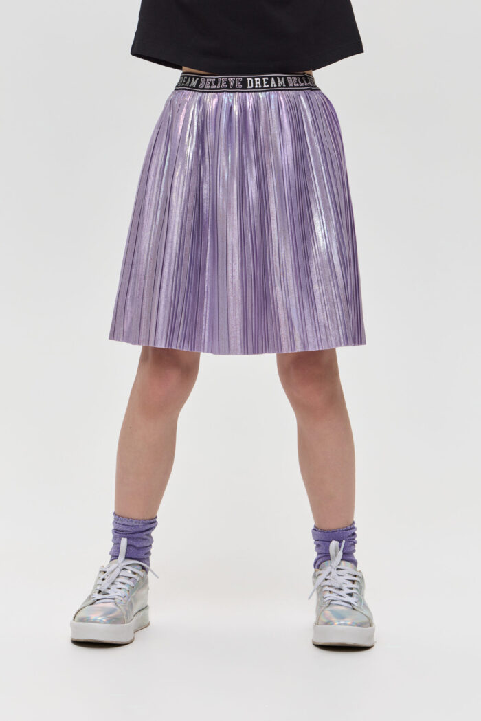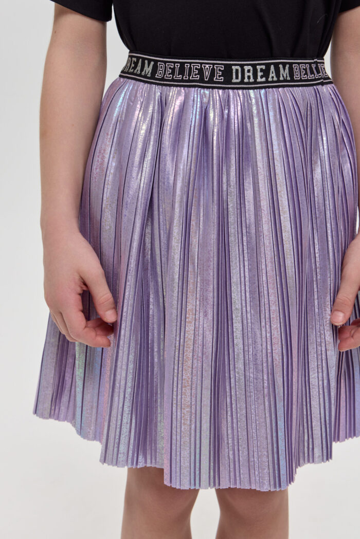Pleated skirt for girls in delicate lavender colour is a stylish and fashionable wardrobe item, which is perfect for creating light and romantic looks. Pleating creates an effect of lightness and airiness. Delicate lavender colour adds charm to the look. The skirt features a comfortable elasticated waistband that provides a comfortable fit at the waist. The waistband is decorated with a text print. The natural cotton lining provides additional comfort and allows the skin to breathe.