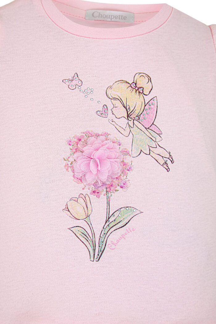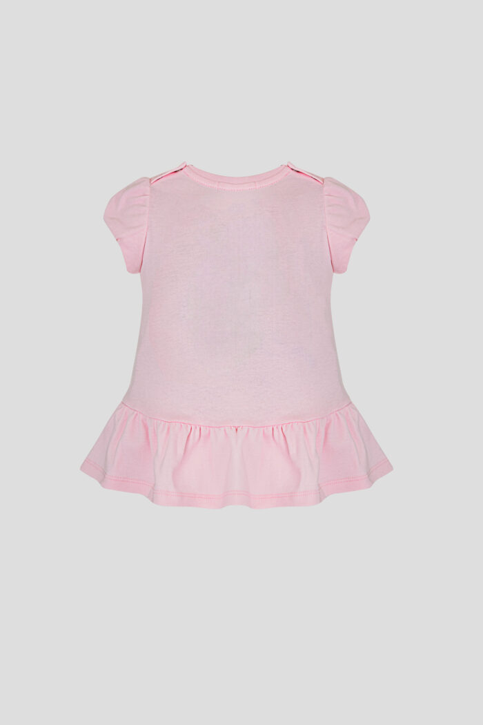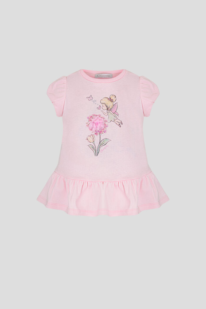 Charming dress for a baby girl in delicate pink colour is decorated with a vivid floral print. Colourful and cheerful flowers give the outfit a spring mood. Convenient buttons on the shoulder pads make the process of changing clothes quick. Short sleeves provide comfort in warm weather, and a flirty ruffle on the edge of the dress adds to its charm. This design element creates a fashionable voluminous silhouette. Natural cotton allows children’s skin to breathe and is allergy-free.