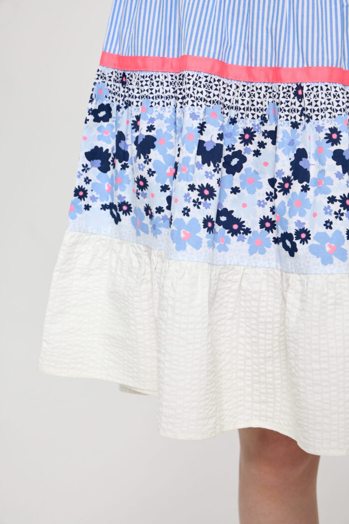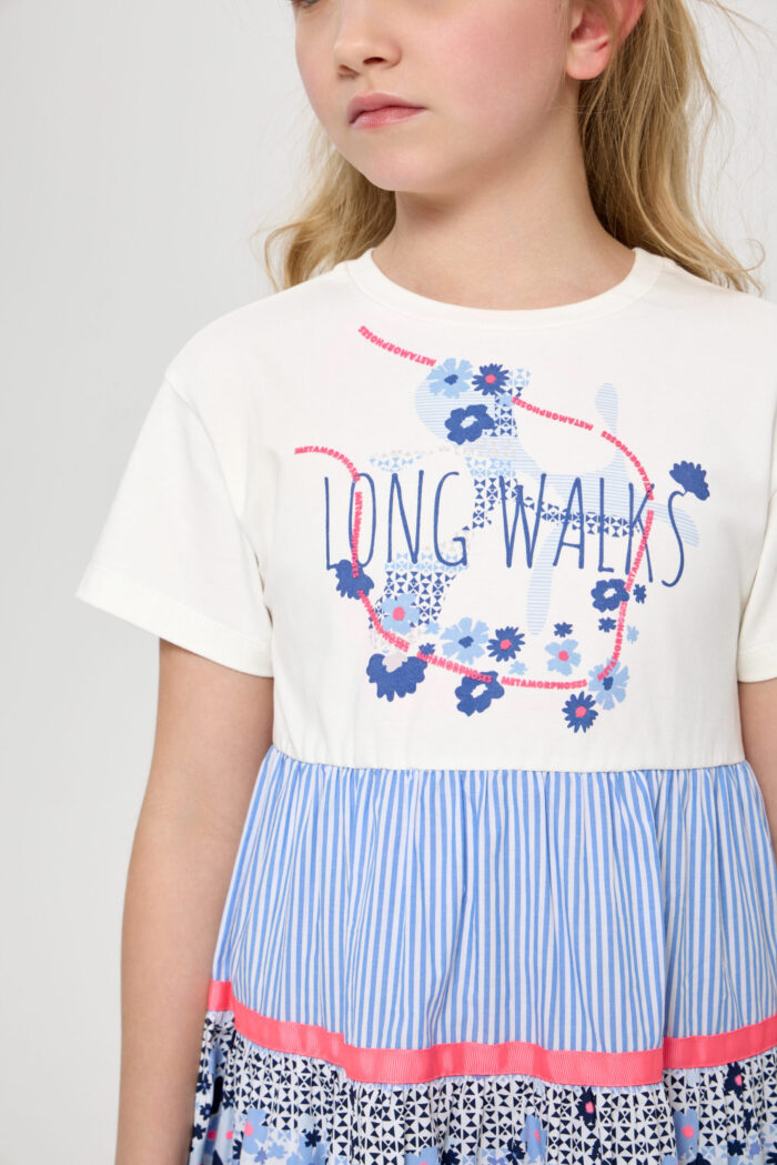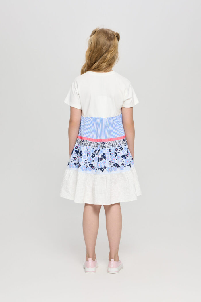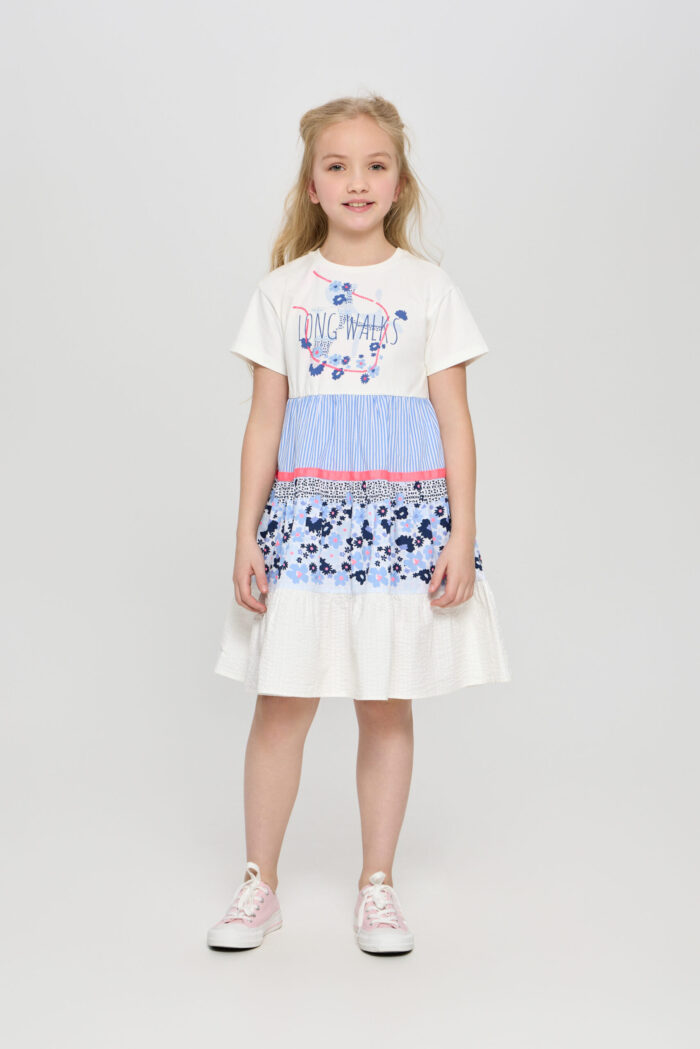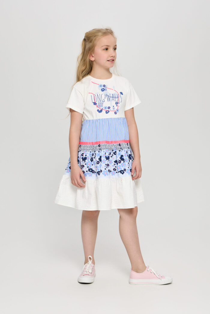 In a girl’s summer wardrobe there will definitely be a place for a charming light dress. The combined model has a trapezoid shape with a slightly high waistline and short sleeves. The bottom of the dress is framed by a wide flounce, adding a playful touch. The vivid print decorating the dress makes the look memorable and unique.