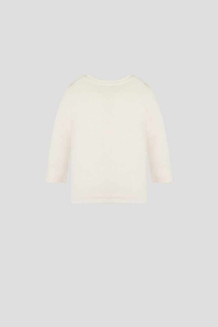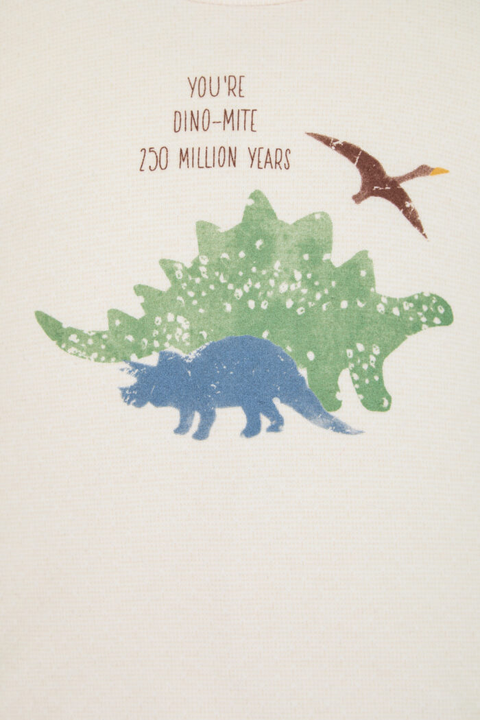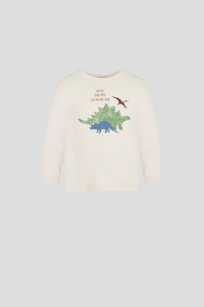 The long sleeve T-shirt for baby boys with print is made in beige color. The free fit model has a button closure located on the shoulder seam, speeding up the process of changing the baby’s clothes. The long sleeve T-shirt is decorated with a designer print in the form of interesting dinosaurs.