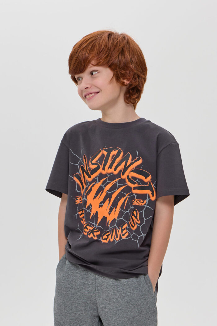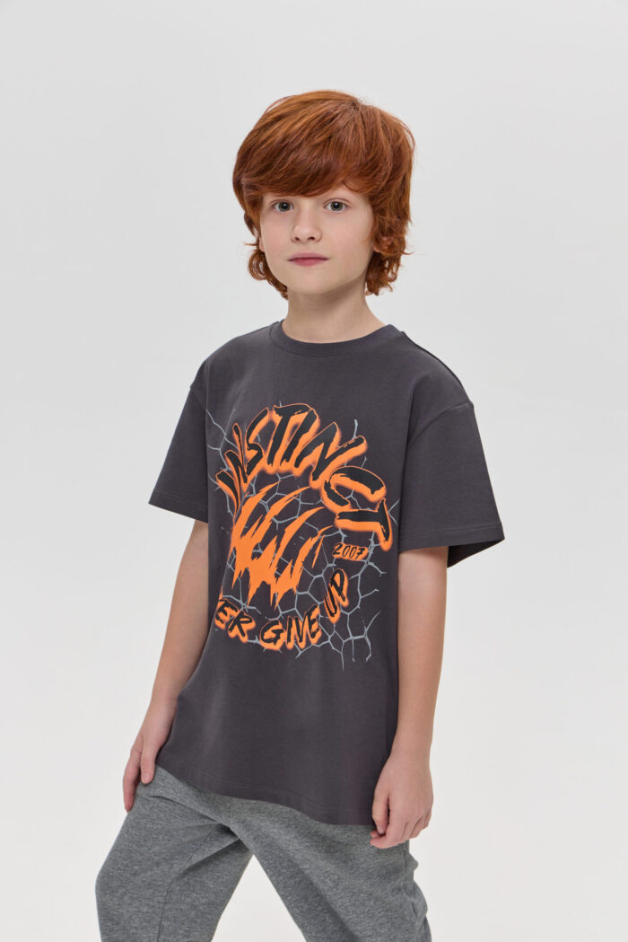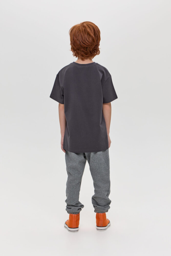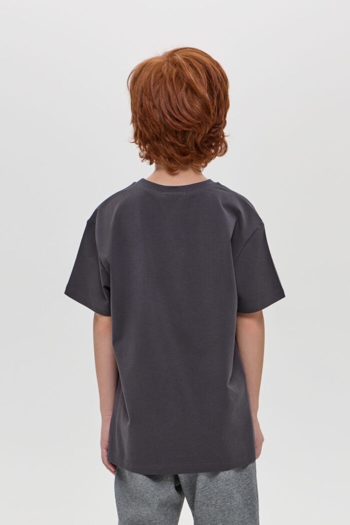 Stylish T-shirt for boys in graphite colour, made of soft and pleasant to the touch material. It provides the child with maximum comfort. The T-shirt has a classic round neckline, which is framed by a contrasting border that adds an interesting accent and emphasises the stylish design. The T-shirt can be perfectly combined with various items of children’s wardrobe.