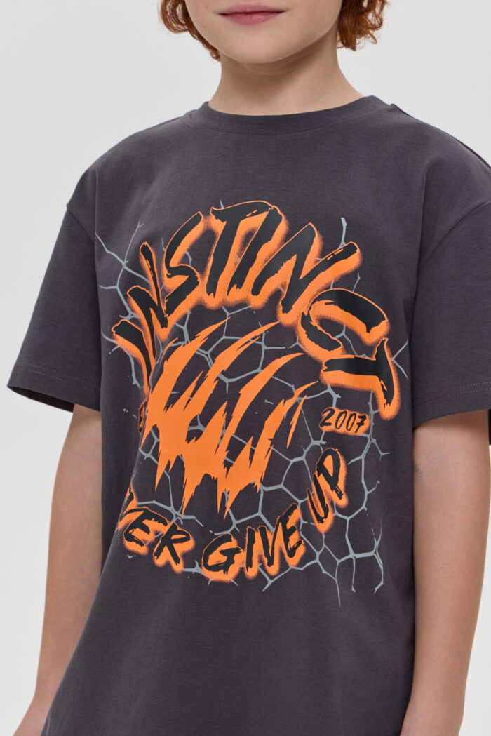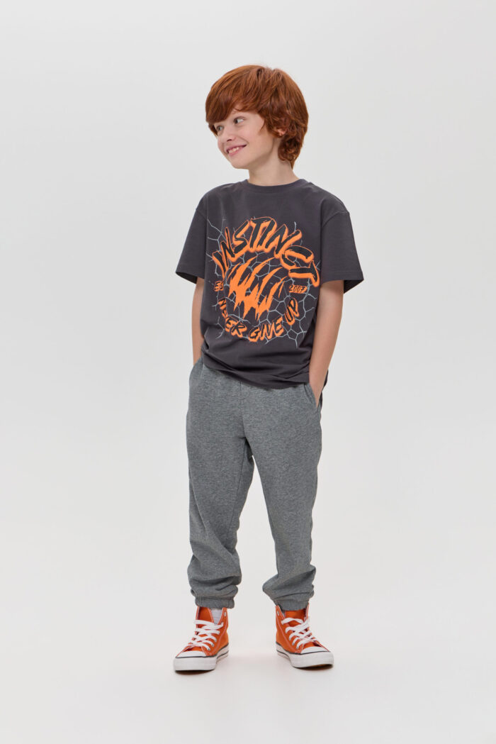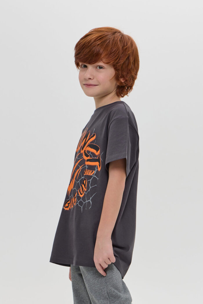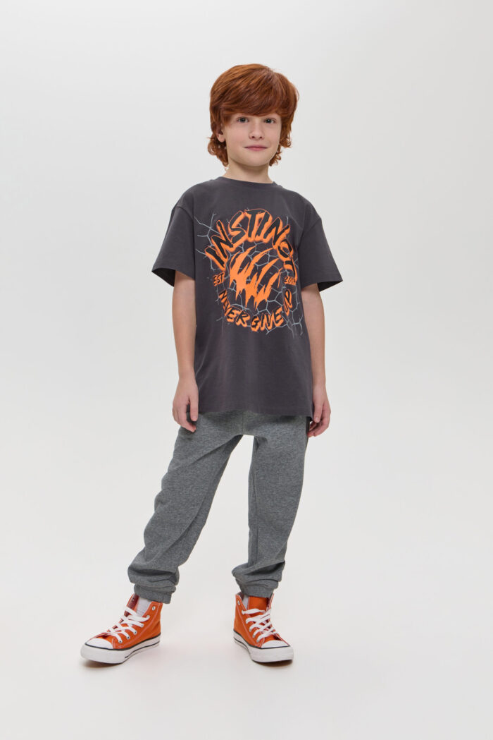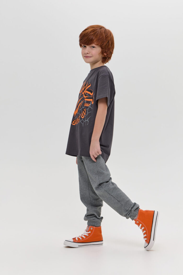 Stylish T-shirt for boys in graphite colour, made of soft and pleasant to the touch material. It provides the child with maximum comfort. The T-shirt has a classic round neckline, which is framed by a contrasting border that adds an interesting accent and emphasises the stylish design. The T-shirt can be perfectly combined with various items of children’s wardrobe.