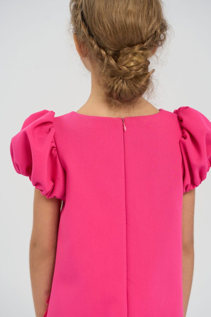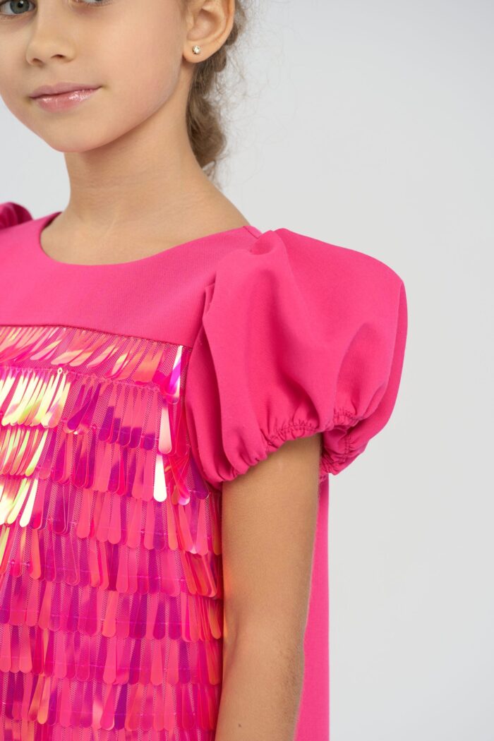 Dress for a girl with large long sequins. It is made in fashionable bright pink colour that attracts attention and creates a festive mood. The large-sized sequins are evenly distributed on the dress, creating a spectacular glamorous glitter and play of light. Short lantern sleeves add a romantic look to the dress. It fastens with a zip on the back. The natural cotton lining ensures the child’s comfort.