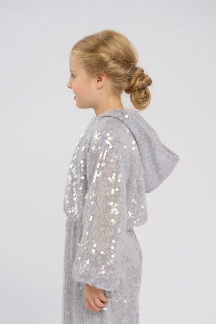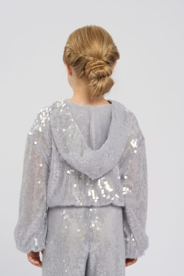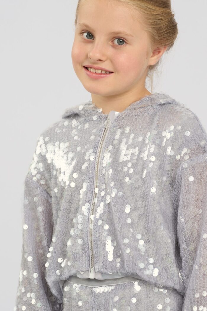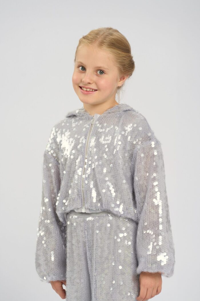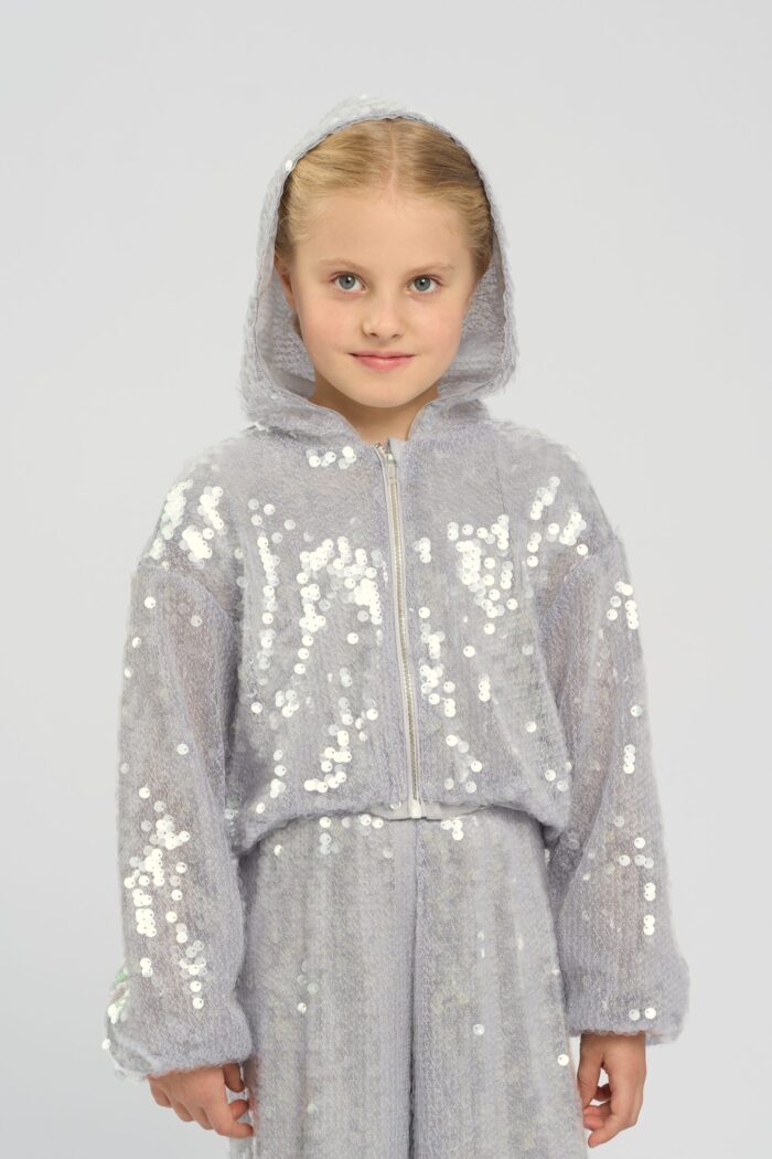 Stylish children’s jacket in grey with sequins will be a great addition to a girl’s wardrobe. The shortened length and modern design make it versatile, allowing you to easily combine it with different outfits. The comfortable hood adds functionality and protects from the wind. The sequins are eye-catching. The zip fastening makes the jacket easy to put on. The jacket will become a favourite wardrobe item for active girls who like to stand out. It has a modal lining.