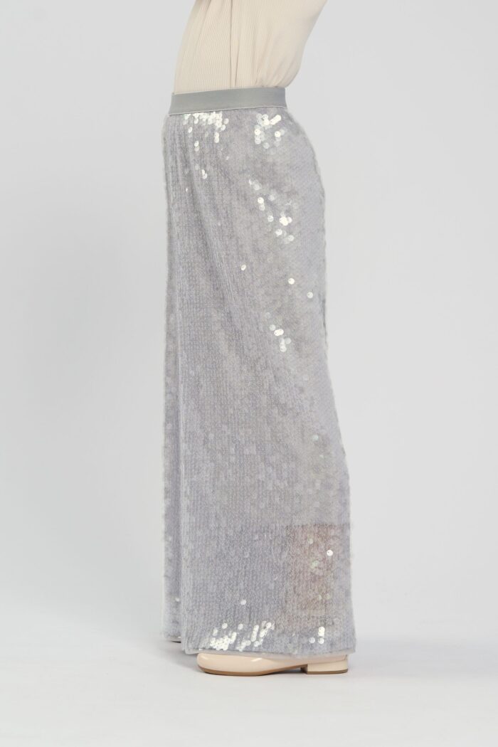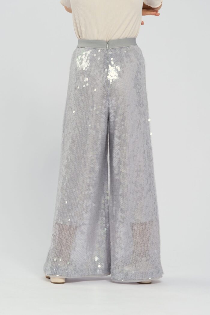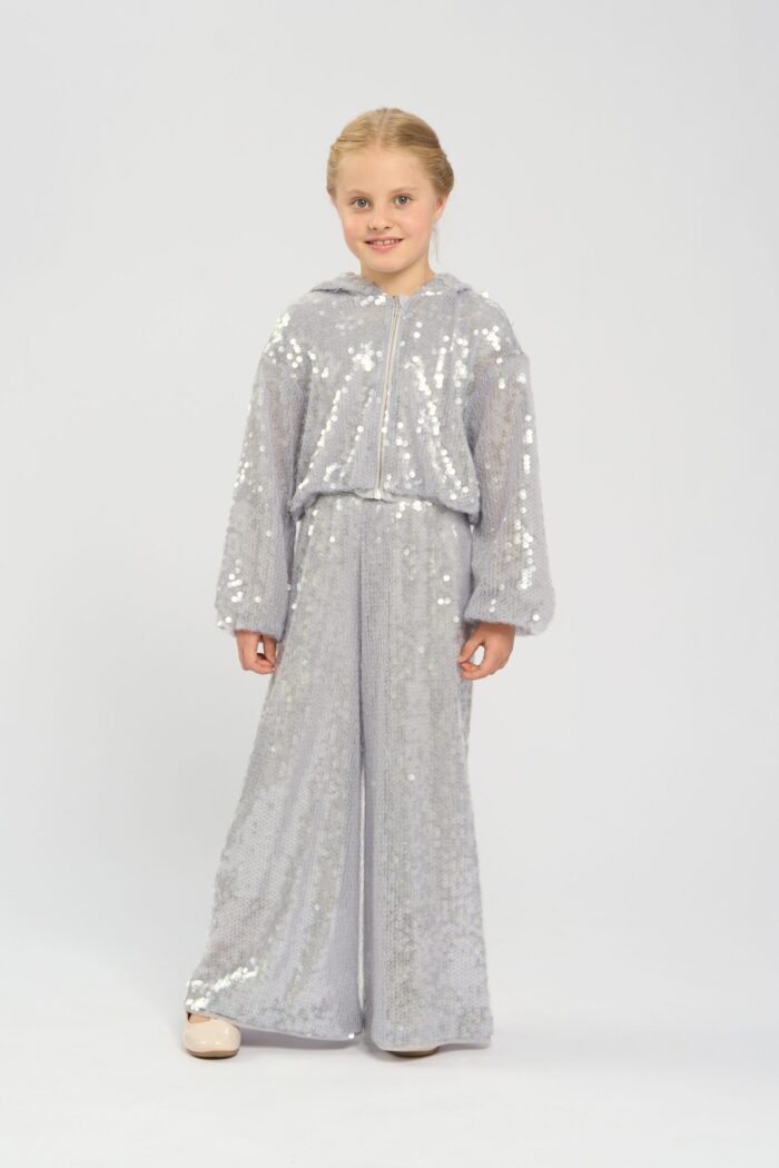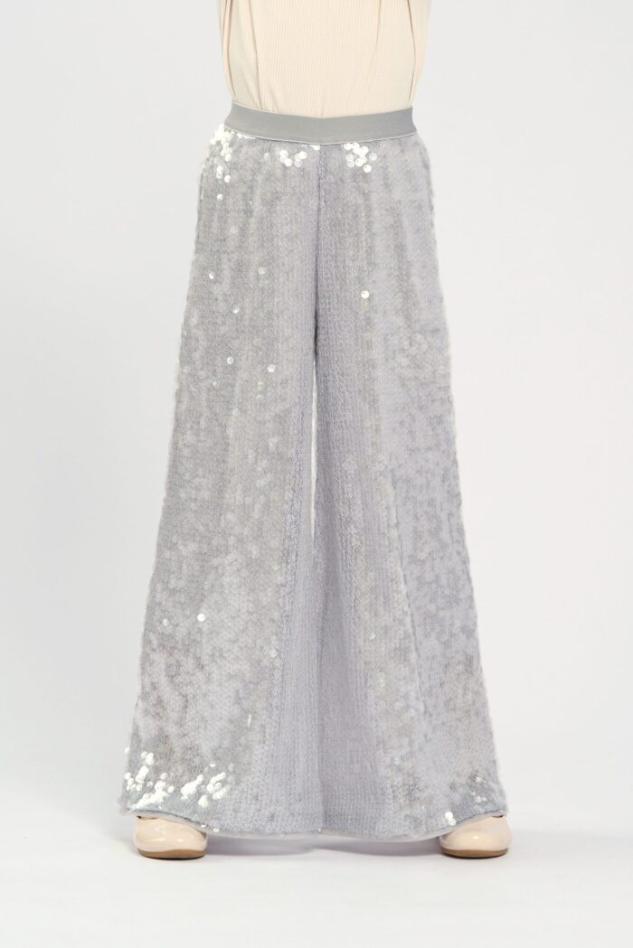 Pallazzo pants for girls is made in pearl colour. It is a stylish and elegant wardrobe item that is perfect for special occasions and everyday wear. The elasticated waistband provides a great fit and comfort, making the pants easy to put on and take off. The wide silhouette creates an airy look. The sequins decorating the pants give it a special sparkle and glamour, making it ideal for festive events. The pants can be combined with various tops and accessories. They have a modal lining.