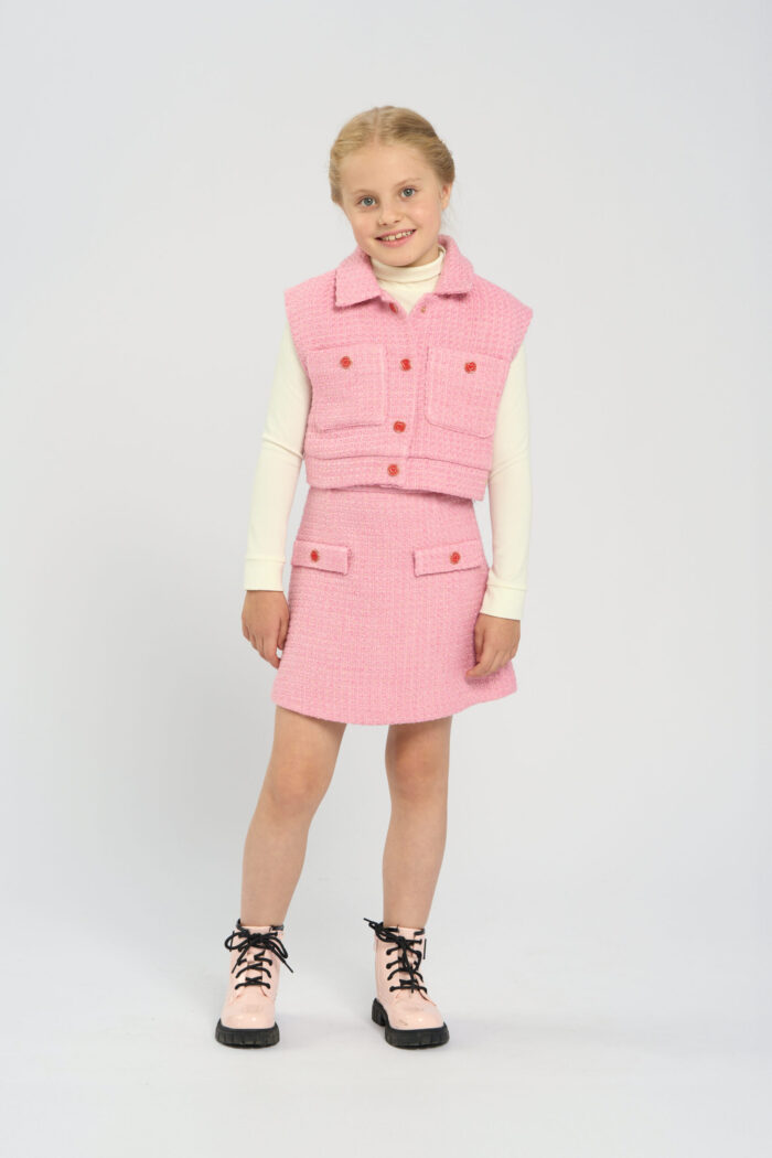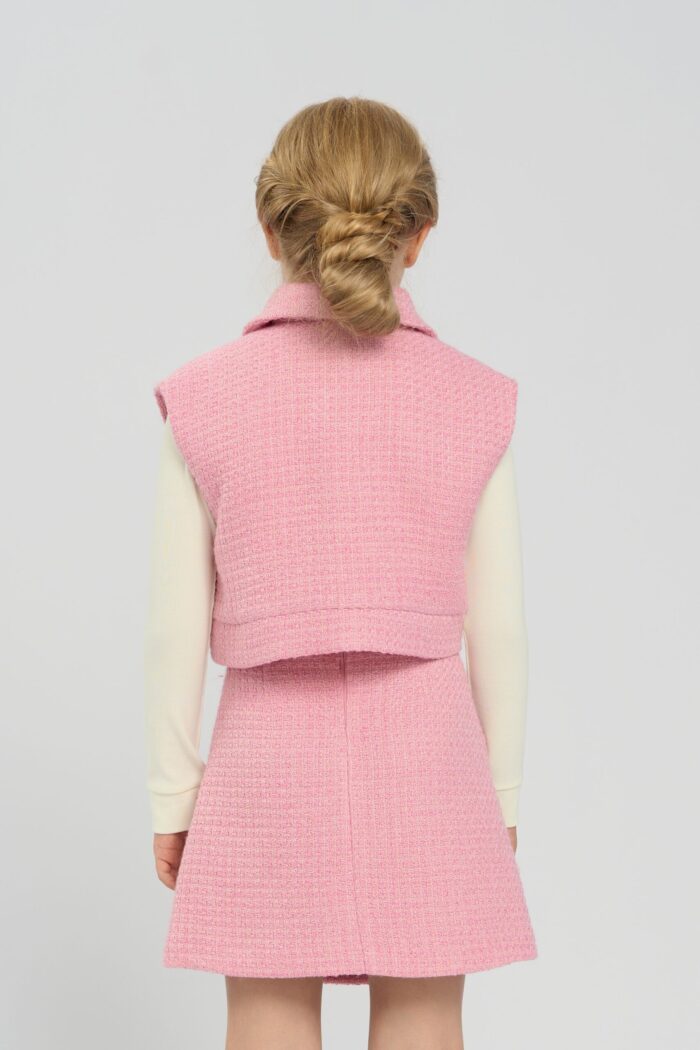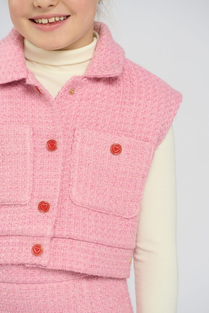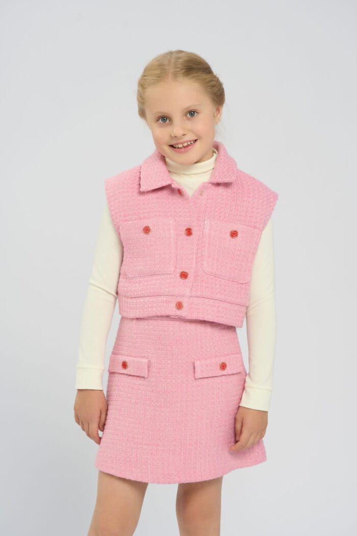 Sleeveless jacket for girls is ideal for creating actual layered looks. The jacket harmoniously combines with any blouses and turtlenecks. The model of fashionable tender pink shade, textured fabric became the main decoration of the design. Two patch pockets harmoniously decorate the jacket. It fastens with buttons decorated with hearts.