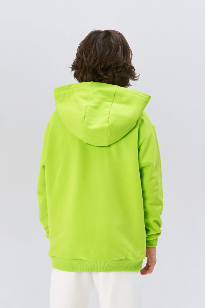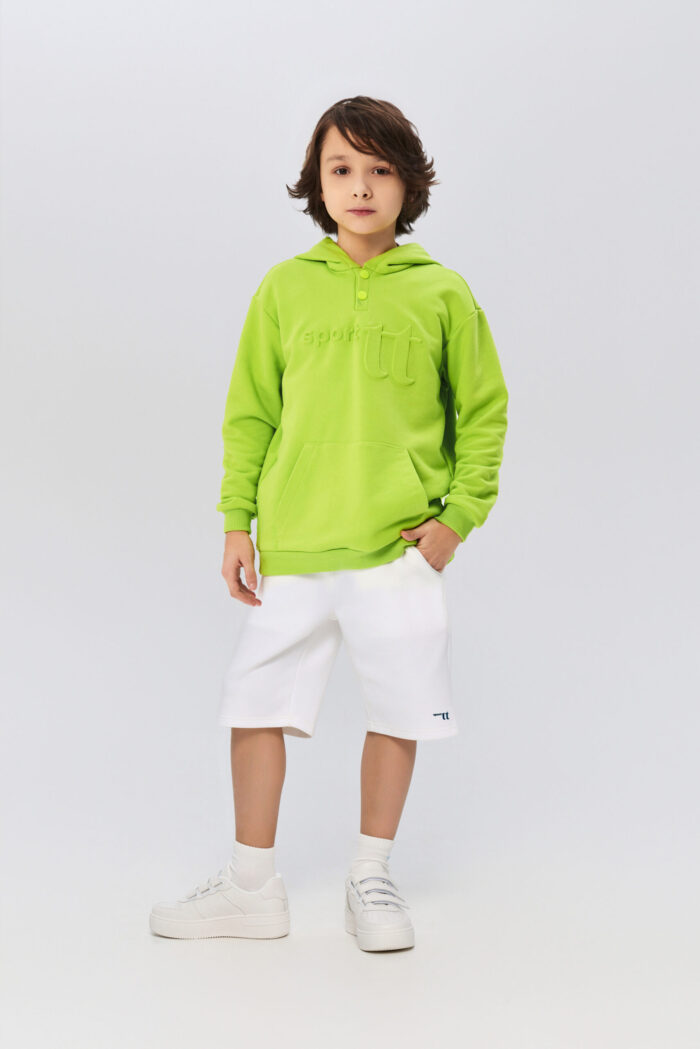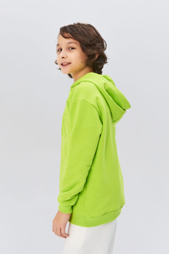 Boy’s hoodie in a rich green colour is the perfect choice to create a sports and fashionable look. The model is perfect for both everyday use and outdoor play. Made from soft cotton material, the hoodie provides comfort in cooler weather. Loose fit model with a large hood with convenient button fastening. There is a handy kangaroo pocket at the front. Hoodie sweatshirt is perfectly combined with jeans and sports pants. It will be a great choice for walking and sport activities.