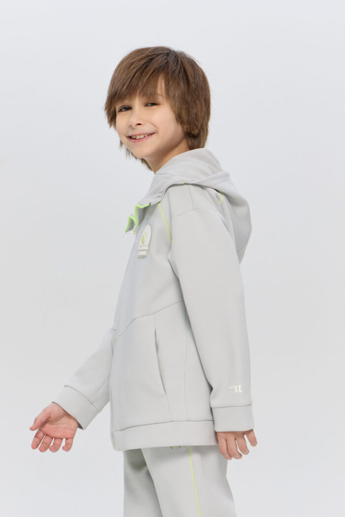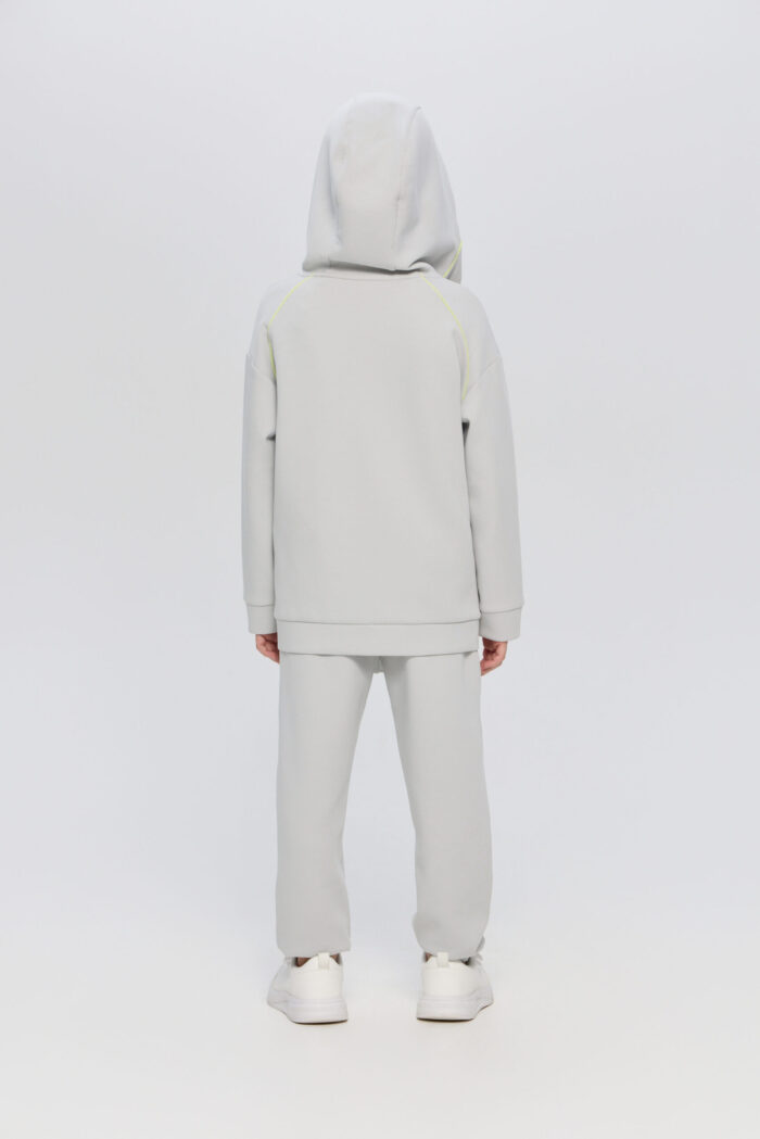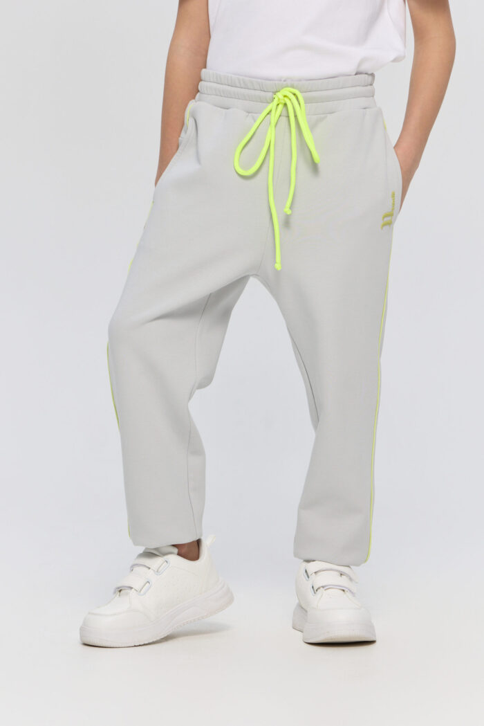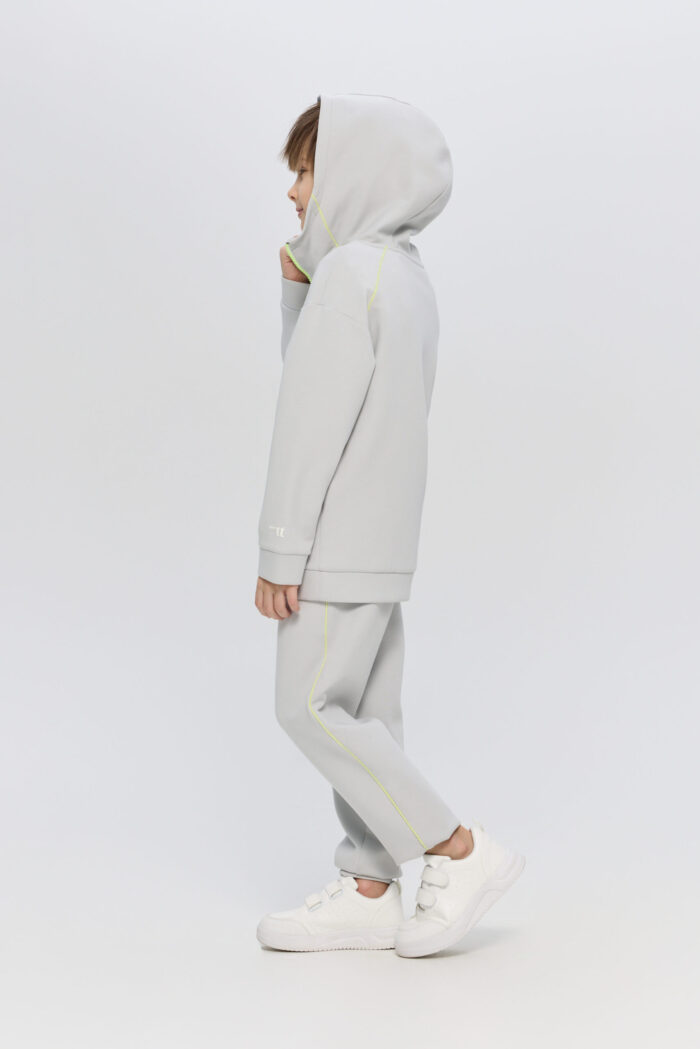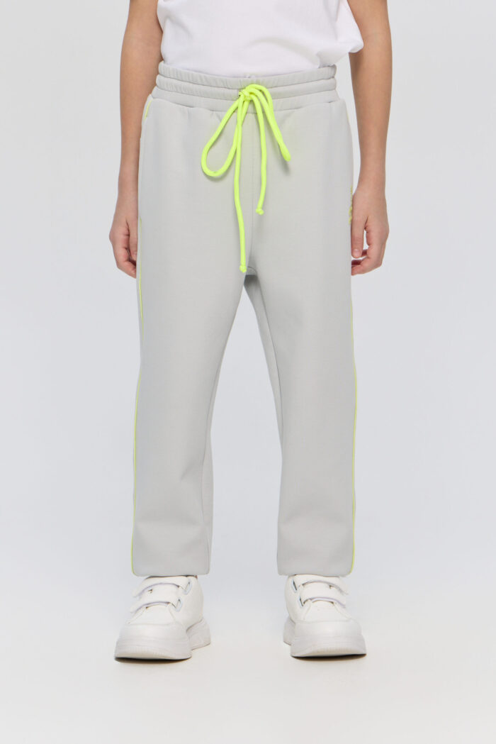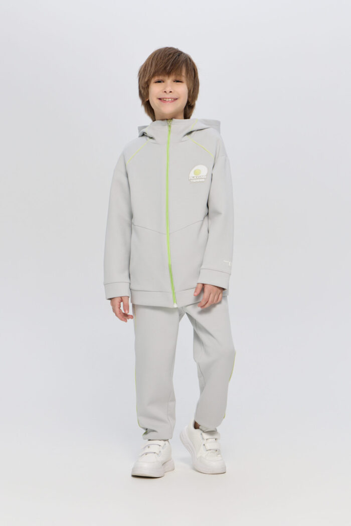 Sports Set for boys, consisting of a bomber and pants. The set will fit perfectly into both casual and sporty wardrobe. Loose-fitting bomber jacket with contrast zip fastening. Long sleeves with cuffs. Convenient pockets are designed to store small things. Fashionable hood and original design add attractiveness. Straight pants have an elasticated waistband that can be adjusted. Bright neon stripes on the sides make this model more stylish.