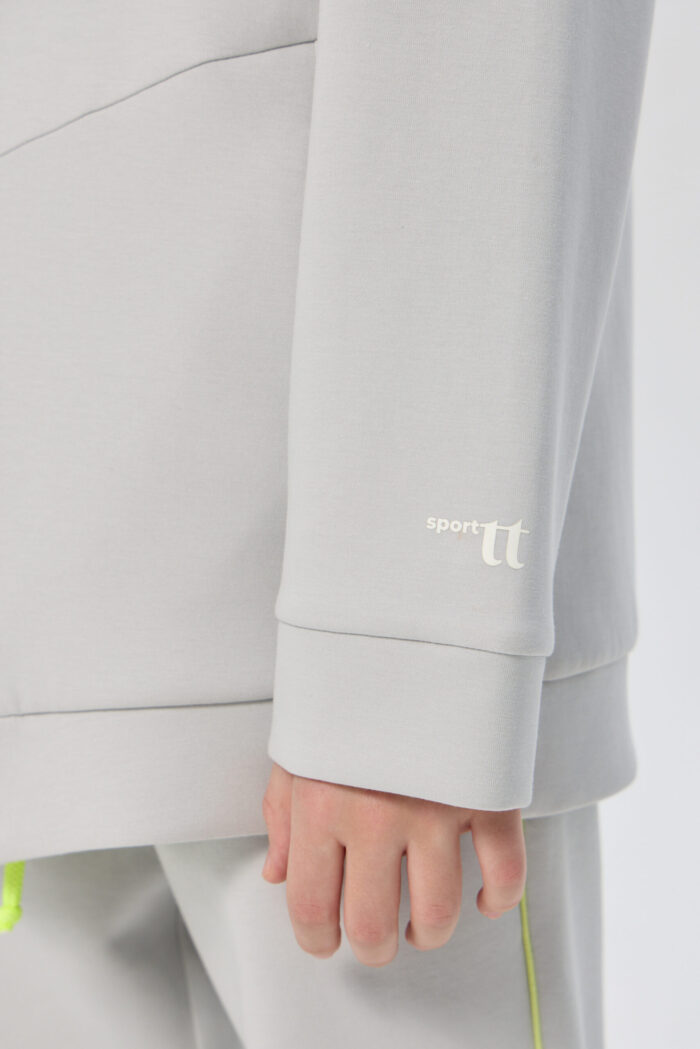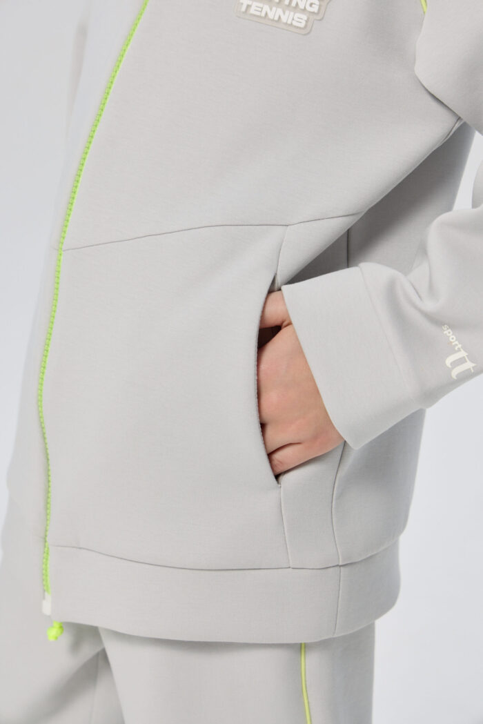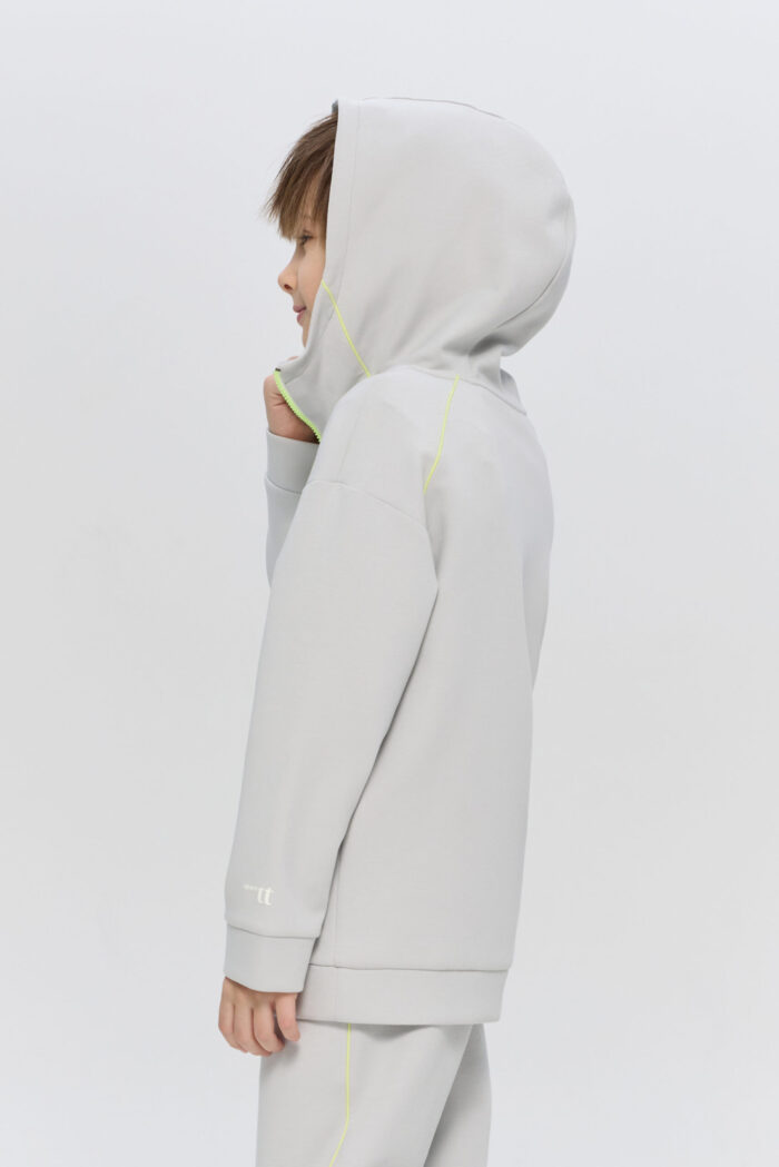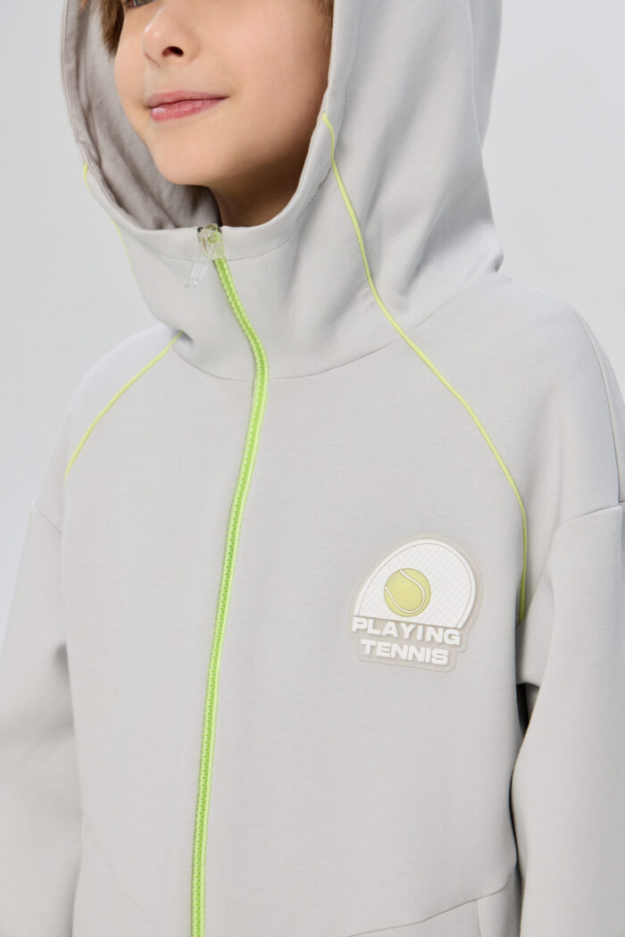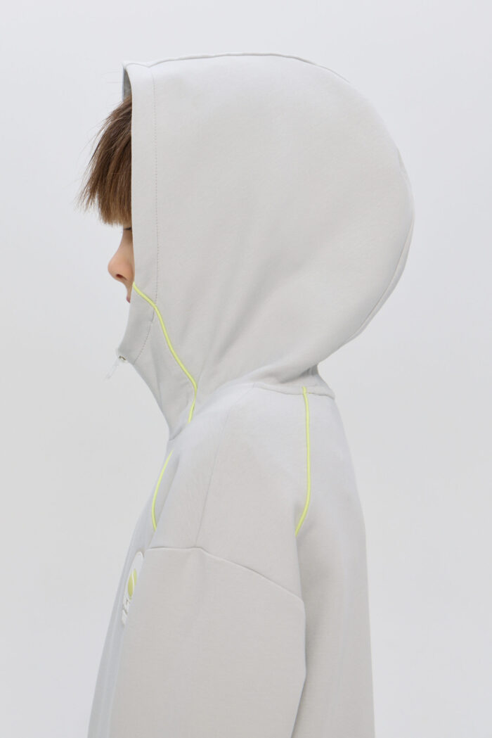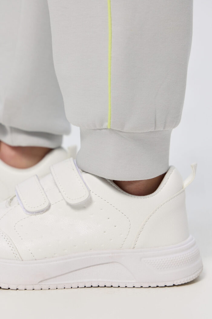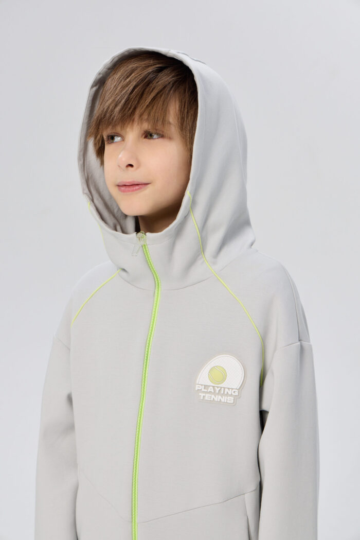 Sports Set for boys, consisting of a bomber and pants. The set will fit perfectly into both casual and sporty wardrobe. Loose-fitting bomber jacket with contrast zip fastening. Long sleeves with cuffs. Convenient pockets are designed to store small things. Fashionable hood and original design add attractiveness. Straight pants have an elasticated waistband that can be adjusted. Bright neon stripes on the sides make this model more stylish.