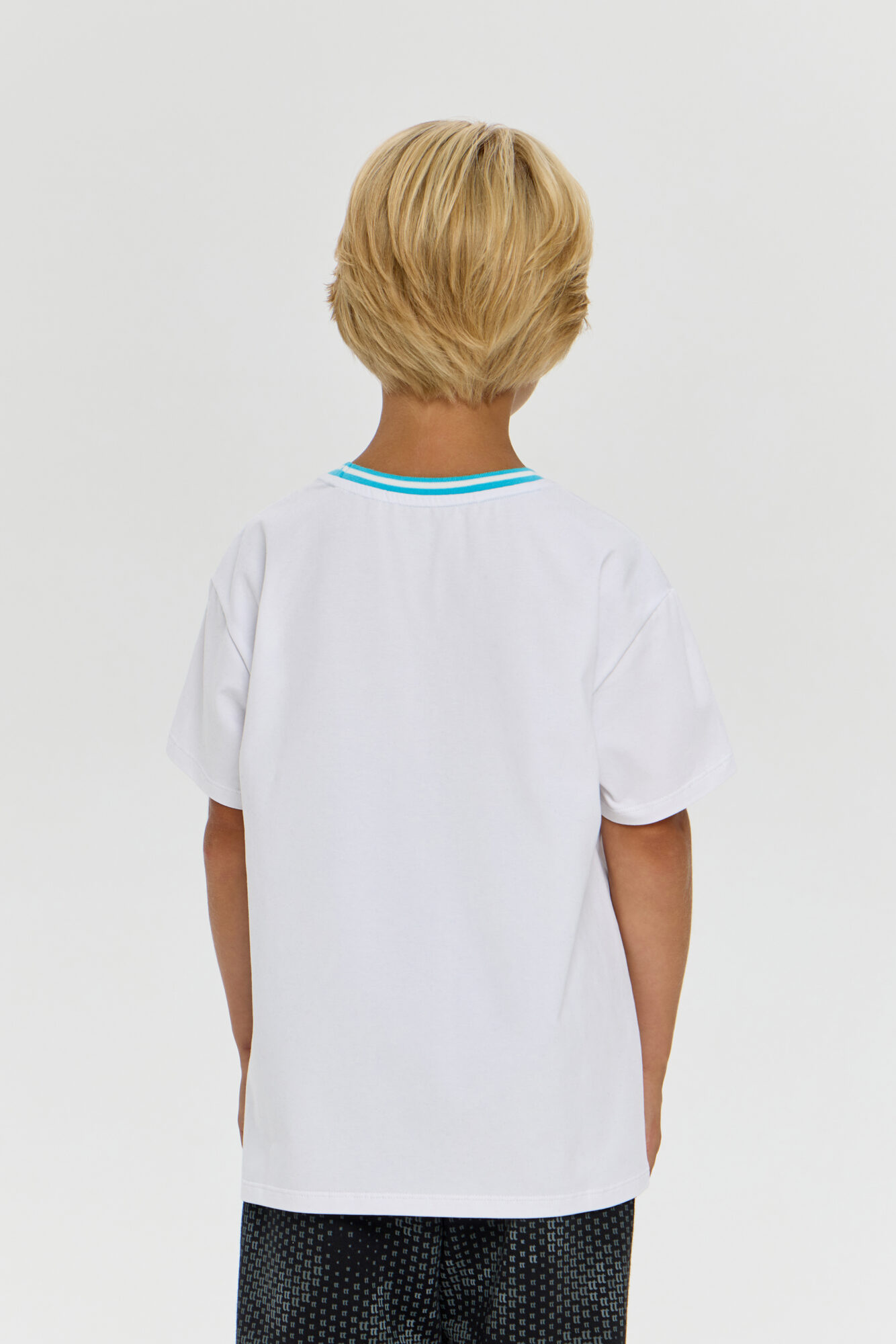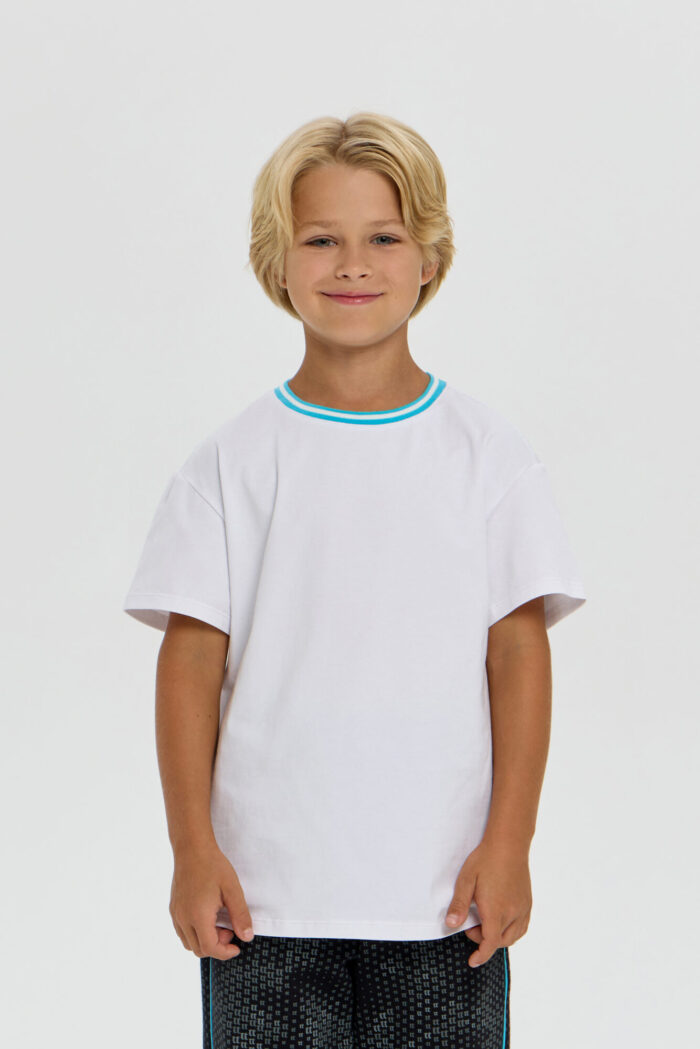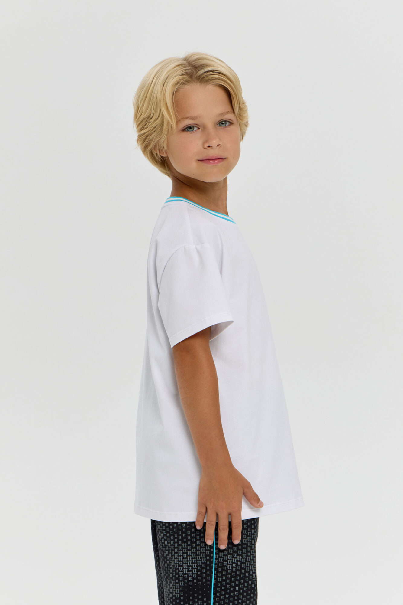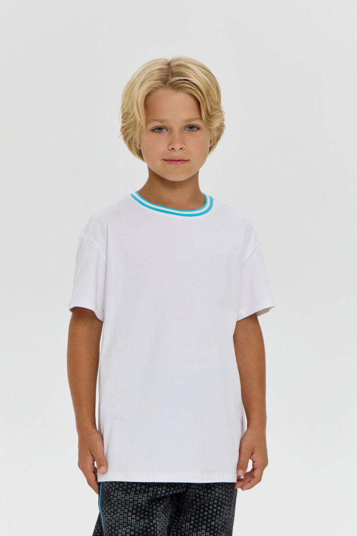 This white T-shirt will serve as the basis for creating various looks in a boy’s wardrobe. The model is made of breathable and lightweight material that is ideal for sports training and active outdoor games. The presence of elastane guarantees that it will retain its original appearance even after active use and washing. The straight silhouette does not restrict movement, and the neutral white shade makes it easy to combine the T-shirt with any pants or shorts.