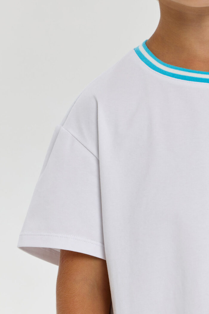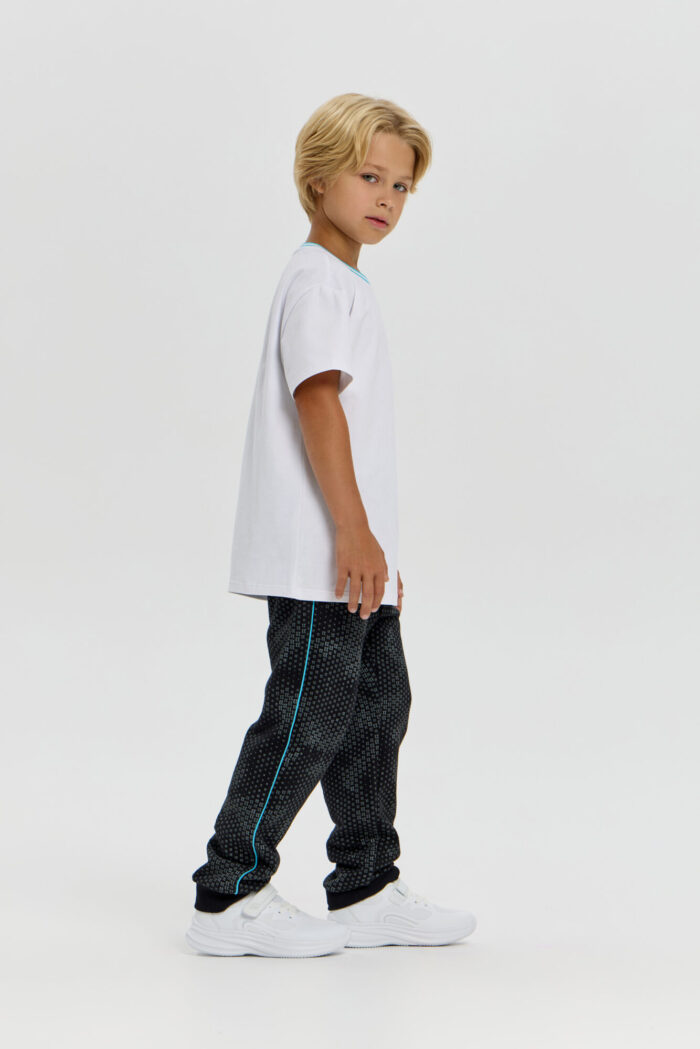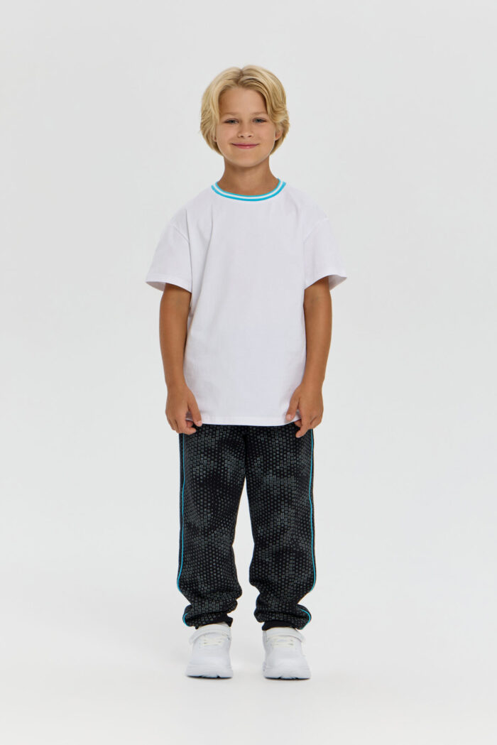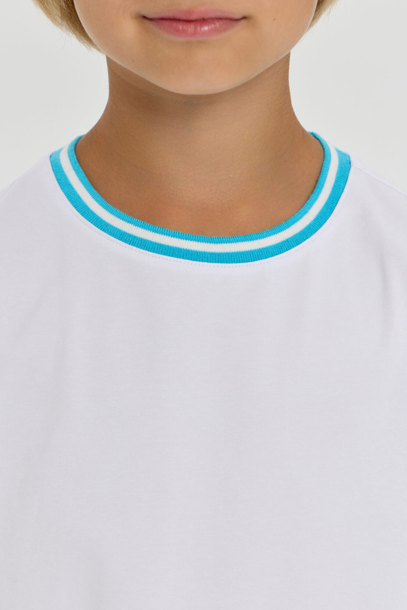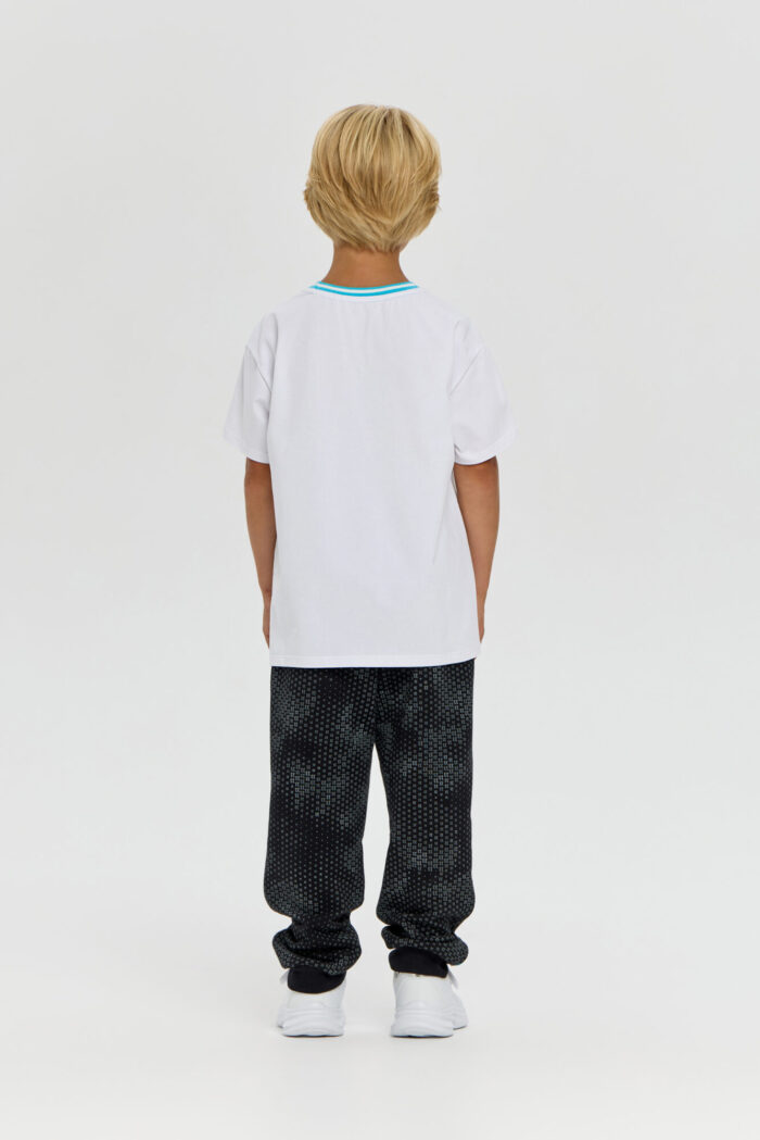 This white T-shirt will serve as the basis for creating various looks in a boy’s wardrobe. The model is made of breathable and lightweight material that is ideal for sports training and active outdoor games. The presence of elastane guarantees that it will retain its original appearance even after active use and washing. The straight silhouette does not restrict movement, and the neutral white shade makes it easy to combine the T-shirt with any pants or shorts.
