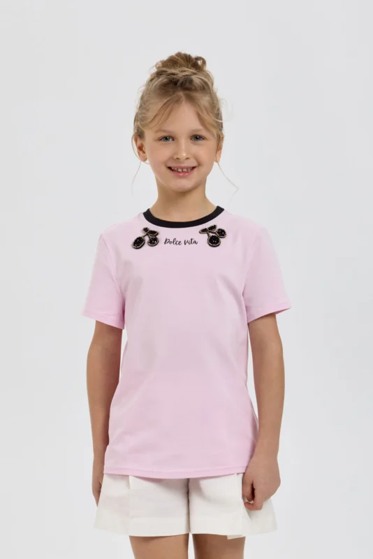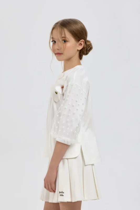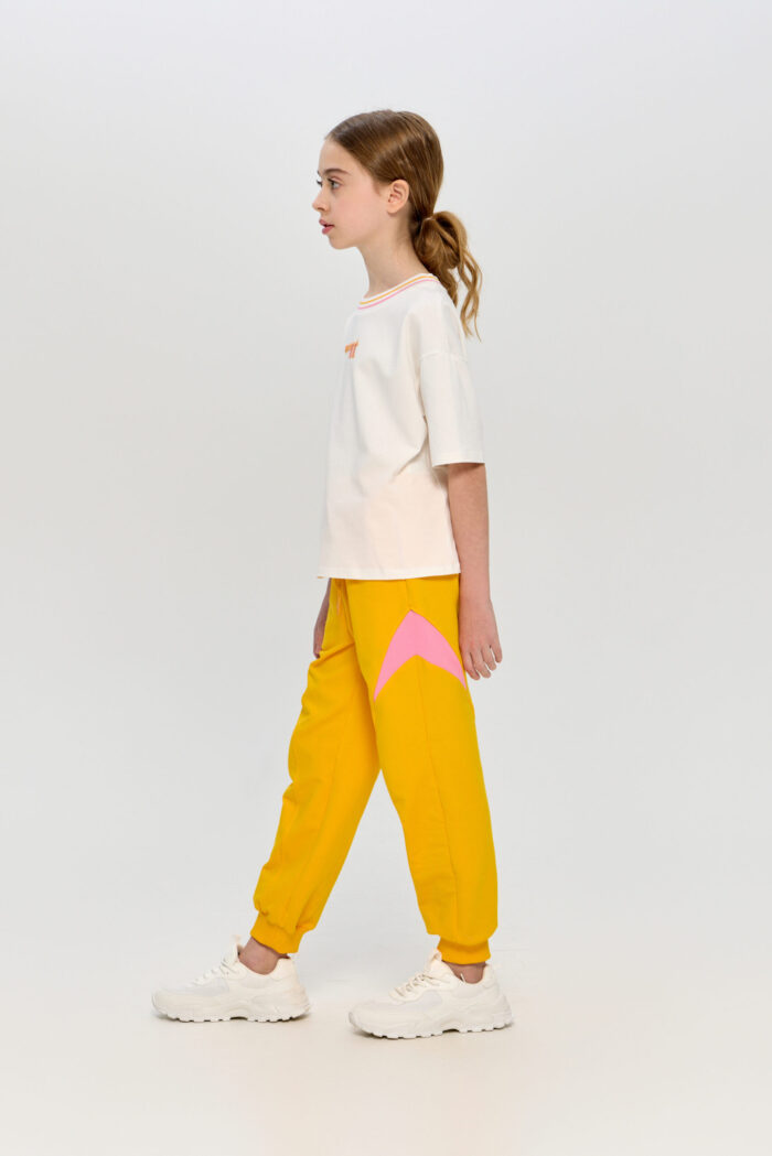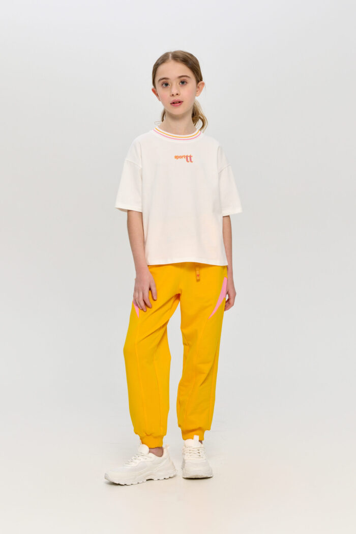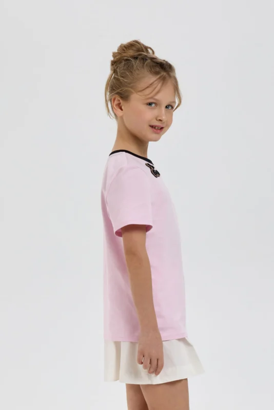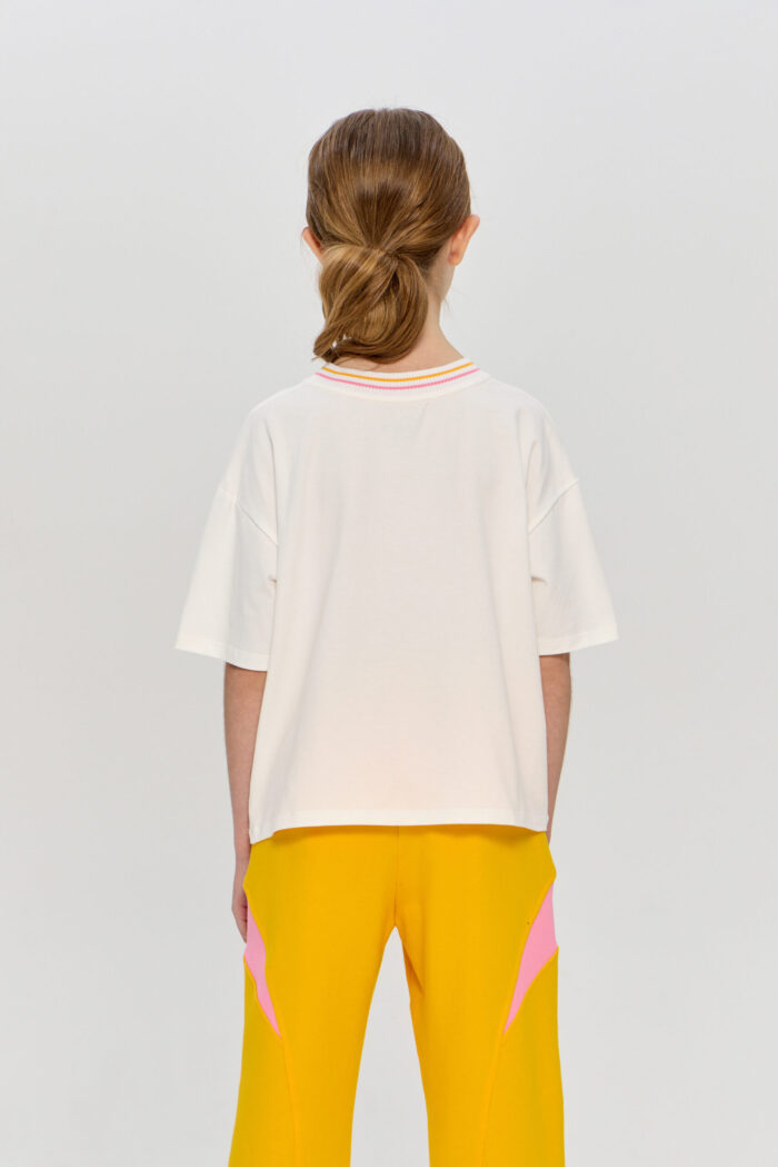 The white sports shirt is a great addition to a girl’s wardrobe. Made of high-quality material, it provides excellent air circulation and comfort during active training or games. The model has a loose silhouette and rounded neckline. The short sleeves with a dropped shoulder line do not restrict movement, allowing you to easily perform a variety of exercises. Attractive details such as the contrasting neckline trim and colourful embroidery add to its style. The versatile design of the T-shirt allows it to be combined with a variety of sportswear, such as shorts, leggings or sports pants.