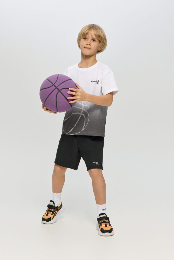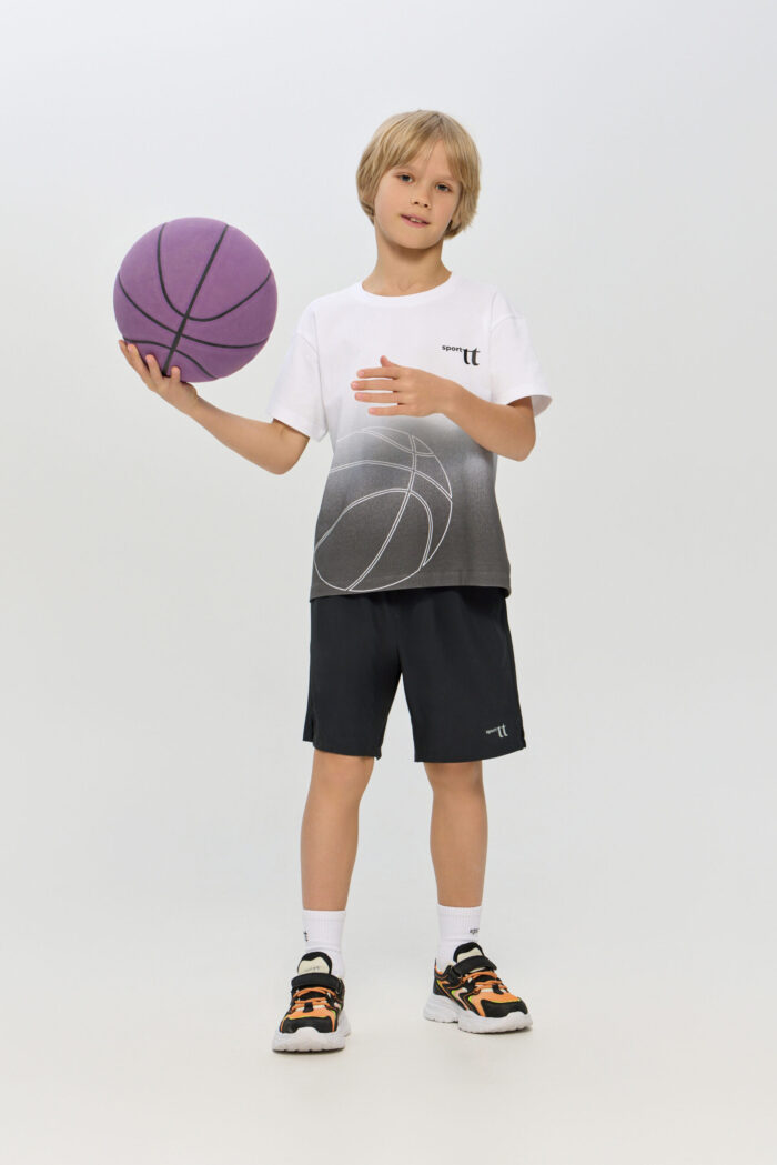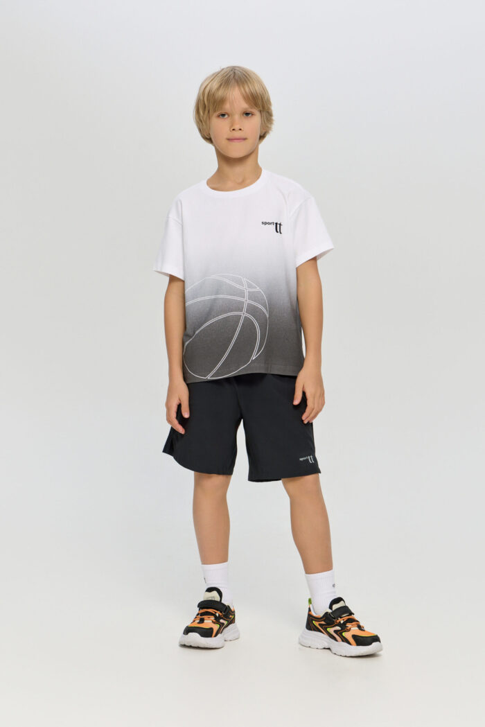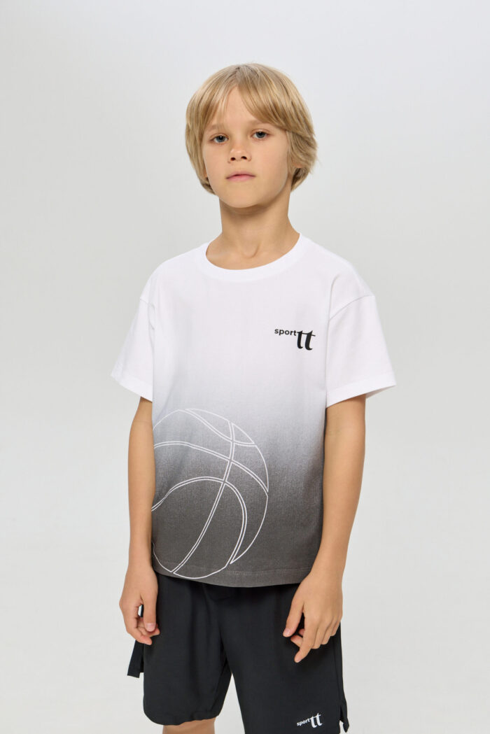 Sports T-shirt with a print for boys is ideal for any active games. The loose fit does not restrict movement. The model is ideal for both training and everyday use. The T-shirt is decorated with a stylish print on a white background, which adds brightness and personality.