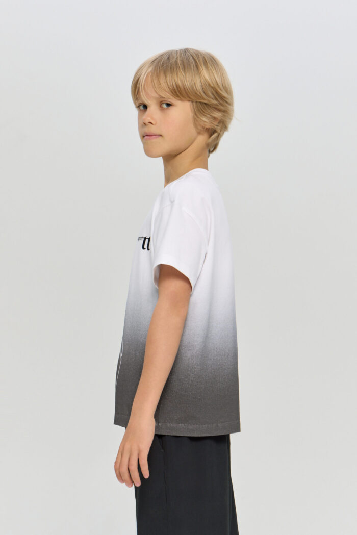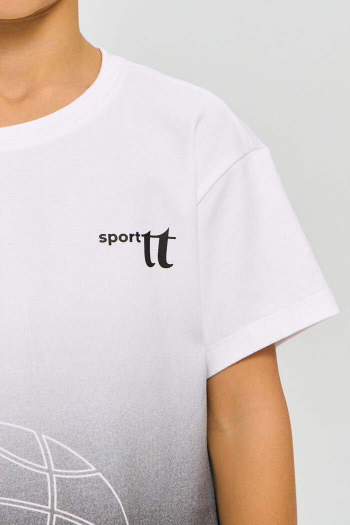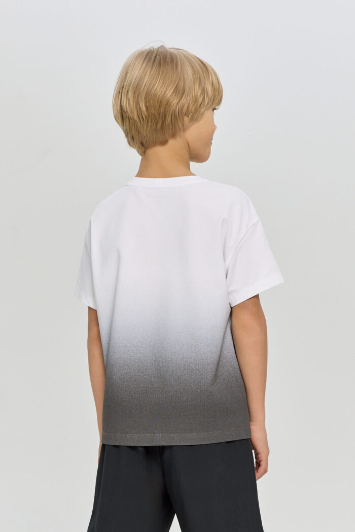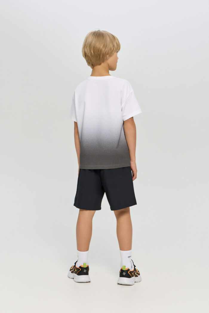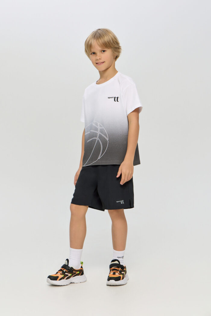 Sports T-shirt with a print for boys is ideal for any active games. The loose fit does not restrict movement. The model is ideal for both training and everyday use. The T-shirt is decorated with a stylish print on a white background, which adds brightness and personality.