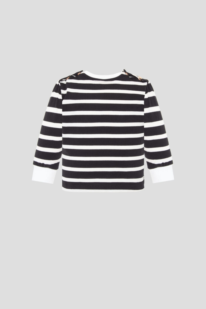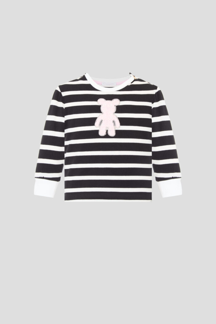This jumper for girls will become an indispensable element of the wardrobe. Made from natural, breathable cotton, it does not cause skin irritation, which is especially important for children. The striped print gives a playful and fashionable look. The cute bear decor adds a touch of charm. The loose fit does not restrict movement. The Comfortable cuffs on the sleeves keep the jumper securely in place. The Buttons on the shoulder pads make changing clothes much easier. This jumper will be an ideal choice for outdoor walks. The model perfectly combines with various clothes.