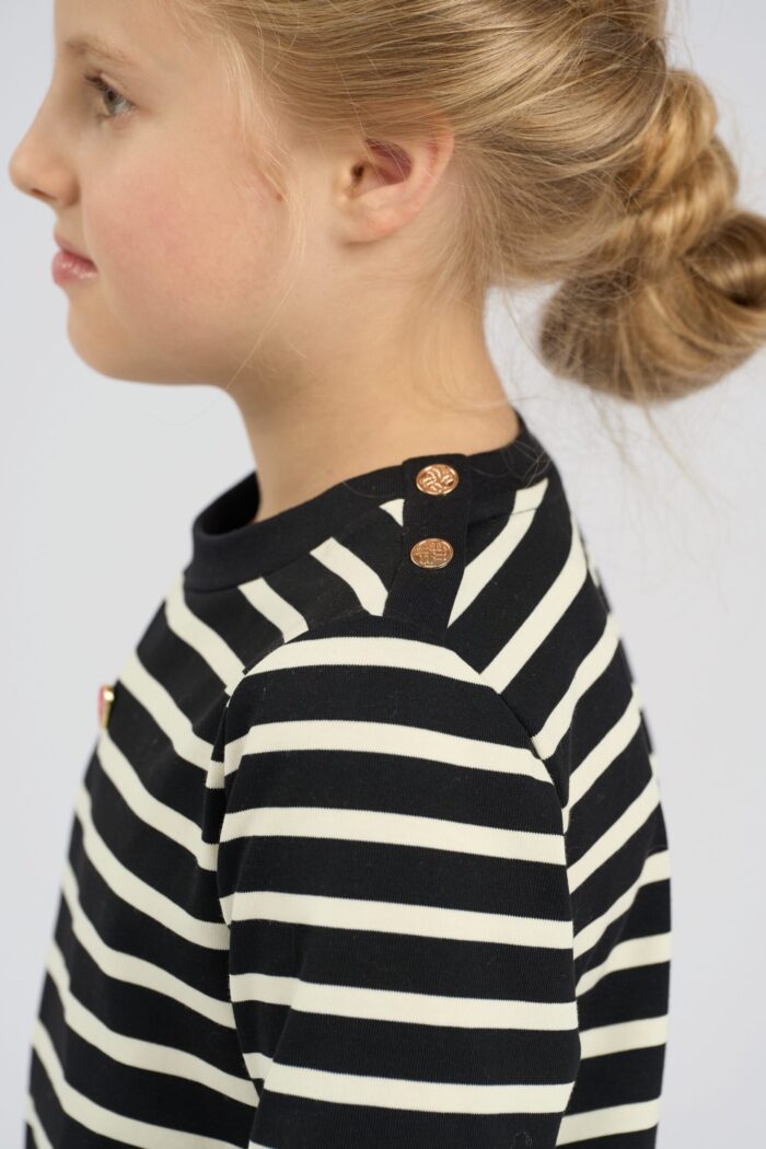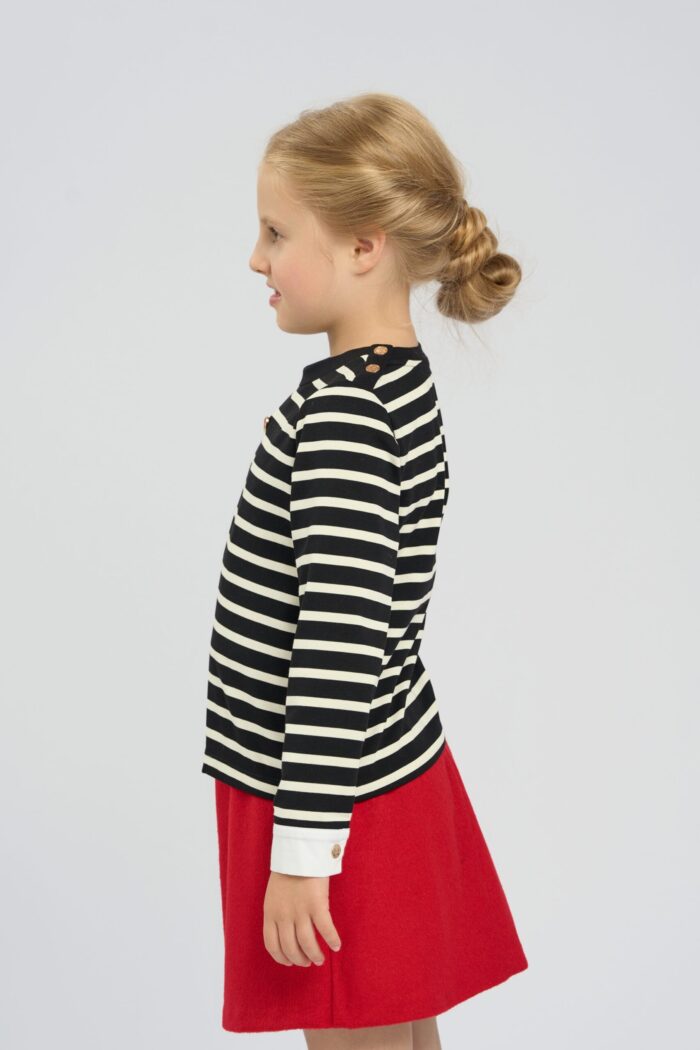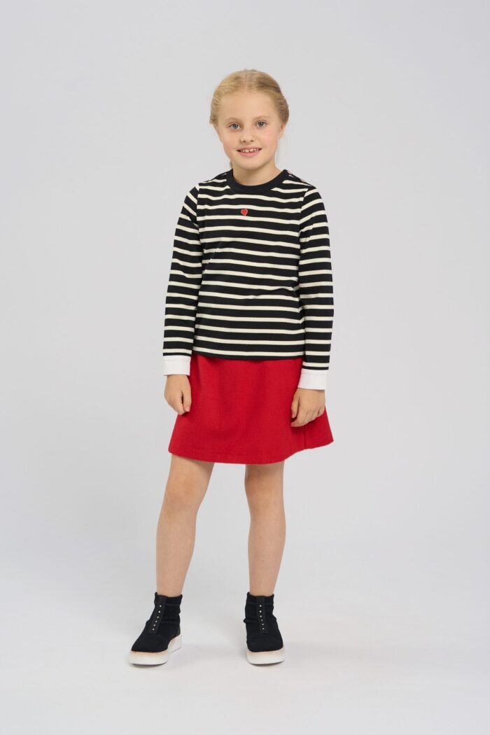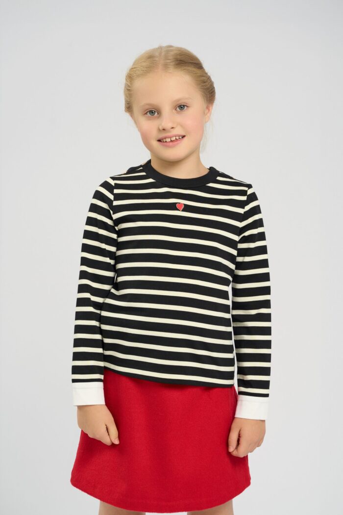 The striped jumper for a girl is made of cotton. There is a small heart on the top, which adds a cute accent. The round neck provides a comfortable fit, making the jumper easy to put on and take off. The straight silhouette ensures freedom of movement. Soft and breathable cotton ensures your child’s comfort all day long.