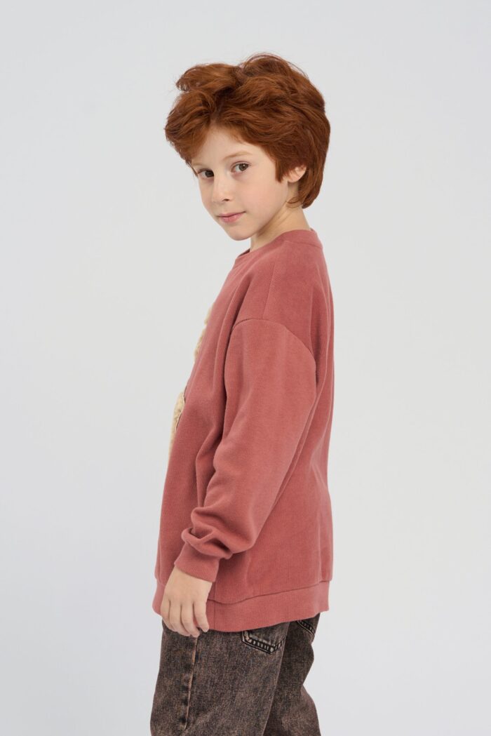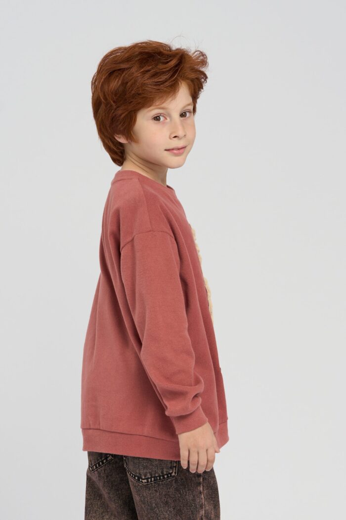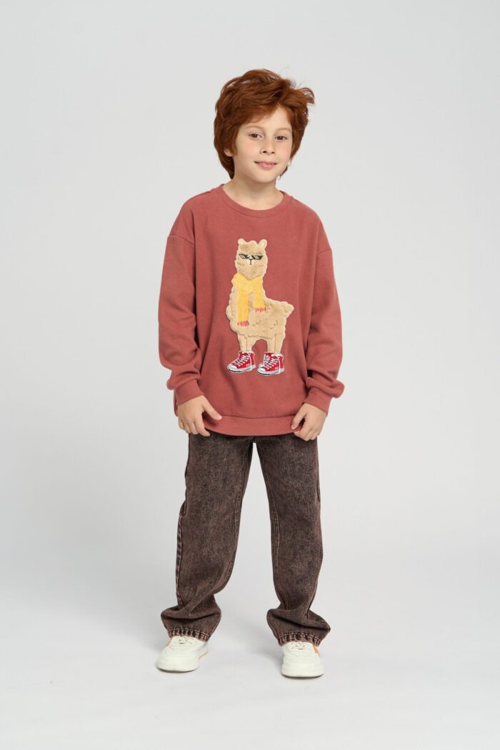 The sweatshirt for boy is made in a stylish and memorable design. The textured centre element in the form of a funny alpaca character immediately attracts attention. Maximum comfort for the child is provided by knitted cuffs and elasticated bottom design. Natural cotton is a safe material that does not cause irritation on the skin, has excellent breathability and provides maximum comfort. The chocolate colour of the sweatshirt will harmoniously combine with any bottom.
