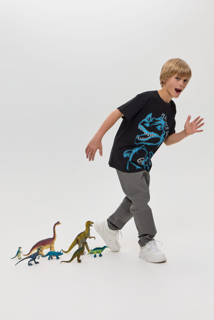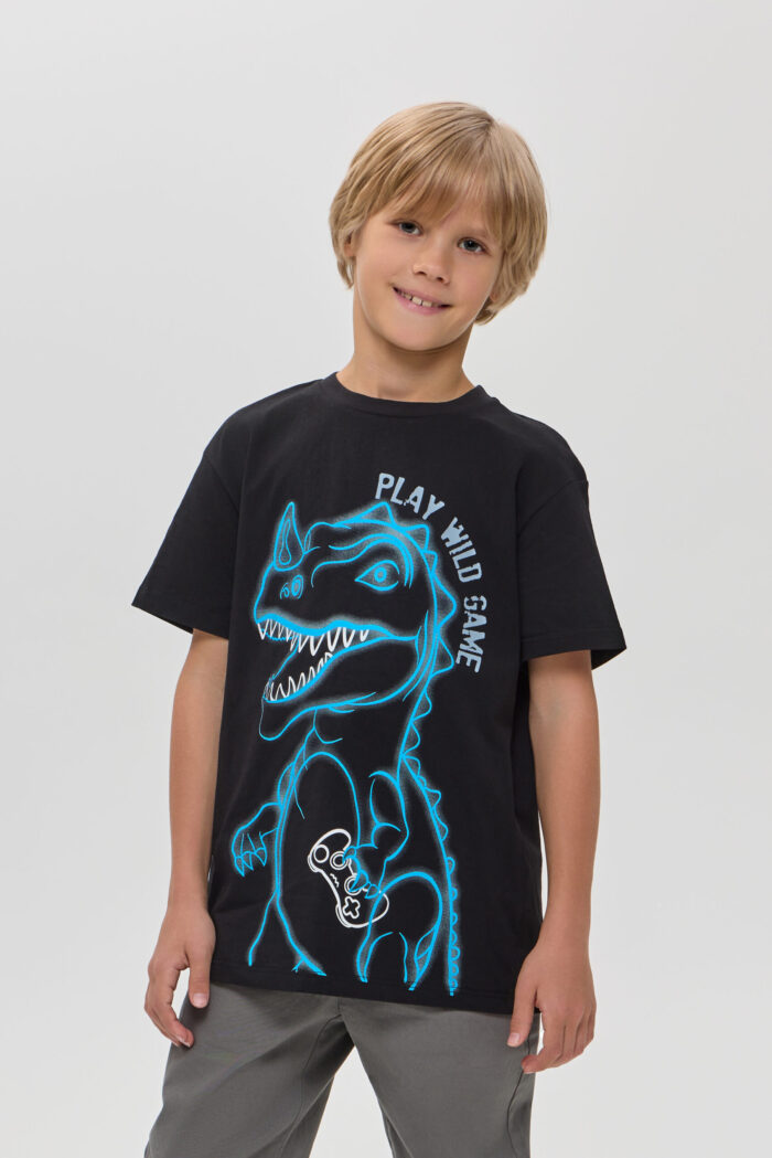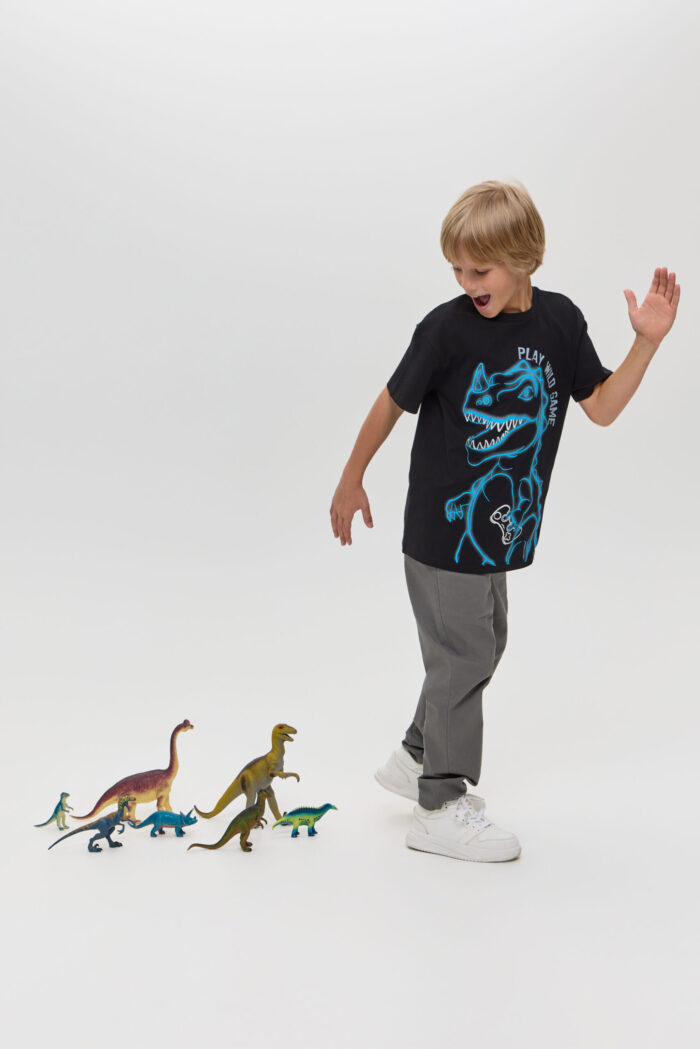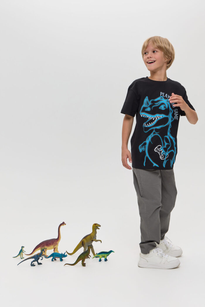 Black children’s T-shirt with a dinosaur print will be a real hit in a boy’s wardrobe! The model is made of soft and pleasant to the touch material. The T-shirt has a classic fit with short sleeves, which makes it comfortable for everyday wear. The vivid dinosaur print on the chest will attract attention and delight little fans of these ancient animals. This wardrobe item can be perfectly combined with jeans, shorts or sports pants, allowing your child to look stylish and fashionable in any situation.