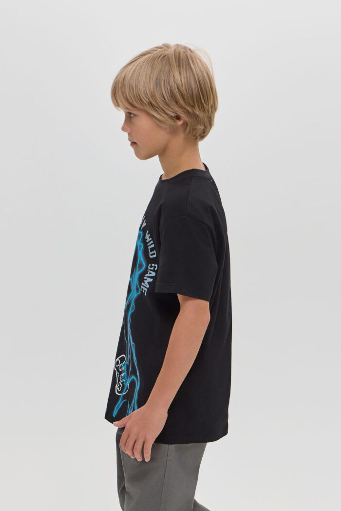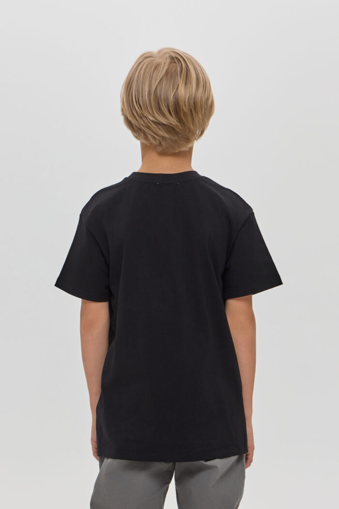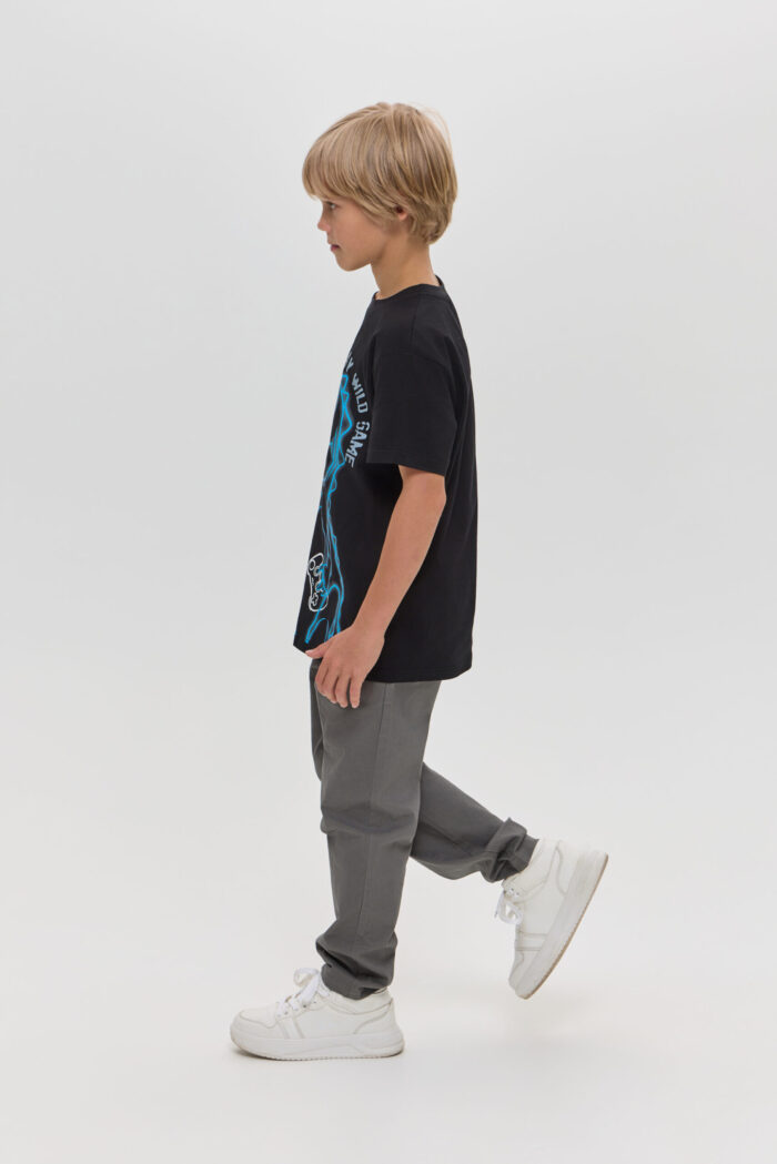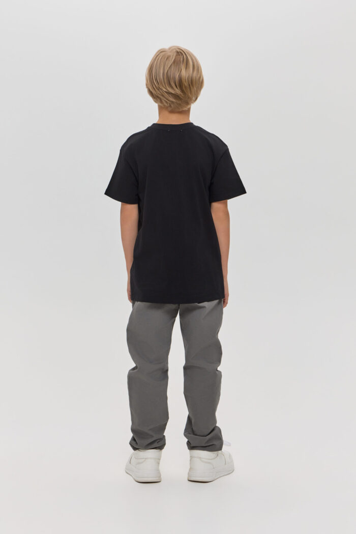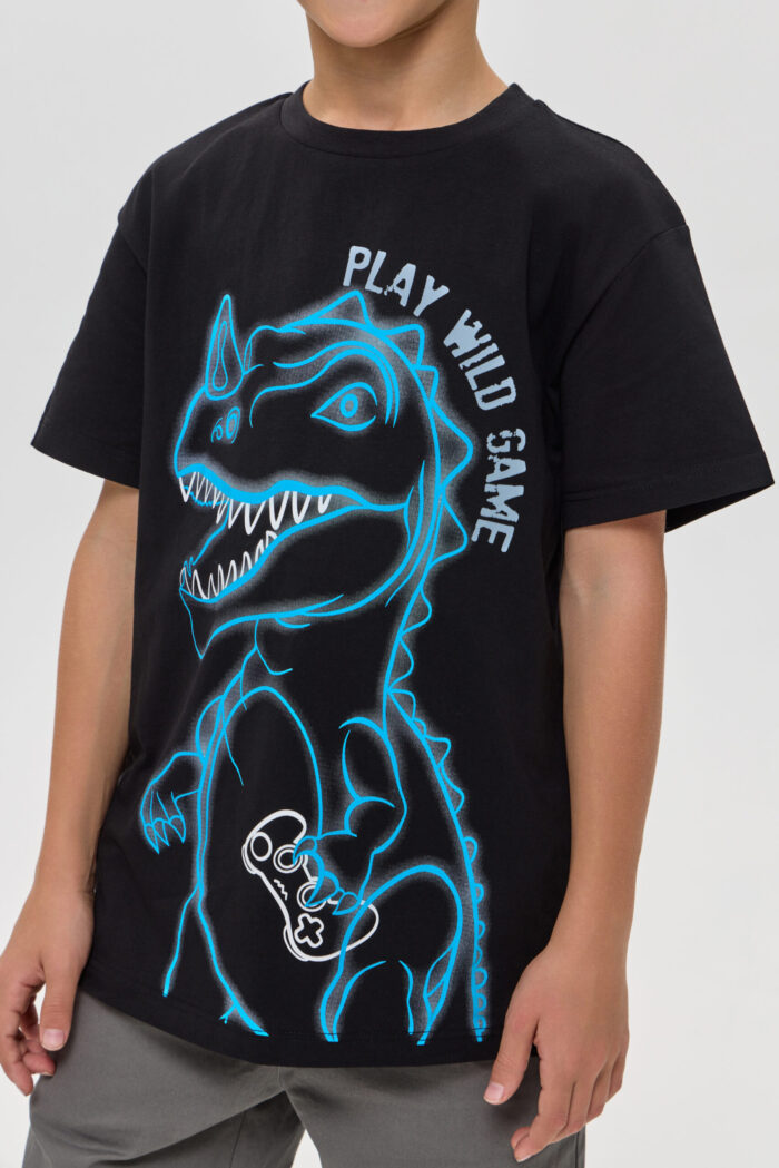 Black children’s T-shirt with a dinosaur print will be a real hit in a boy’s wardrobe! The model is made of soft and pleasant to the touch material. The T-shirt has a classic fit with short sleeves, which makes it comfortable for everyday wear. The vivid dinosaur print on the chest will attract attention and delight little fans of these ancient animals. This wardrobe item can be perfectly combined with jeans, shorts or sports pants, allowing your child to look stylish and fashionable in any situation.