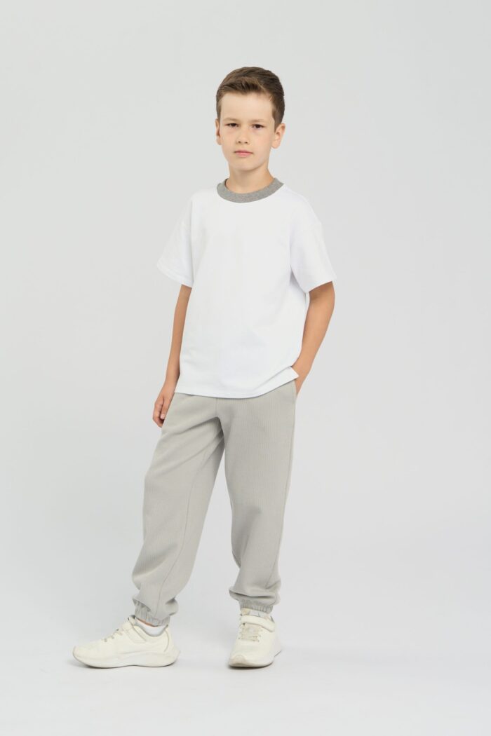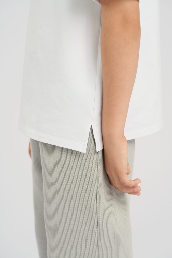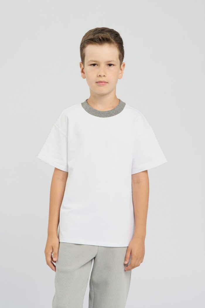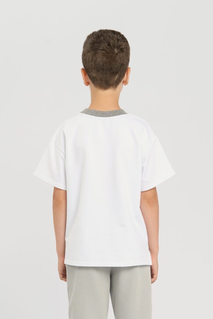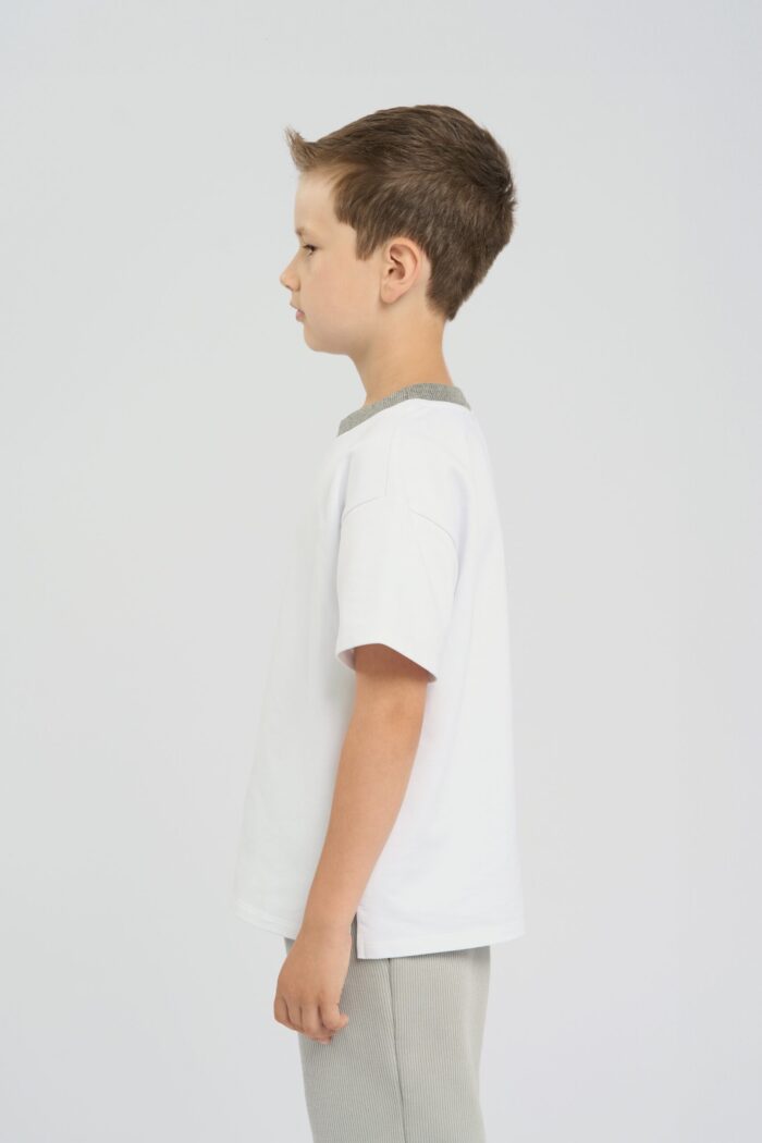 This white coloured T-shirt for boys is the perfect choice for a casual wardrobe. The dropped shoulder line gives it a relaxed and fashionable look. The contrasting round neckline trim adds a colourful accent and makes the T-shirt stylish. Lightweight and breathable cotton provides comfort. The model goes well with shorts, jeans or pants. It is ideal for everyday wear and for outdoor activities.