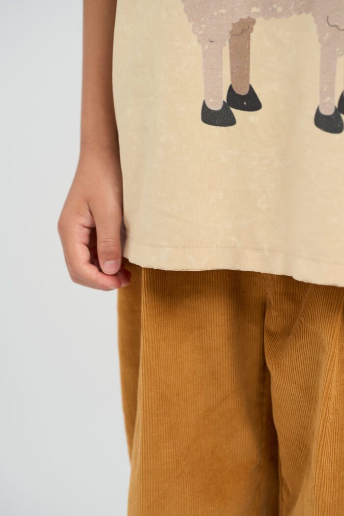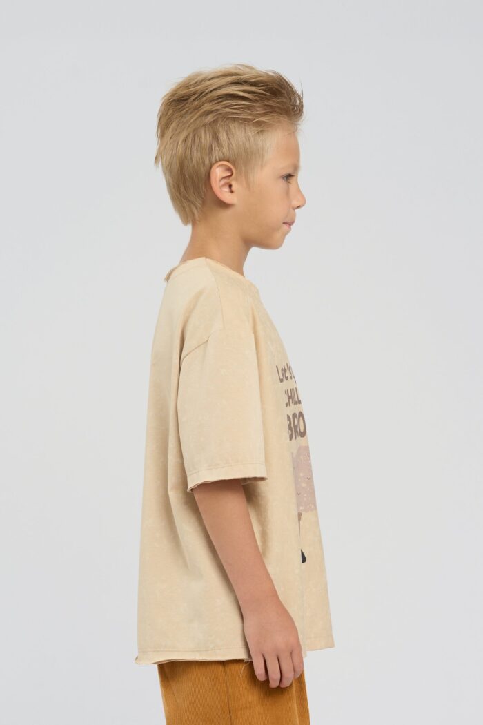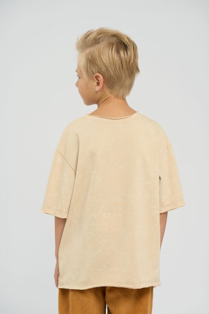 T-shirt for boy is made in universal beige shade and decorated with a funny alpaca print. The model of comfortable straight silhouette with round neckline and short sleeves. Raw edges give the look a rebelliousness. The non-uniform colouring of the fabric contributes to it. The natural cotton-based fabric is highly breathable and guarantees maximum comfort for your child.
