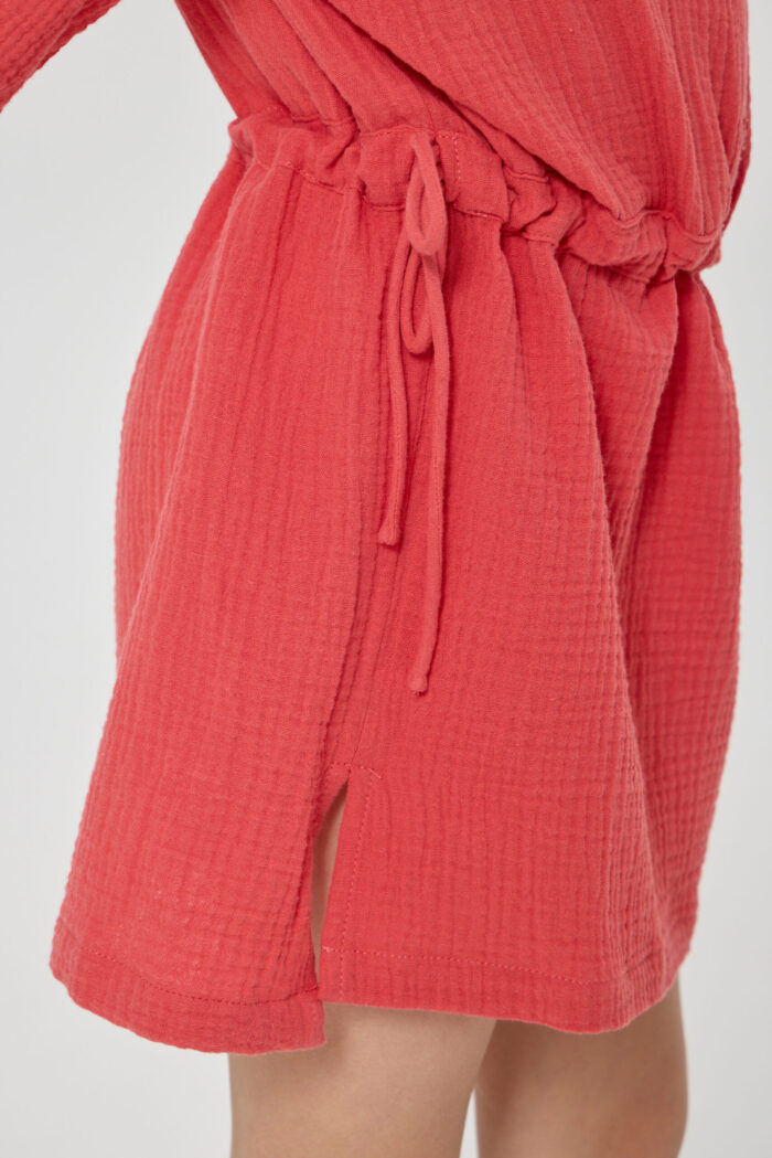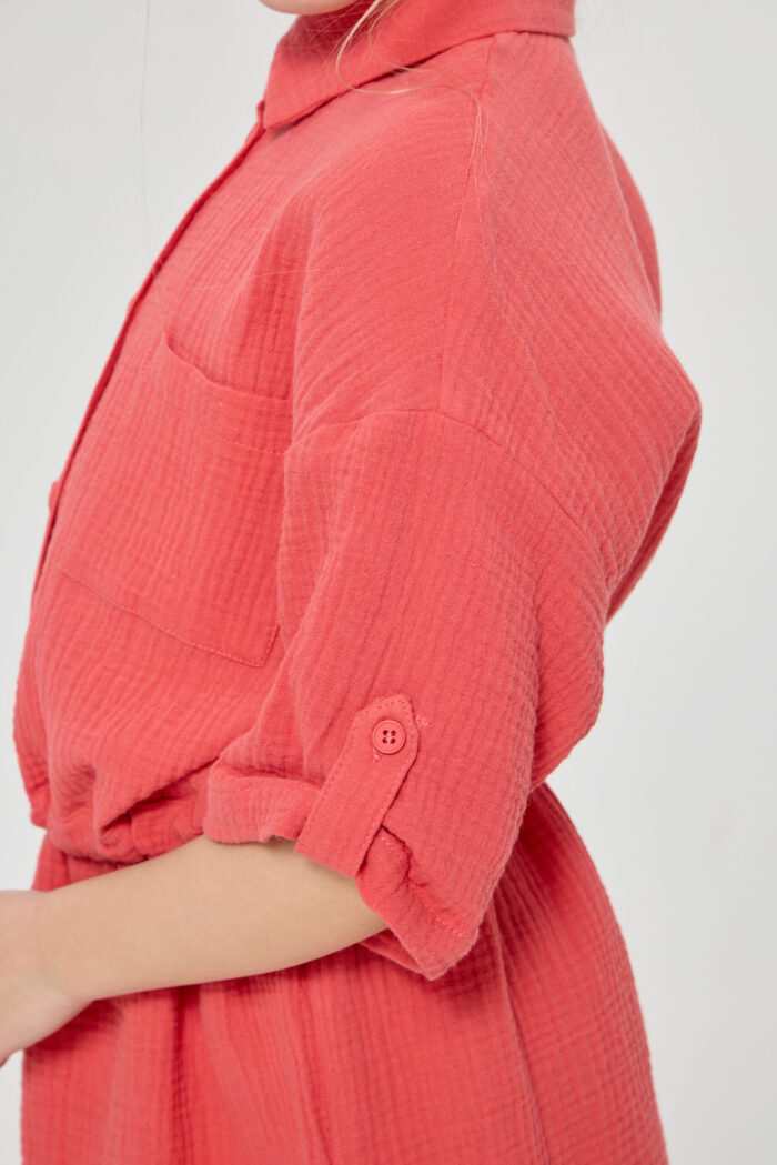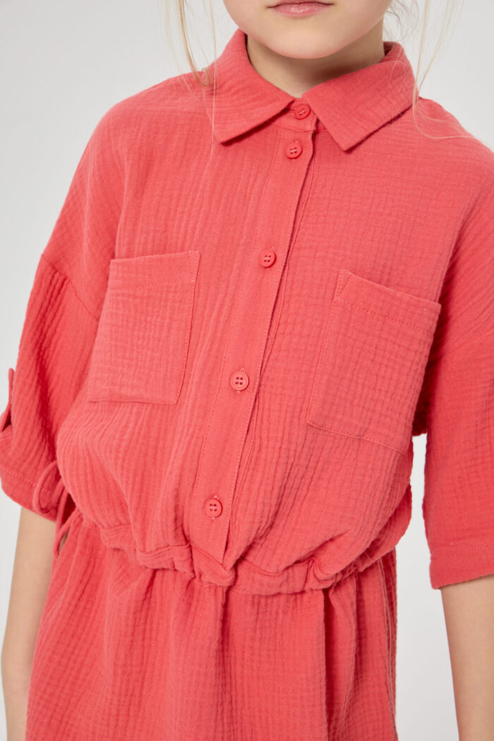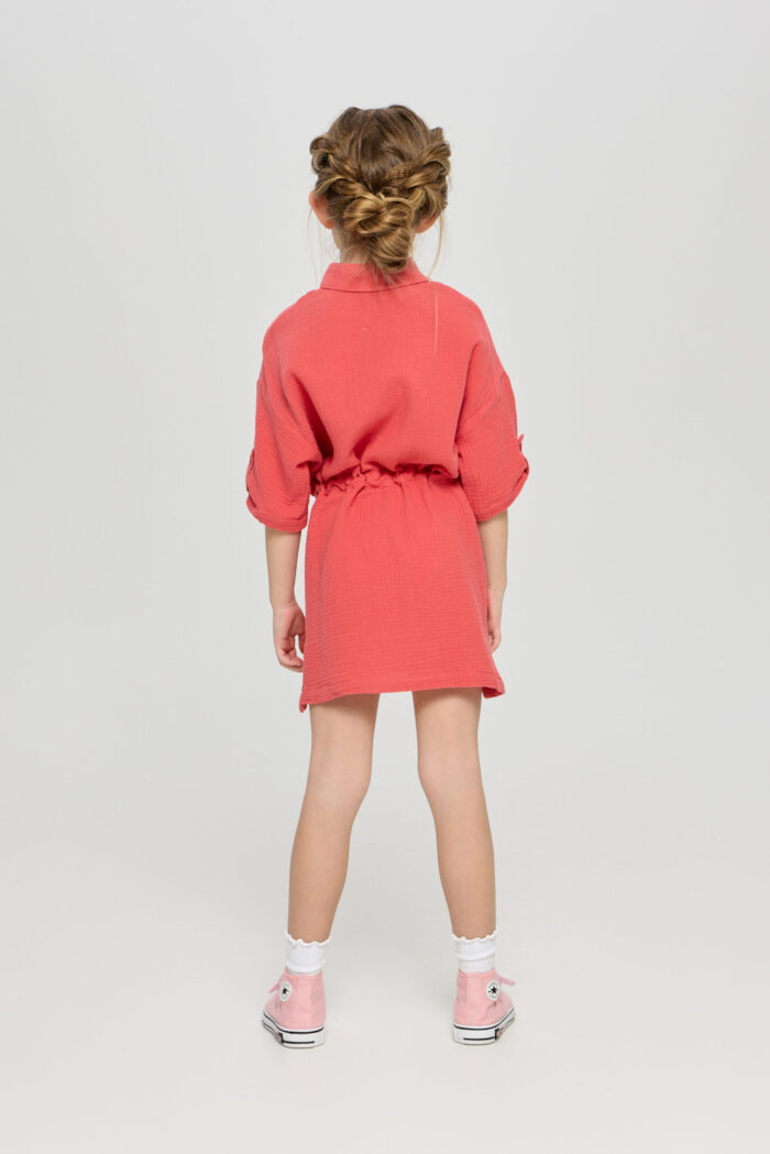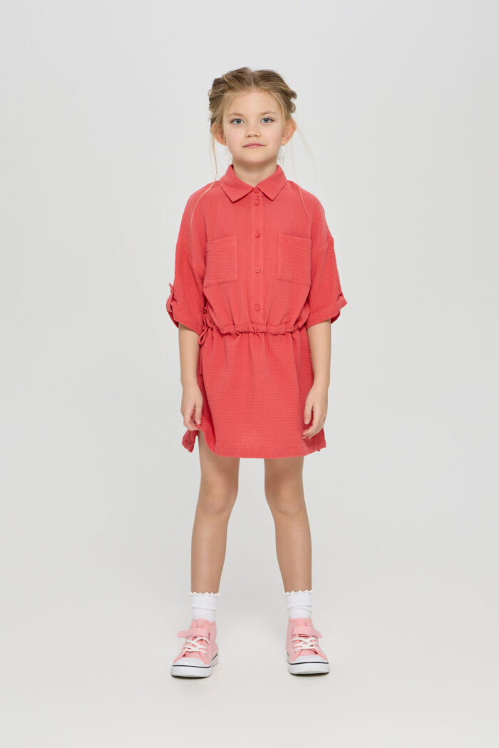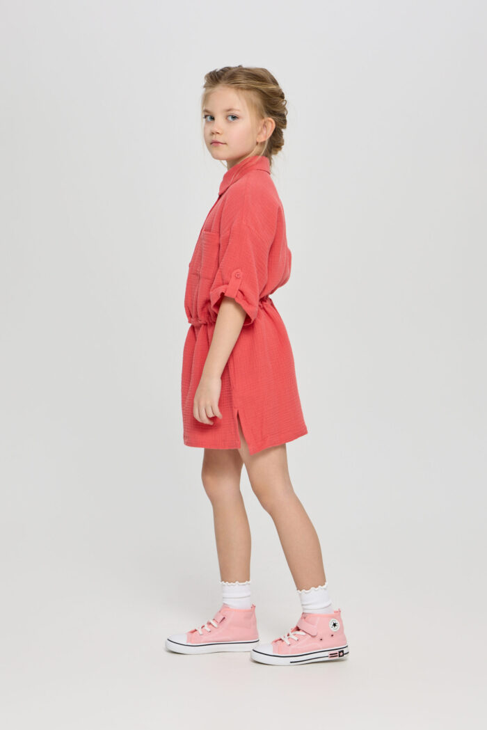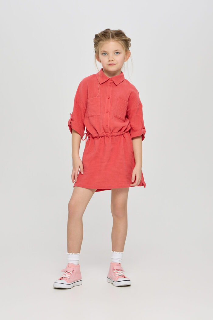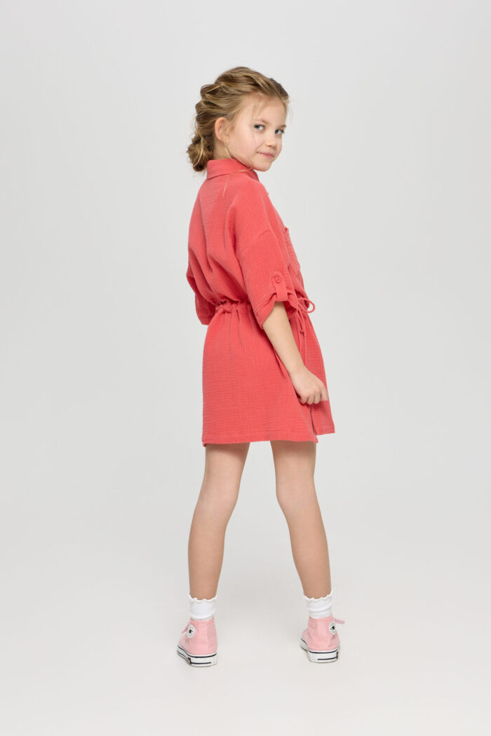 Tunic dress for girls is a combination of comfort and style in one product. The comfortable belt allows you to adjust the volume of the dress. It adds the possibility to adjust the product to individual features of the figure. The button fastening adds convenience in use, as well as being an interesting design detail. Adjustable sleeves allow you to adapt the outfit to different weather conditions and create different looks. Patch pockets on the chest add a stylish accent to the design of the dress. The model is made of lightweight and breathable material, making it ideal for summer weather.
