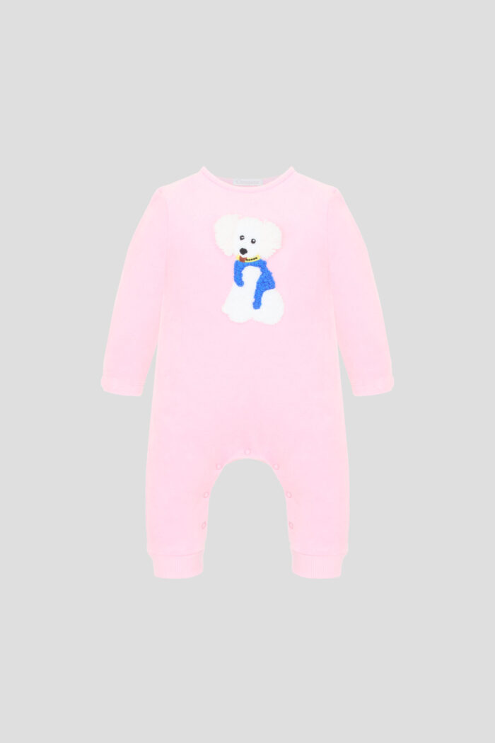This pink velour overalls with voluminous decoration in the form of a cute puppy will become a favourite in children’s wardrobe. The model with button fastening is made of natural cotton. The overalls are ideal for walking in dry weather or for home use. Soft velour and a fun patch make this jumpsuit comfortable and interesting for baby girl.