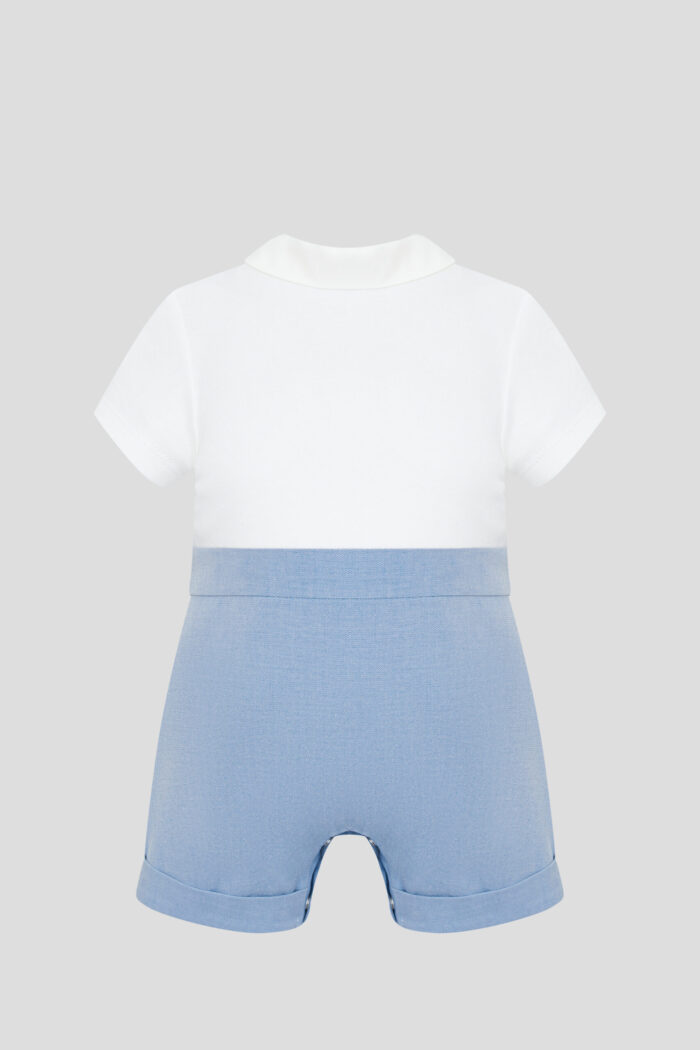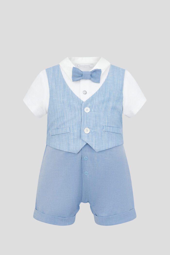 Babies should be taught the rules of fashion etiquette from an early age; it fosters good taste. In addition, children often want to resemble their parents. This is a great suit for a boy! This stylish cotton-lined model is an imitation of a classic suit with waistcoat and trousers. This elegant blue-striped outfit with a white shirt looks beautiful and festive, perfect for a ceremony.