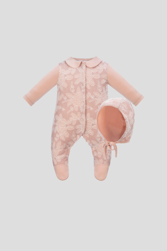 White and powdery voluminous embroidery smart set, consisting of overall and bonnet is a perfect clothing item for your little girl!