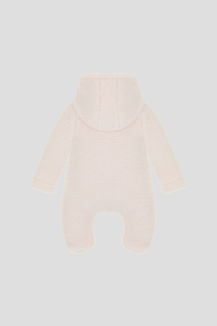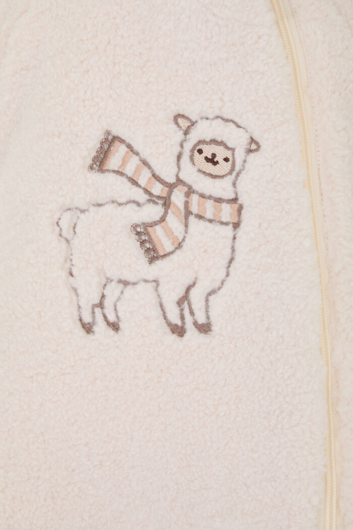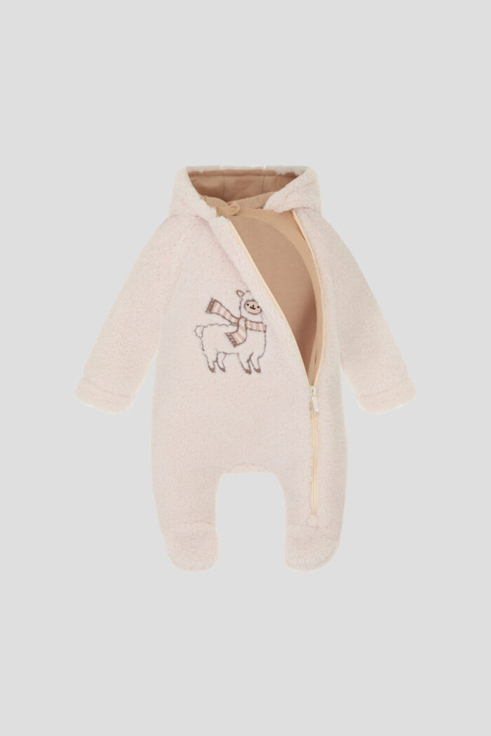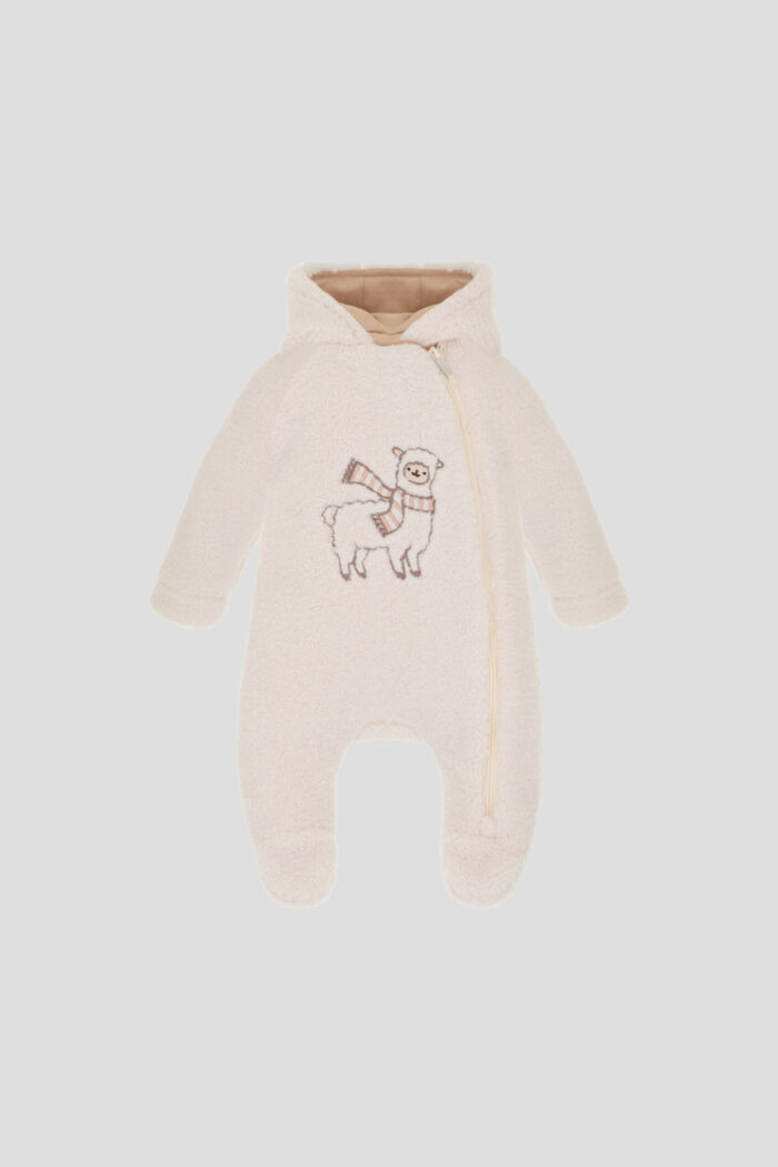 Warm overalls made of faux fur has a funny embroidered alpaca pattern. The comfortable loose silhouette is fastened with a long zip. The hood serves as a reliable head protection from the wind. The button fastening under the collar allows you to fully protect your child from the cold. The natural cotton lining maintains an optimal temperature inside the overalls and prevents overheating.